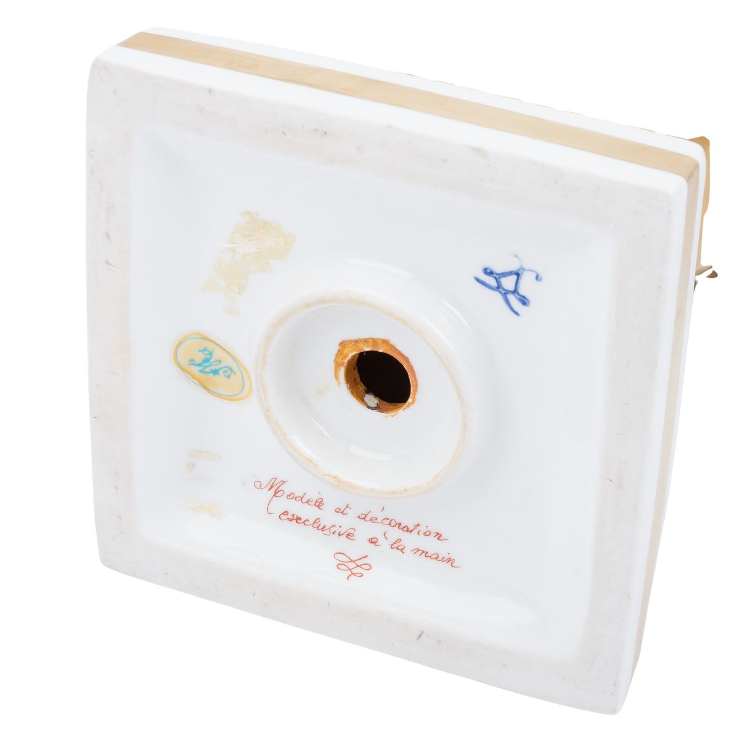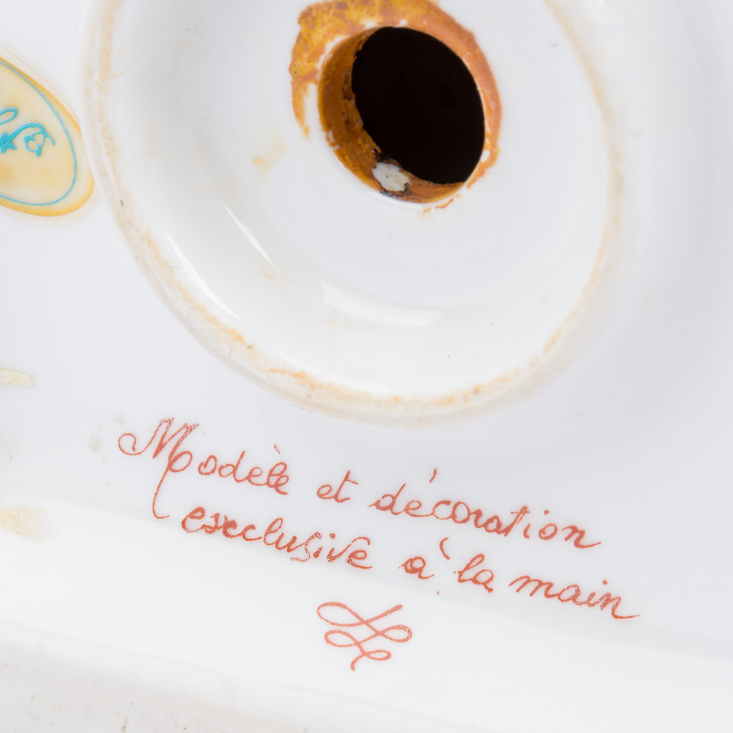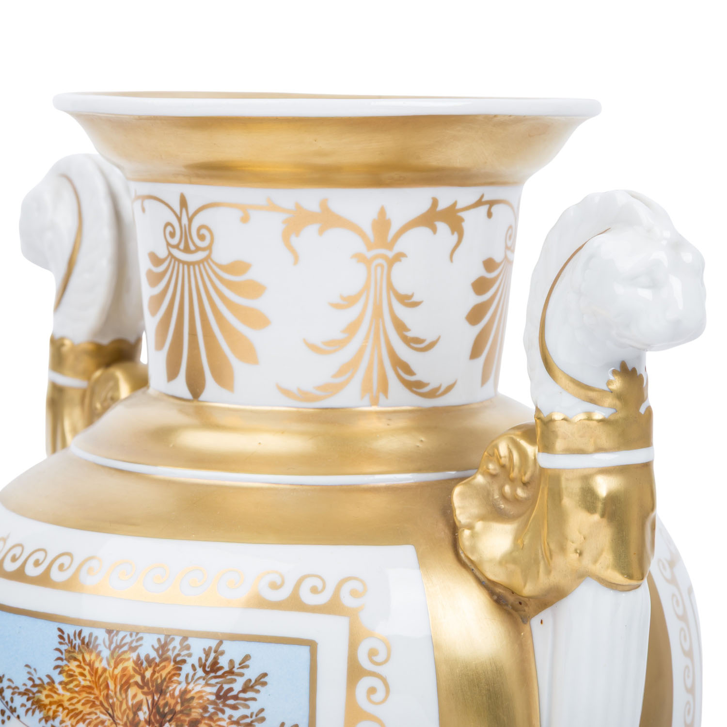 Sèvres style amphora vase, 20th century, baluster-shaped vase with a round base mounted on a square plinth, the front decorated with a landscape and floral bouquet, the side handles in the shape of lion heads, richly gilded (partially rubbed). The cap/screw is missing, creating a hole in the base. The blue mark bears the addition 'Model and decoration exclusive to the main' in red lettering. H 39.5 cm. Signs of age.