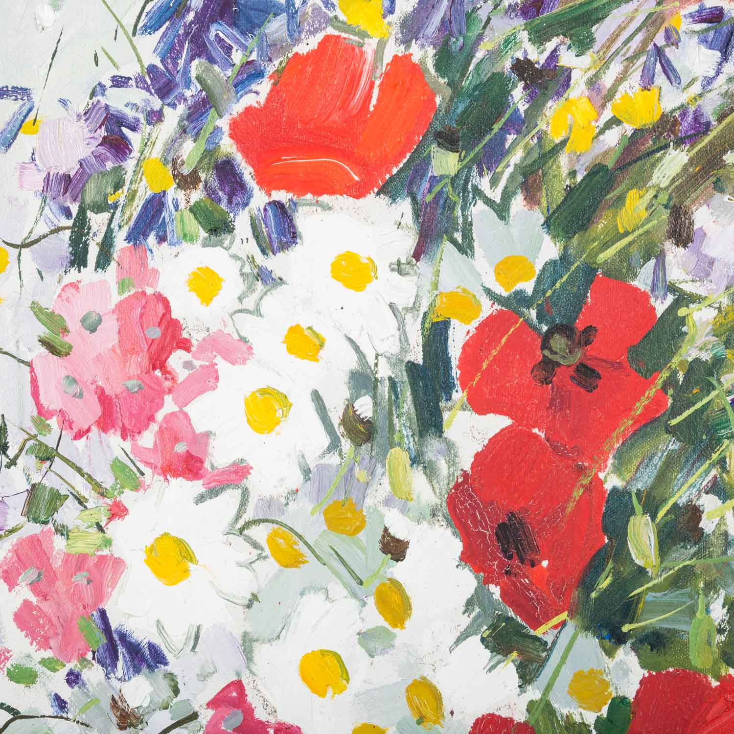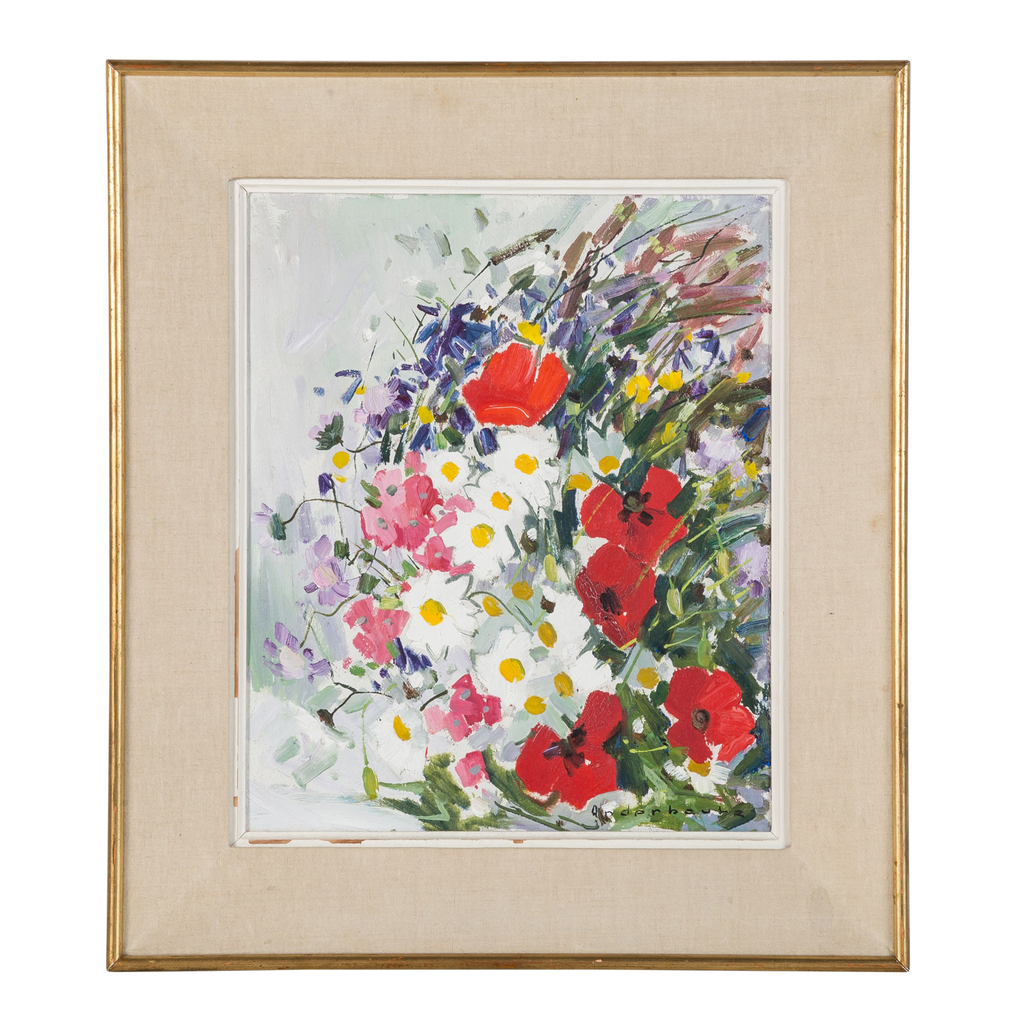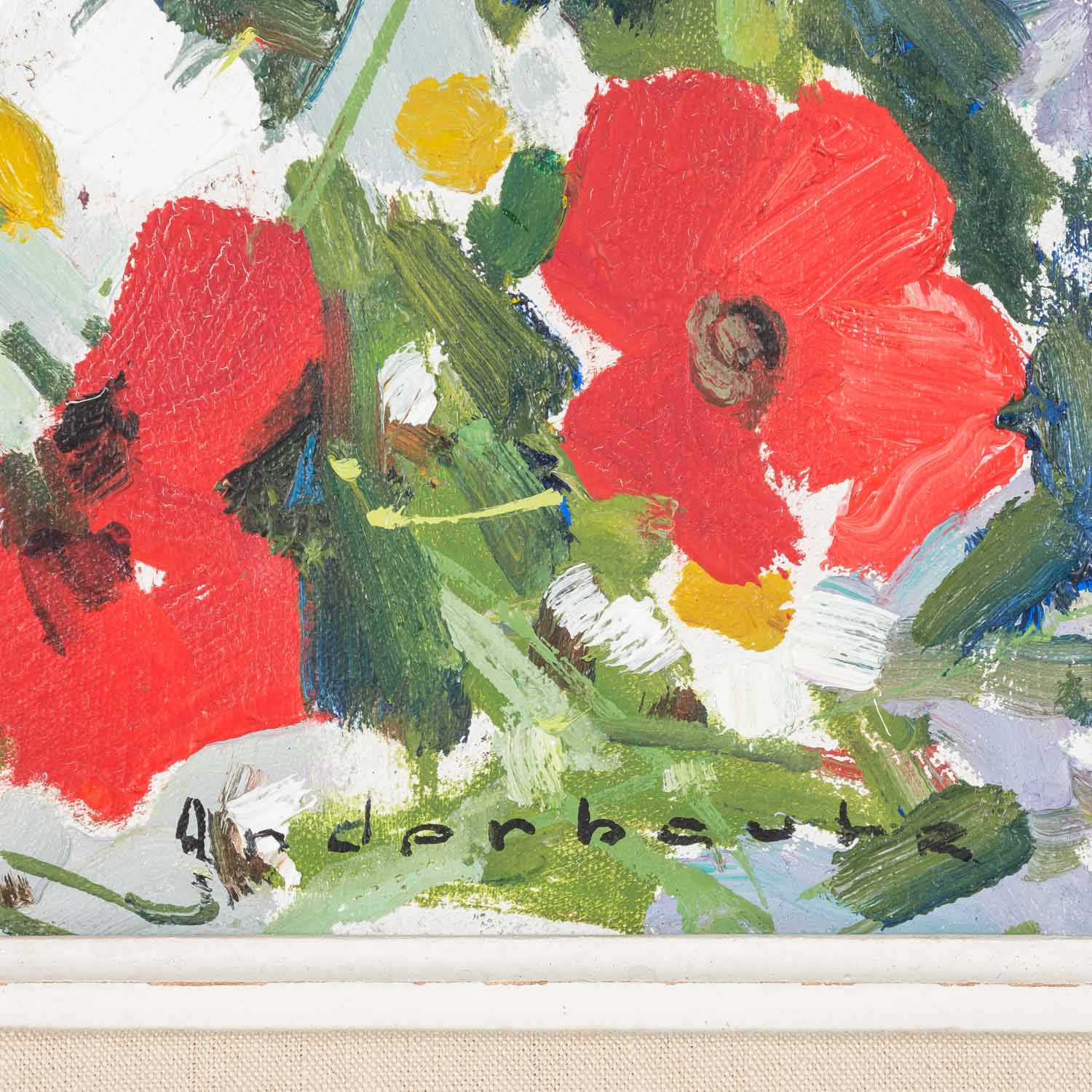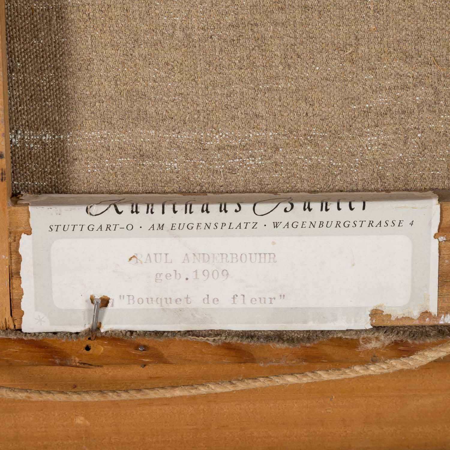 ANDERBOUHR, PAUL-JEAN (1909-2006), 'Bouquet de fleur', Summer flowers, signed 'Anderbouhr', oil/canvas, HxW: 46x38 cm (64x56 cm with frame). Slight signs of age and craquelé. With frame (edges partially damaged). VERSO label Kunsthaus Bühler, Stuttgart with inscription.