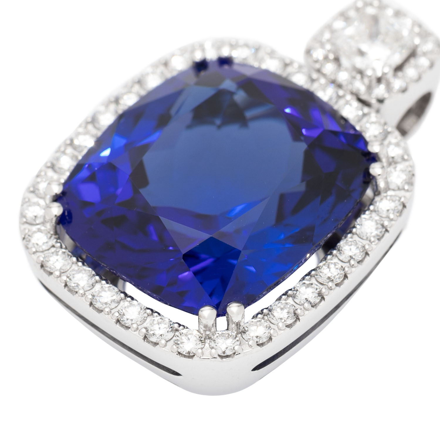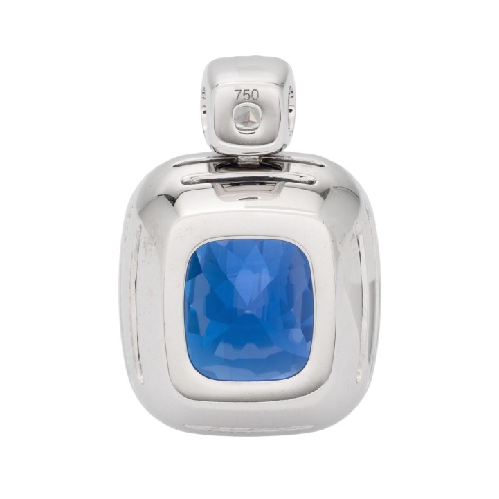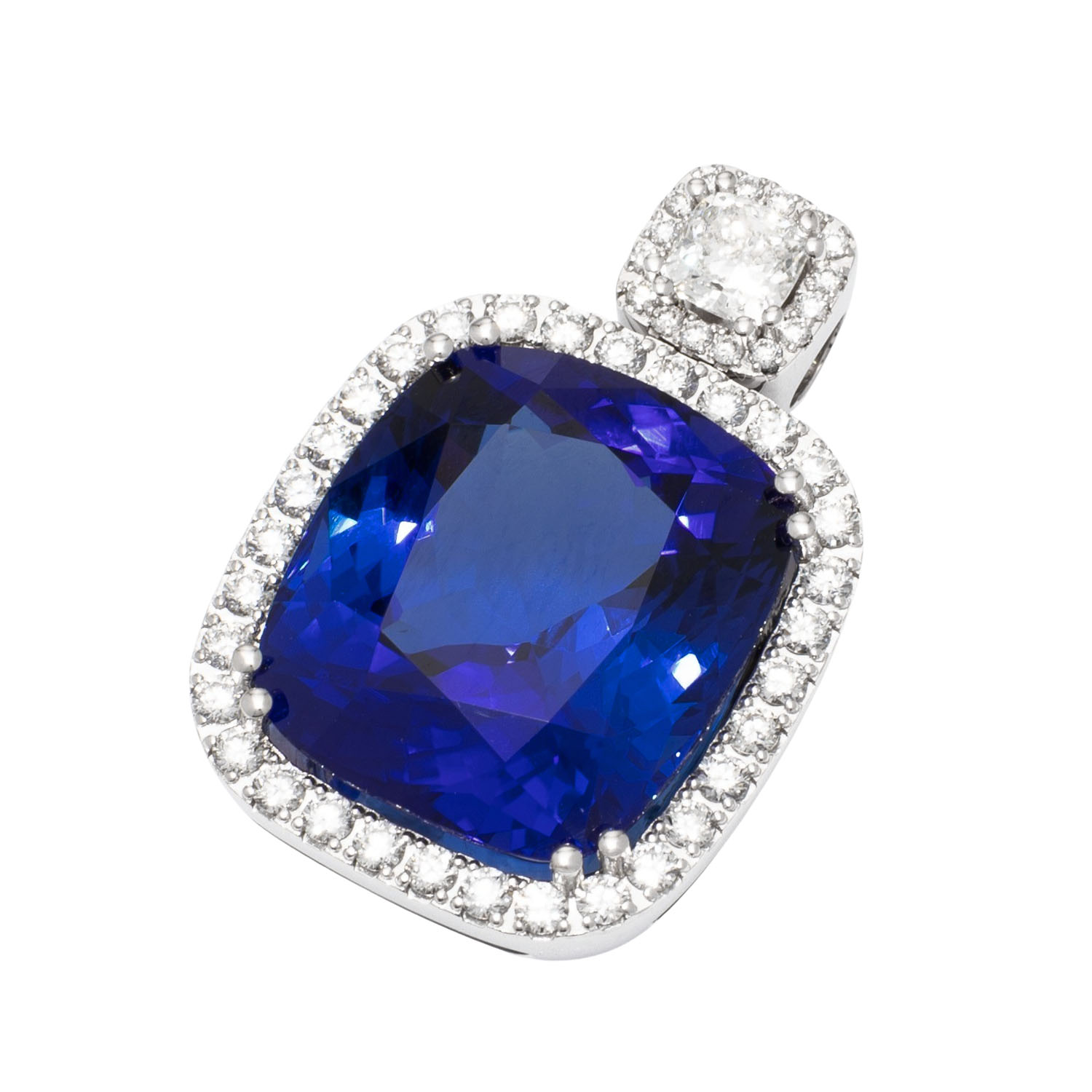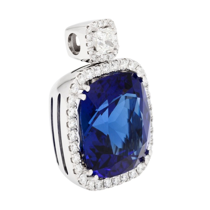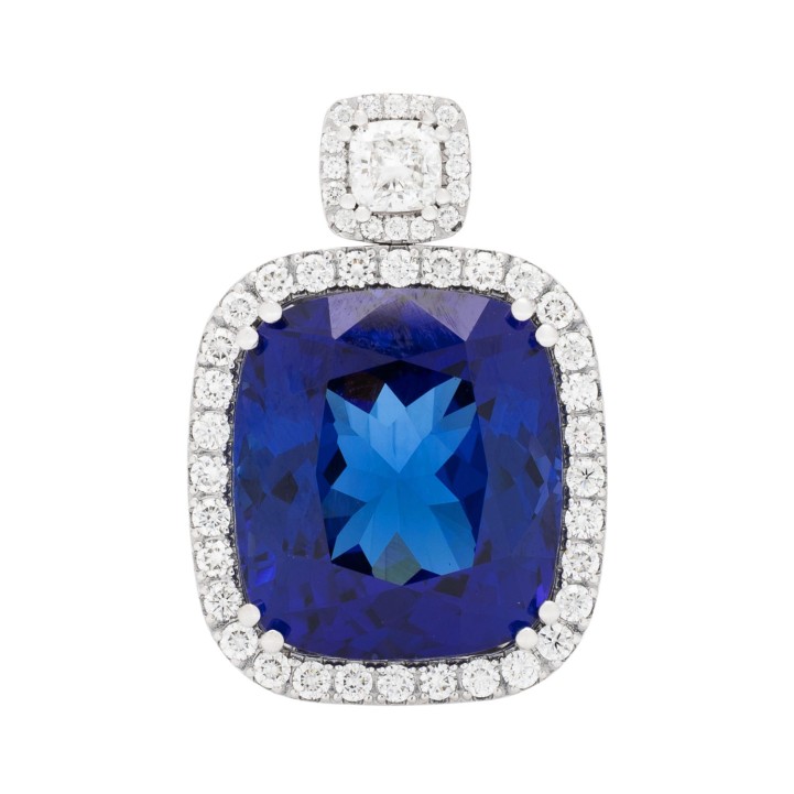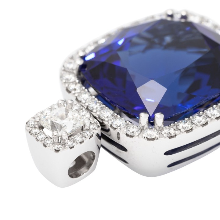 Pendant with a vivid tanzanite 26,52 ct a. 1 diam.-cushion cut 0,56 ct. G/IF (GIA 2527819887) a. 48 brill cut diam. tot. 1,01 ct. G/SI. WG 18 K, 17,94 g. High jewerly craftsmenship.