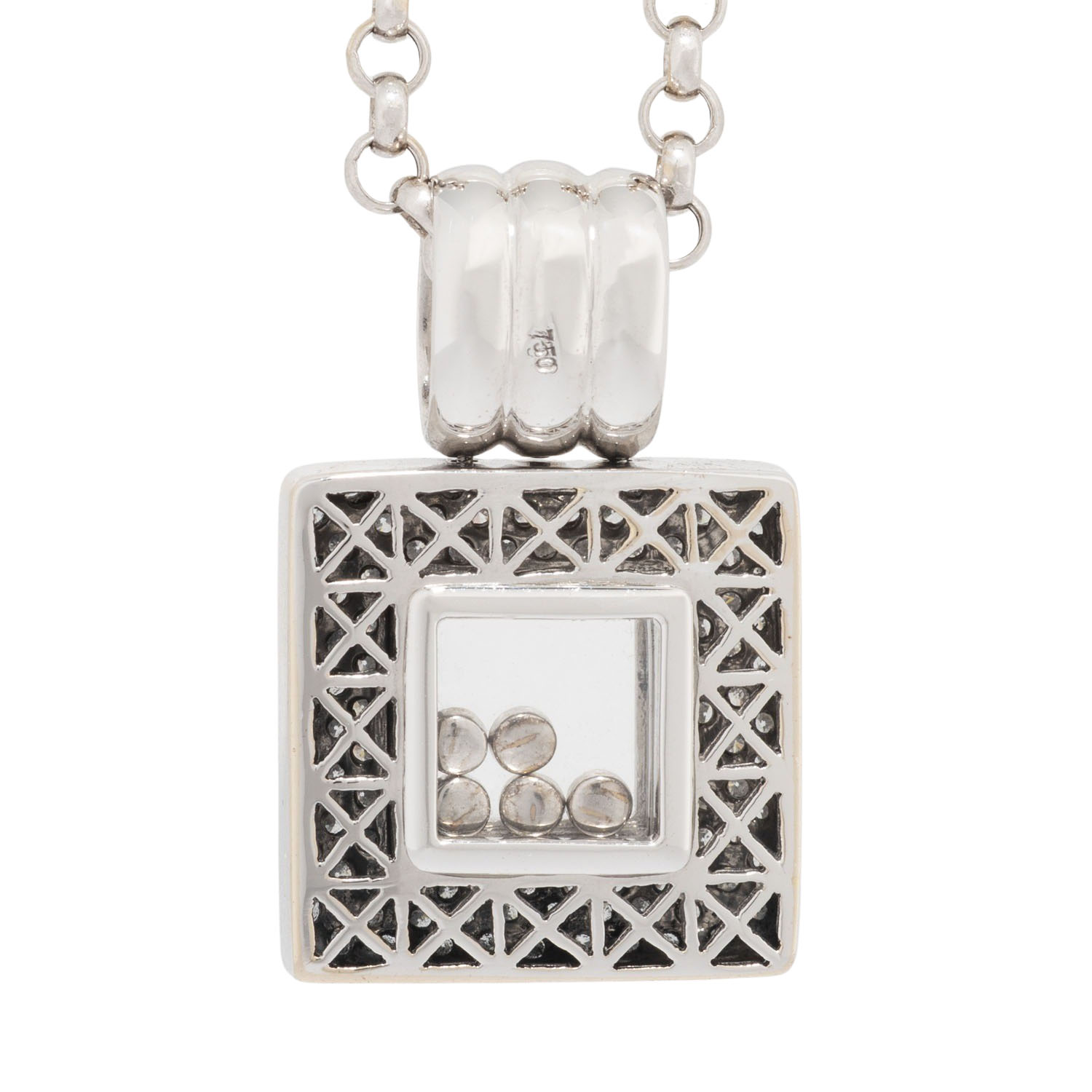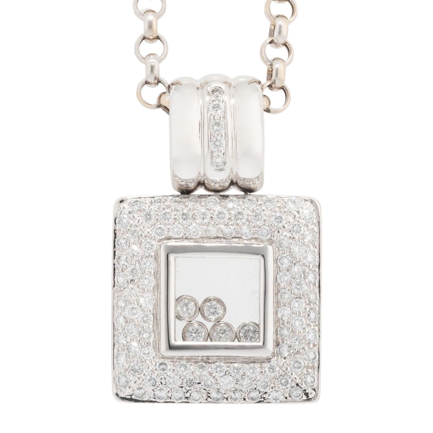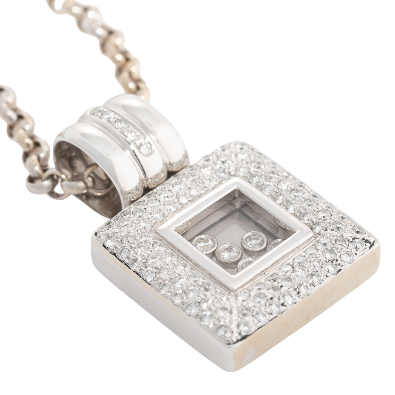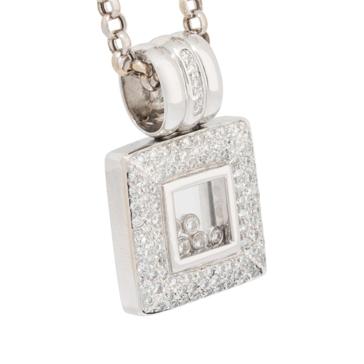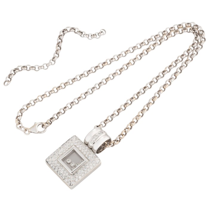 Pendant with diamonds, Setting and 5 movable diamonds, totalling approx. 1,2 ct, good color and clarity, WG 18K, 24.4 g, with chain: L: approx. 42 cm, with extension: approx. 8 cm, 20th/21st century, minor signs of wear.