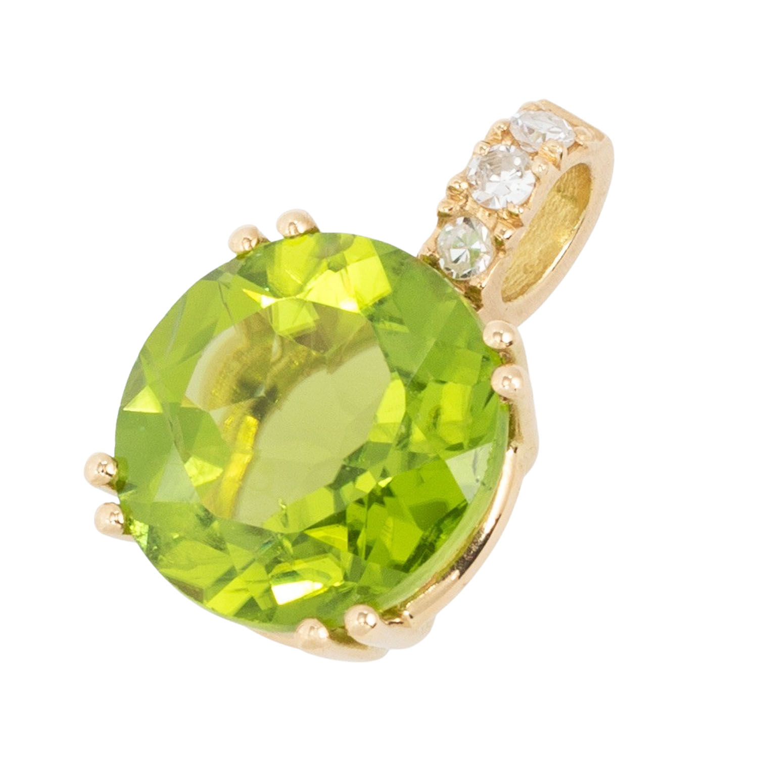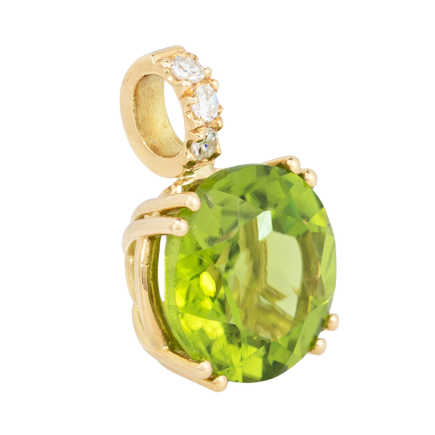 Pendant with peridot ca. 3.91 ct and 3 single-cut diamonds totalling 0.04 ct, RW (G)/VS, 18K gold, 2.1 g, L 15 mm, 21st century, mint condition.