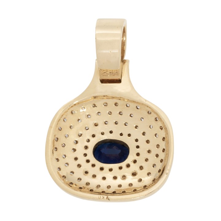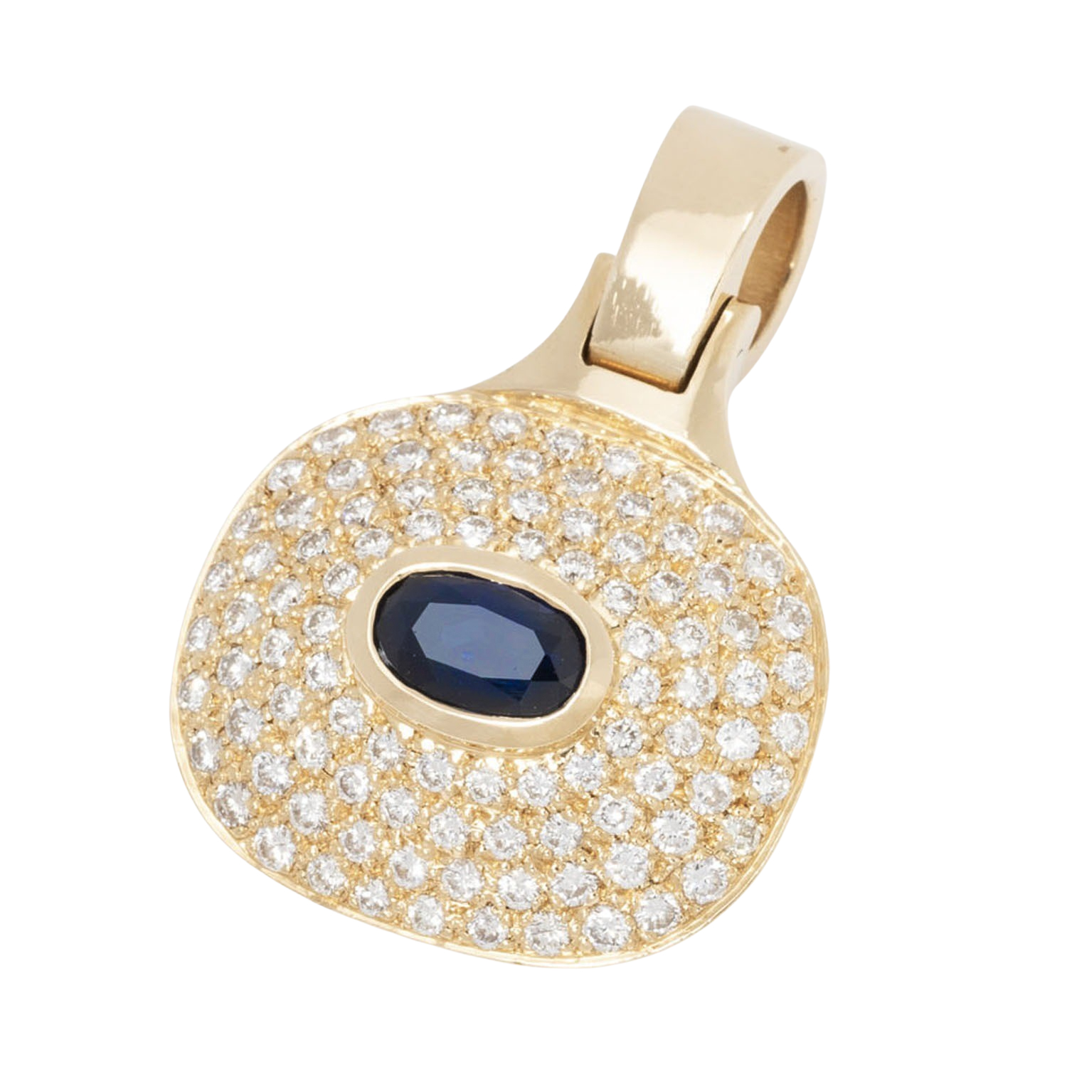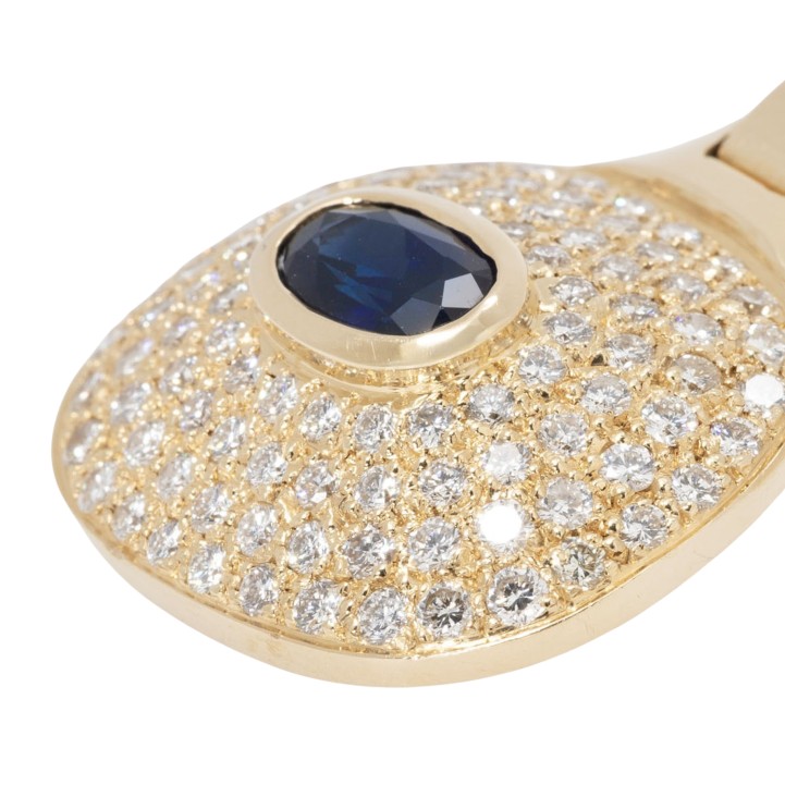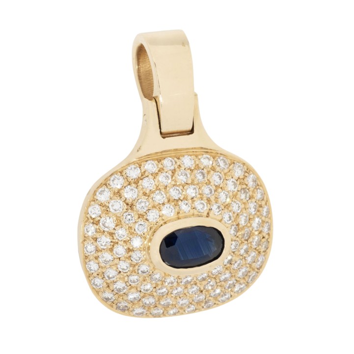 Pendant with sapphire ca. 1.7 ct and 96 brilliant-cut diamonds totalling 2.0ct, RW (G)/VS-SI, YG 18 K, 21 g, L x W 39 x 27 mm, 21st century, very good condition. Handcrafted.