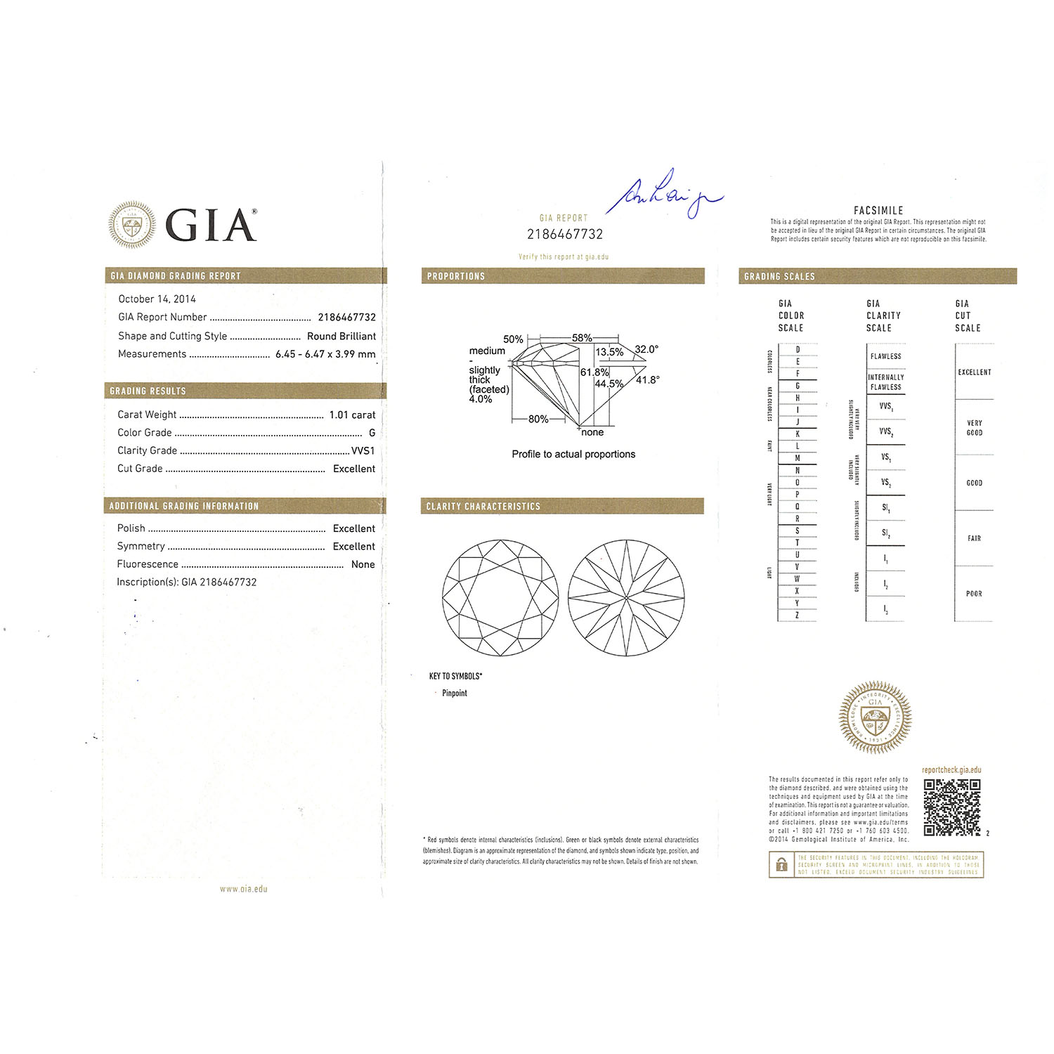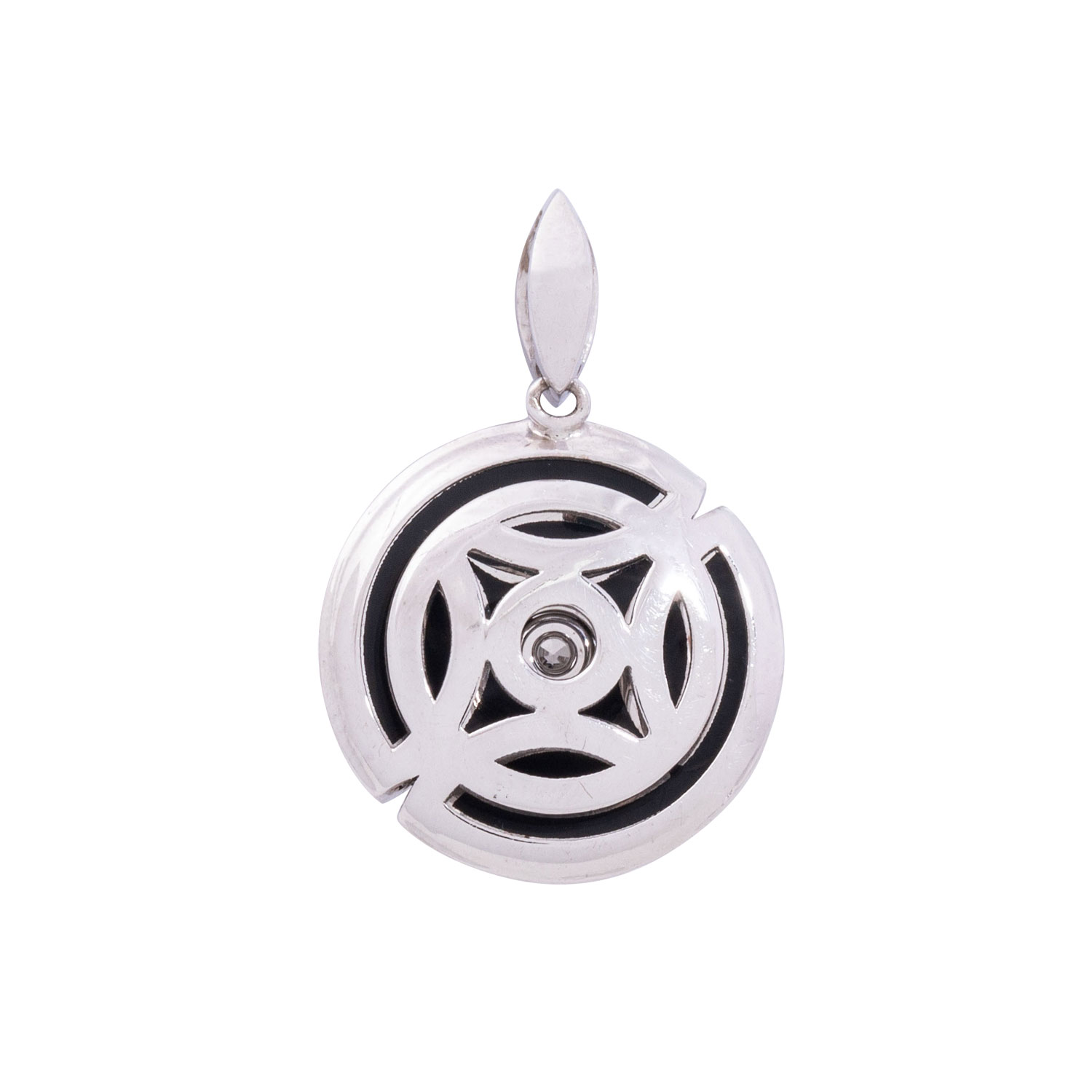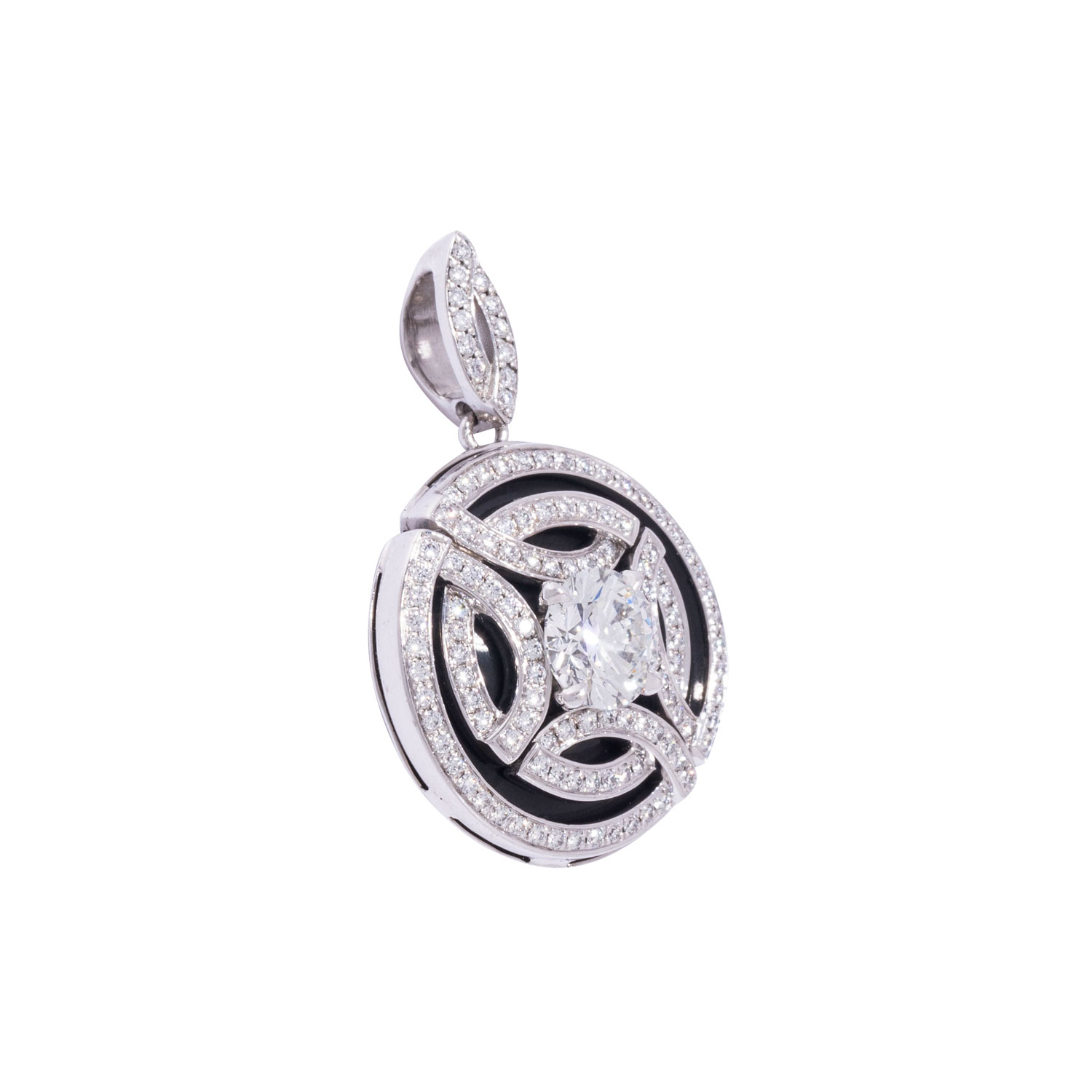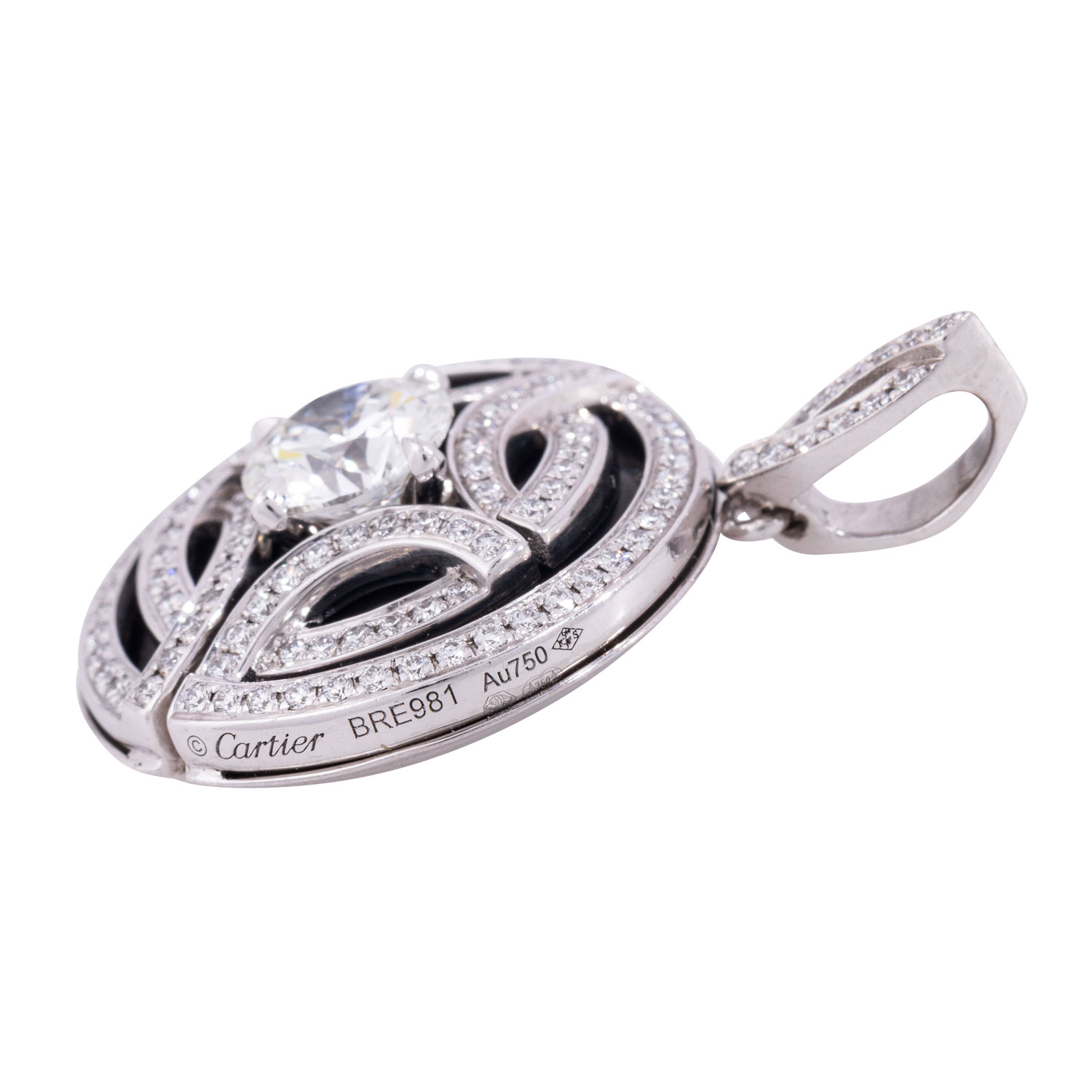 Pendant with central brilliant-cut diamond 1.01 ct and further 112 brilliant-cut diamonds totalling ca. 0.6 ct, these of very good colour and clearity, central brilliant-cut diamond with laser engraving GIA2186467732, band pattern underlaid with black lacquer, WG 18K, 10.9 g, 3x2 cm, 21st century, good condition, reworking from earring ‘Galanterie de CARTIER’, laterally with hallmark BRE981, enclosed printout GIA report 2186467732.