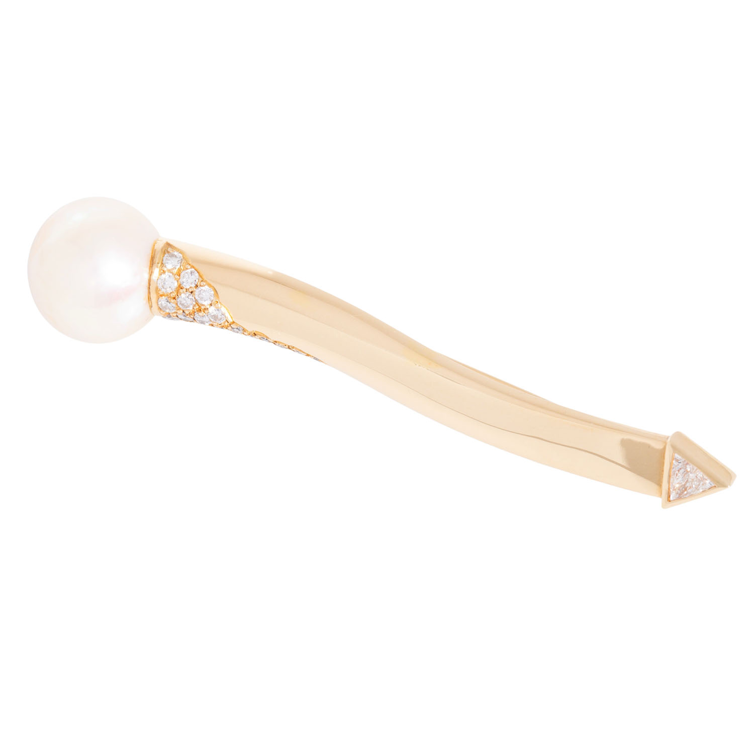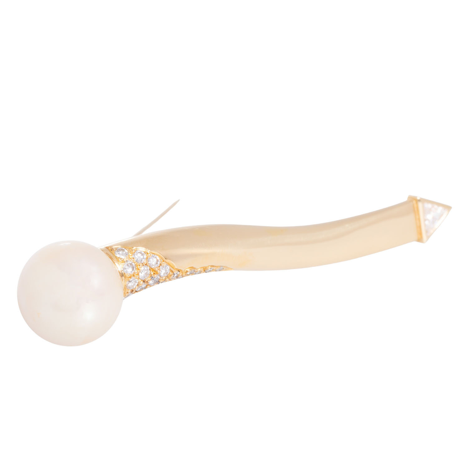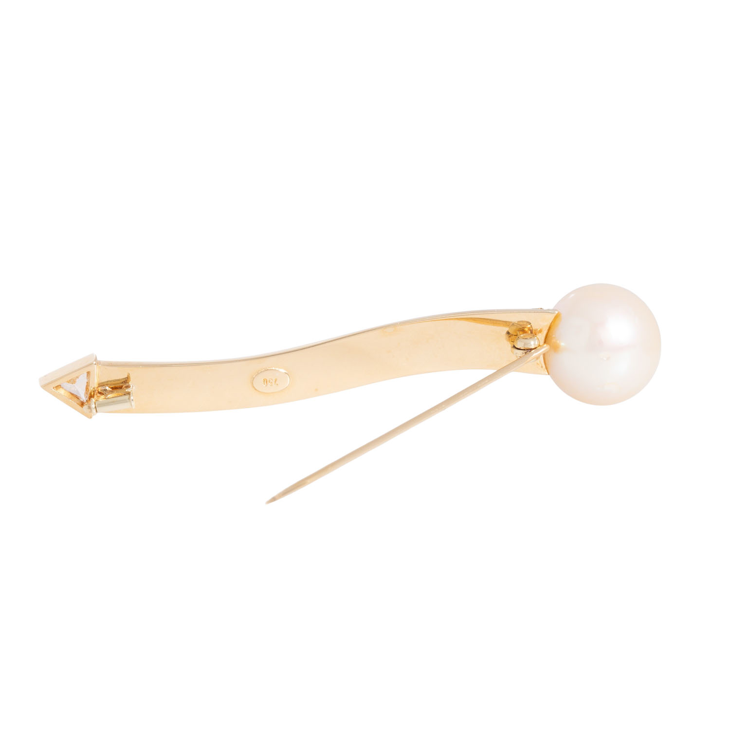 Brooch with large South Sea pearl of ca. 15.5 mm with beautiful lustre and mottled surface, diamonds totalling ca. 0.60 ct, good color a. clarity, 18K YG, 15.5 g, L. ca. 8 cm, 20th/21st century, minor signs of wear.