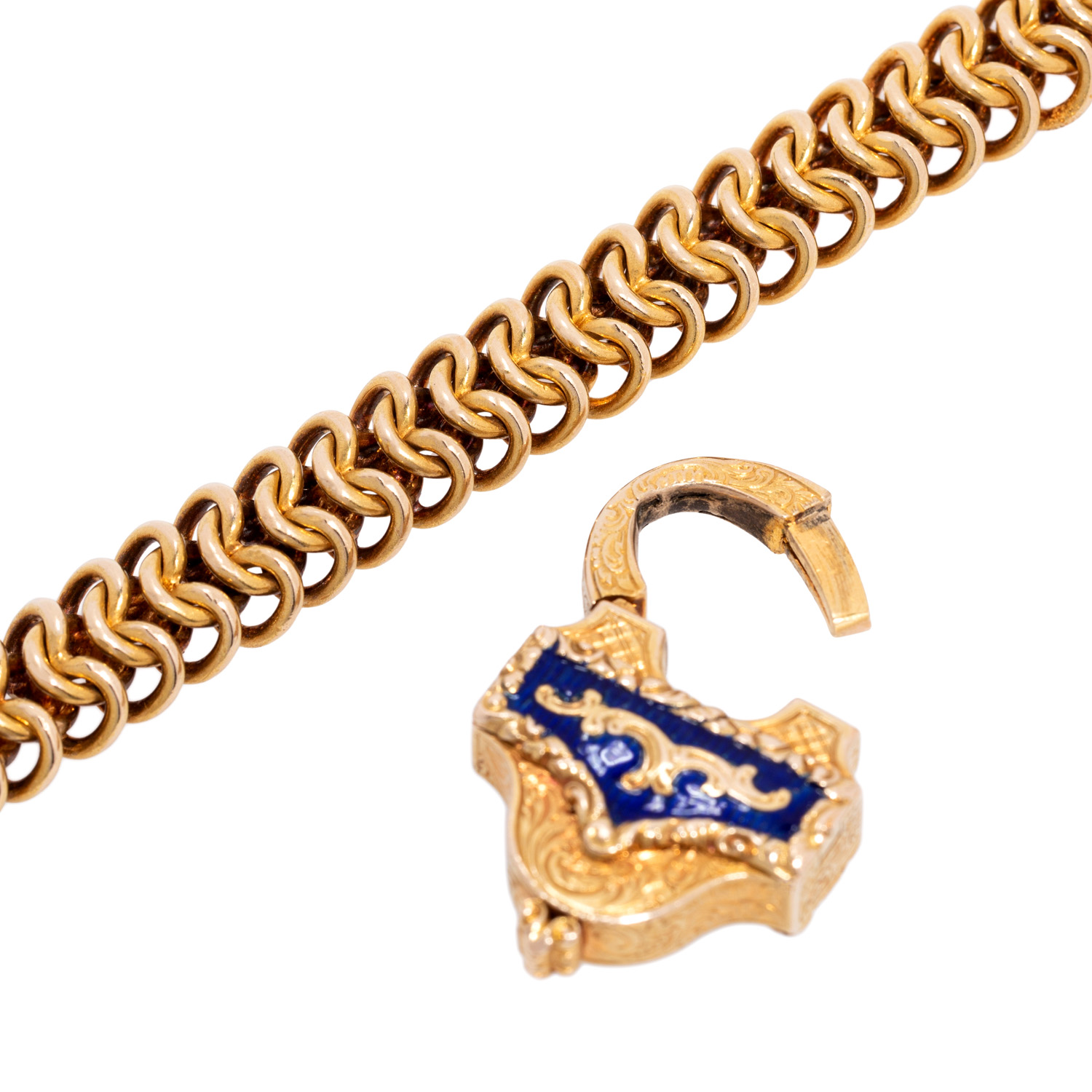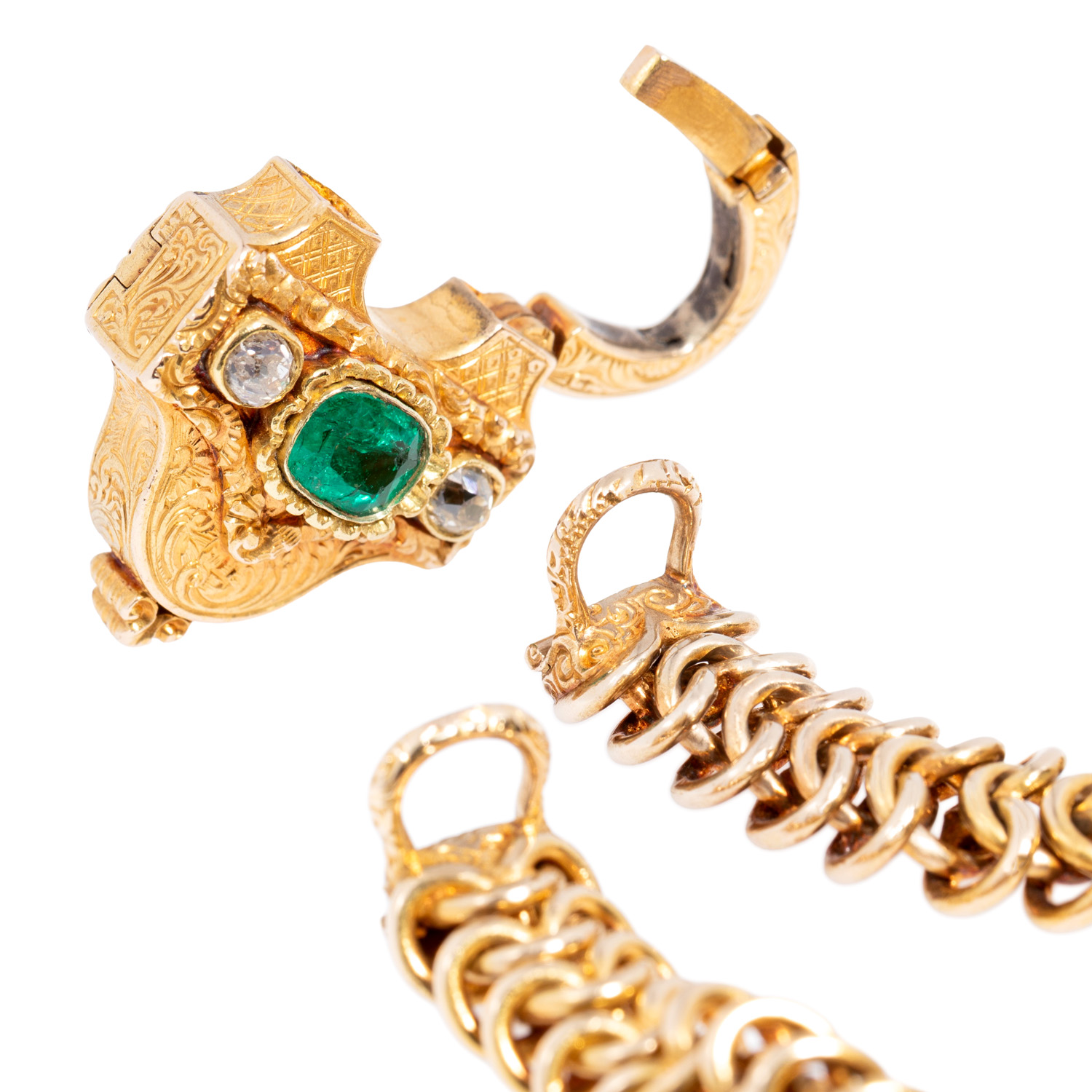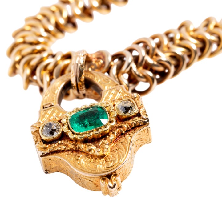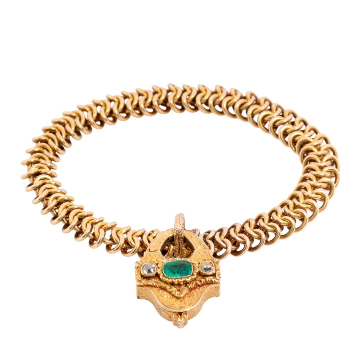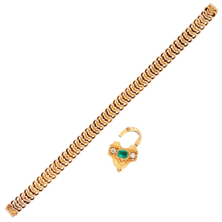 Antique gold bracelet with padlock set with emerald and old-mine-cut diamonds totalling approx. 0.40 ct, 18k gold, padlock enamelled blue on the reverse, 49.3 g, l: approx. 19.5 cm, approx. 1840-1860, very good condition for its age. Massive bracelet of the late Biedermeier period as a sign of growing prosperity - opulent quality with luxurious padlock clasp in jeweller's quality. Enclosed hand written sales receipt (1996).