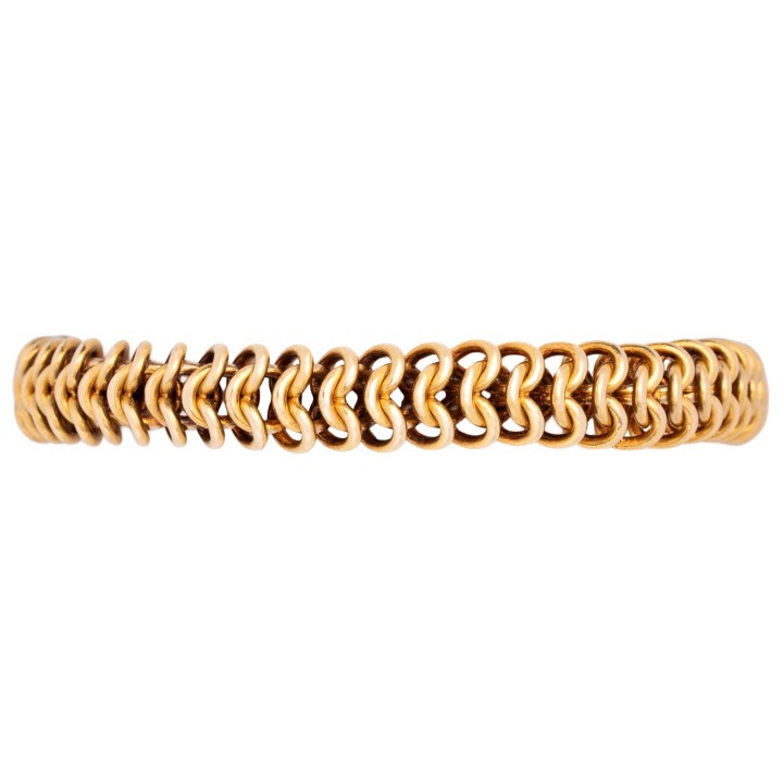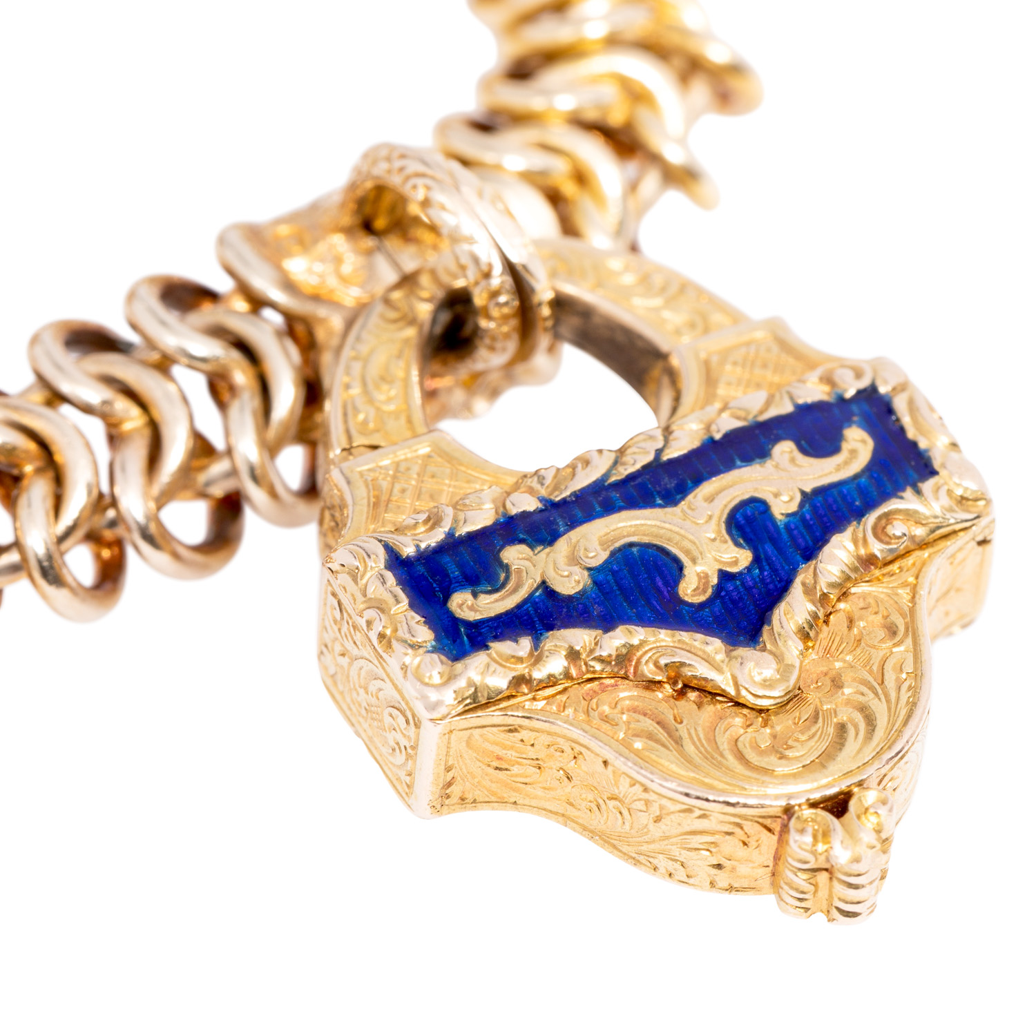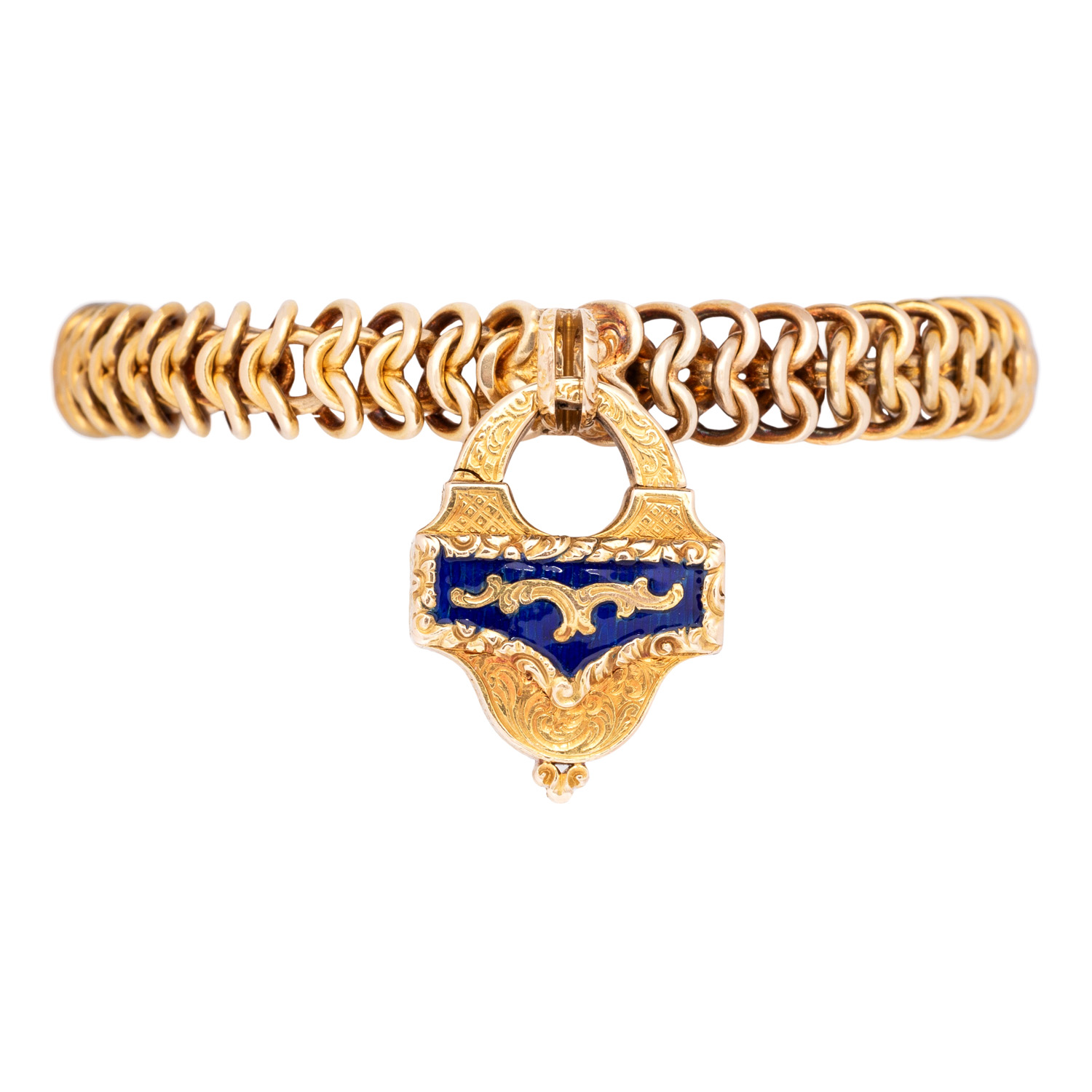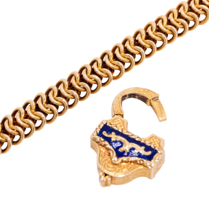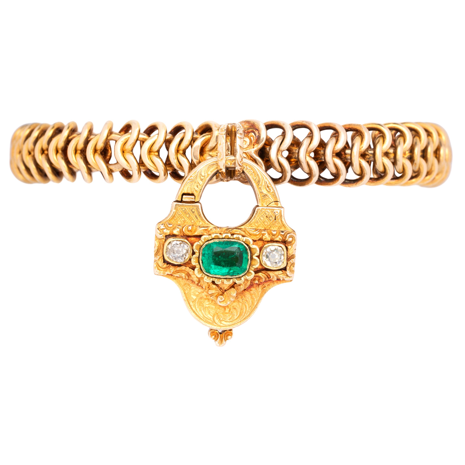 Antique gold bracelet with padlock set with emerald and old-mine-cut diamonds totalling approx. 0.40 ct, 18k gold, padlock enamelled blue on the reverse, 49.3 g, l: approx. 19.5 cm, approx. 1840-1860, very good condition for its age. Massive bracelet of the late Biedermeier period as a sign of growing prosperity - opulent quality with luxurious padlock clasp in jeweller's quality. Enclosed hand written sales receipt (1996).