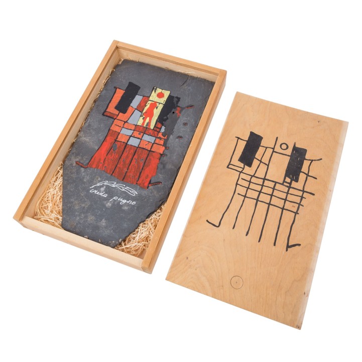 mixed media, signed and dated, HxW: 36/21 cm. Wooden box.
