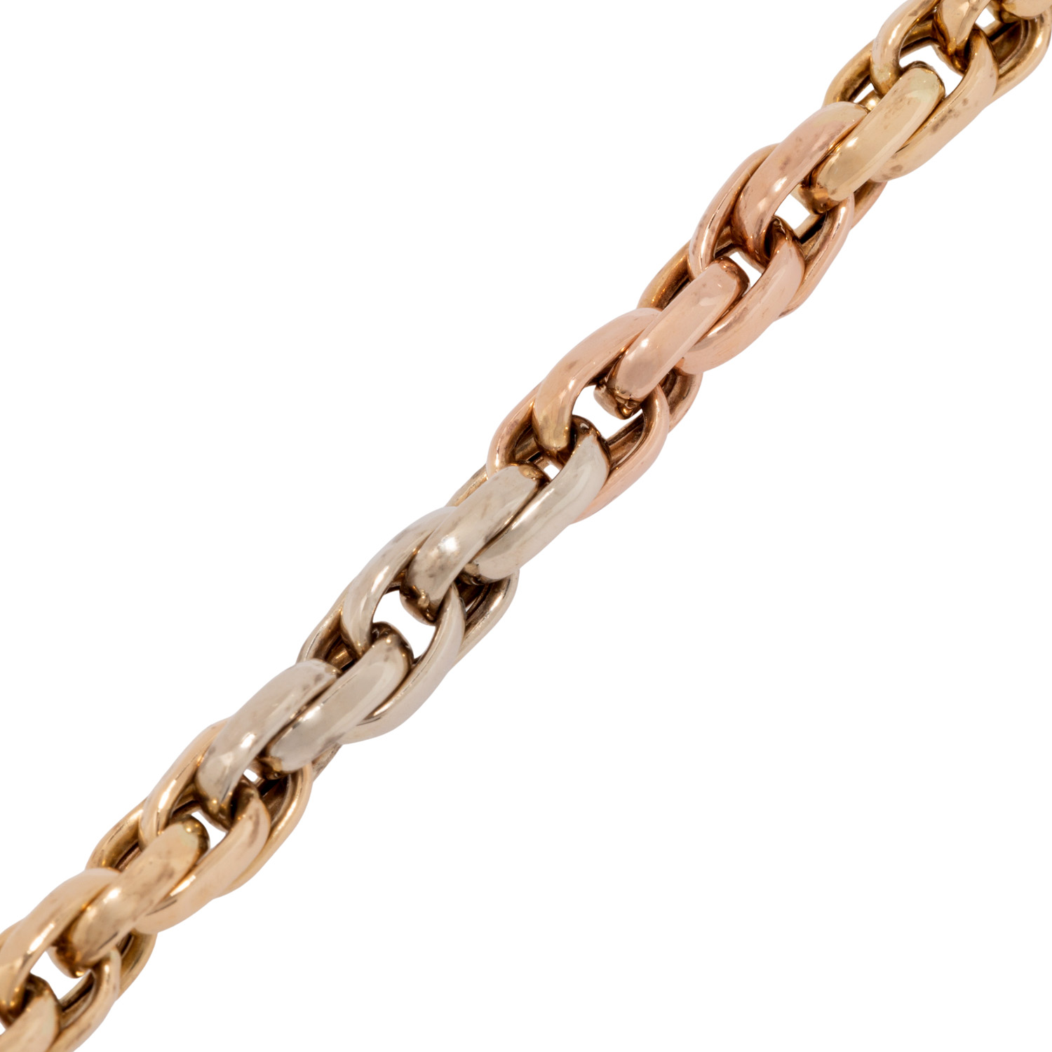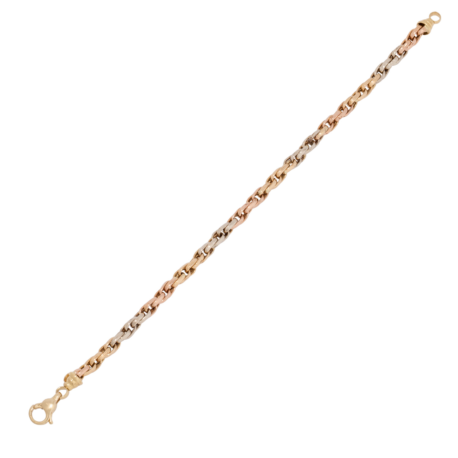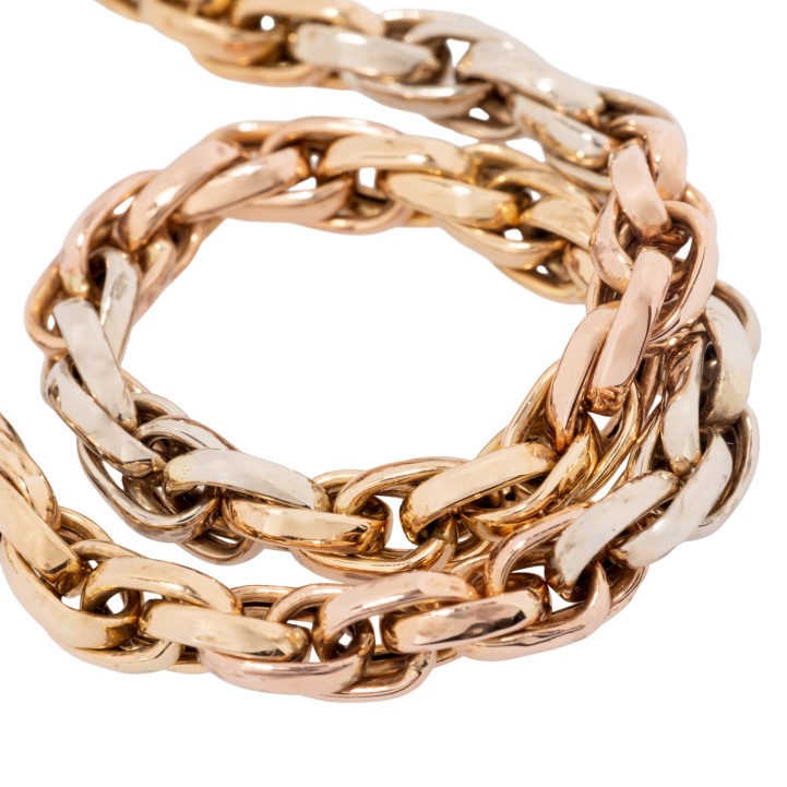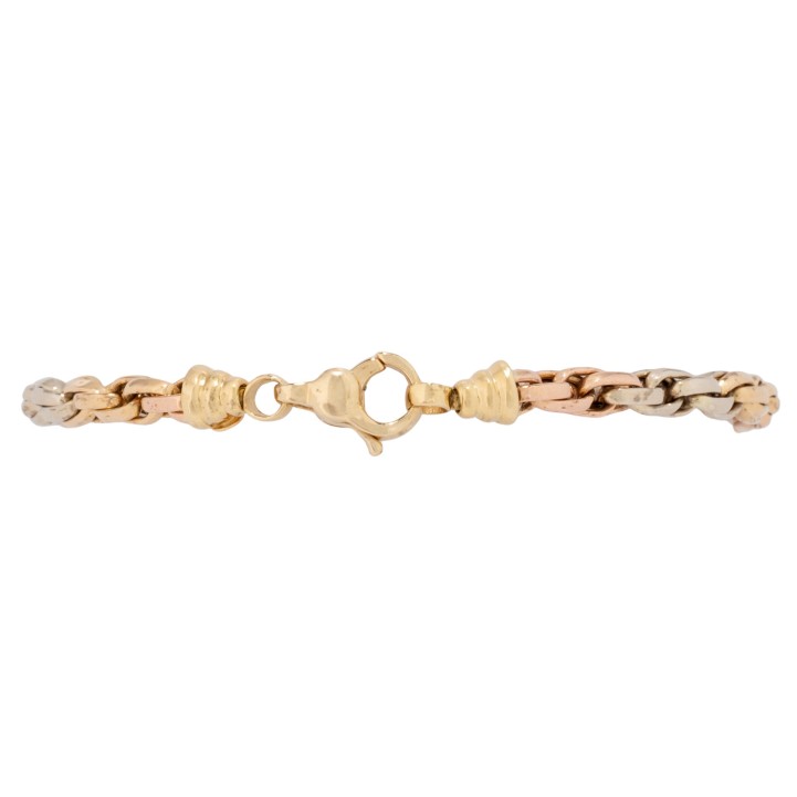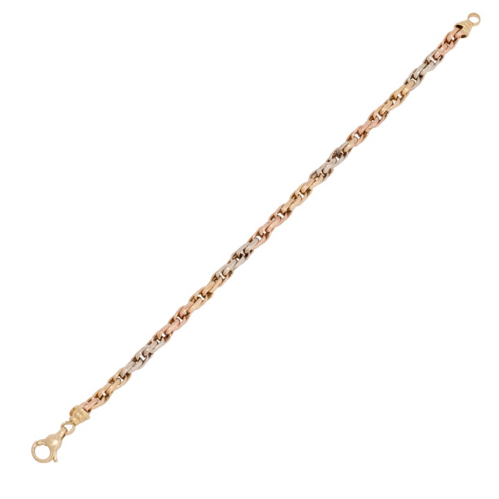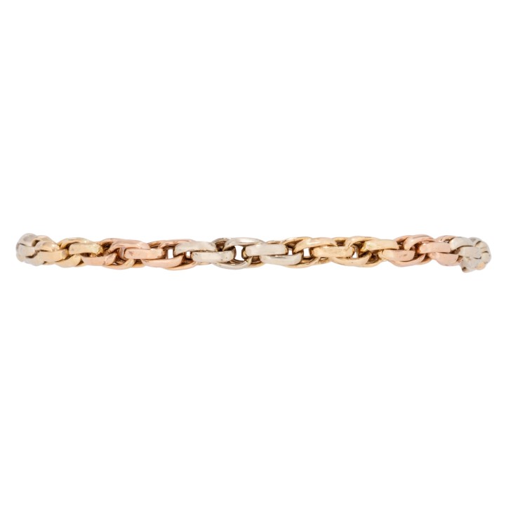 Bracelet, double flat anchor, 18K yellow, white and red gold, L: 18.5 cm, W: 4.2 mm, carabiner clasp, 2nd half of 20th century, signs of wear.