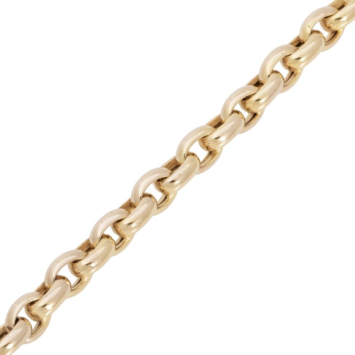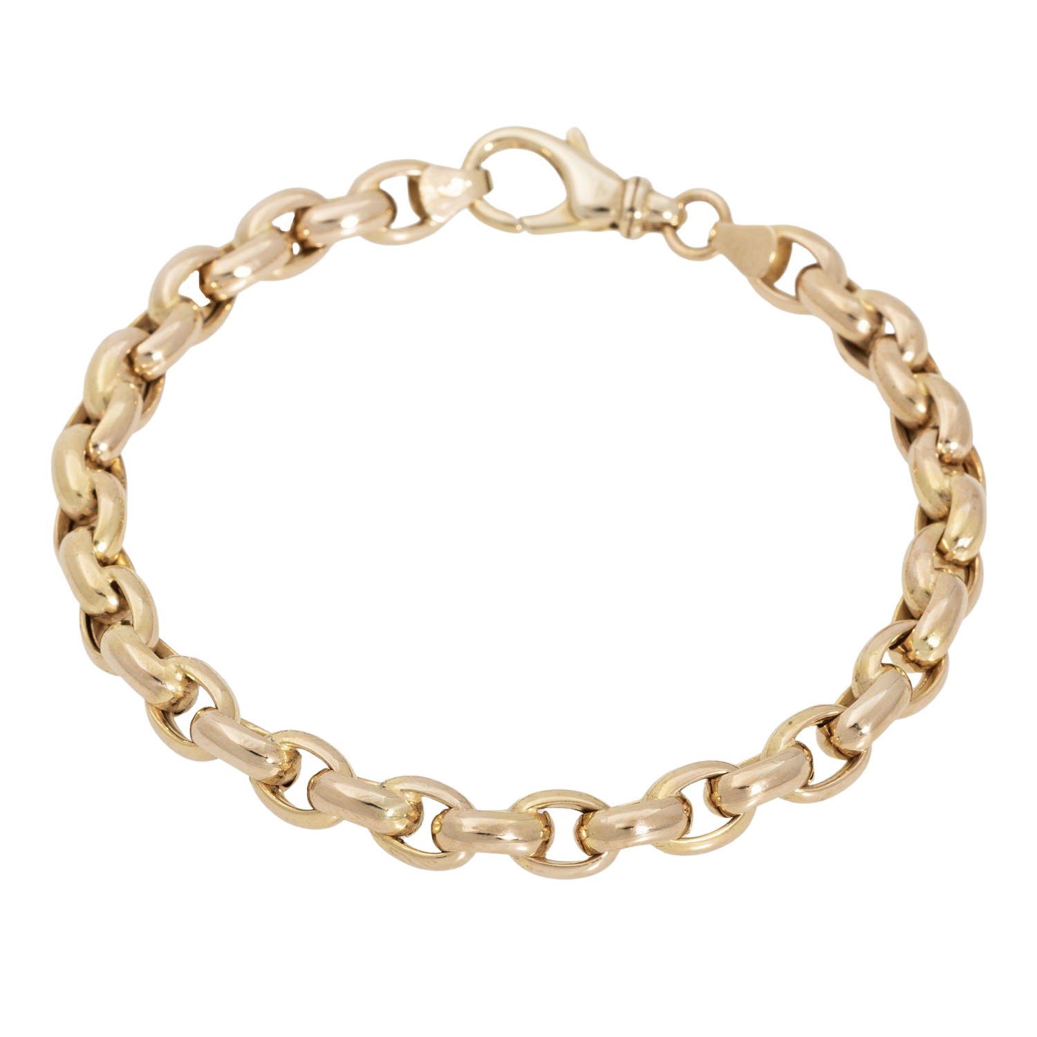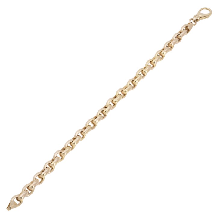 Bracelet, oval links with half oval profile, 14K yellow gold, 9.1 g, L: 19 cm, hollow links, W: 6.2 mm, carabiner clasp, late 20th century, minimal signs of wear.