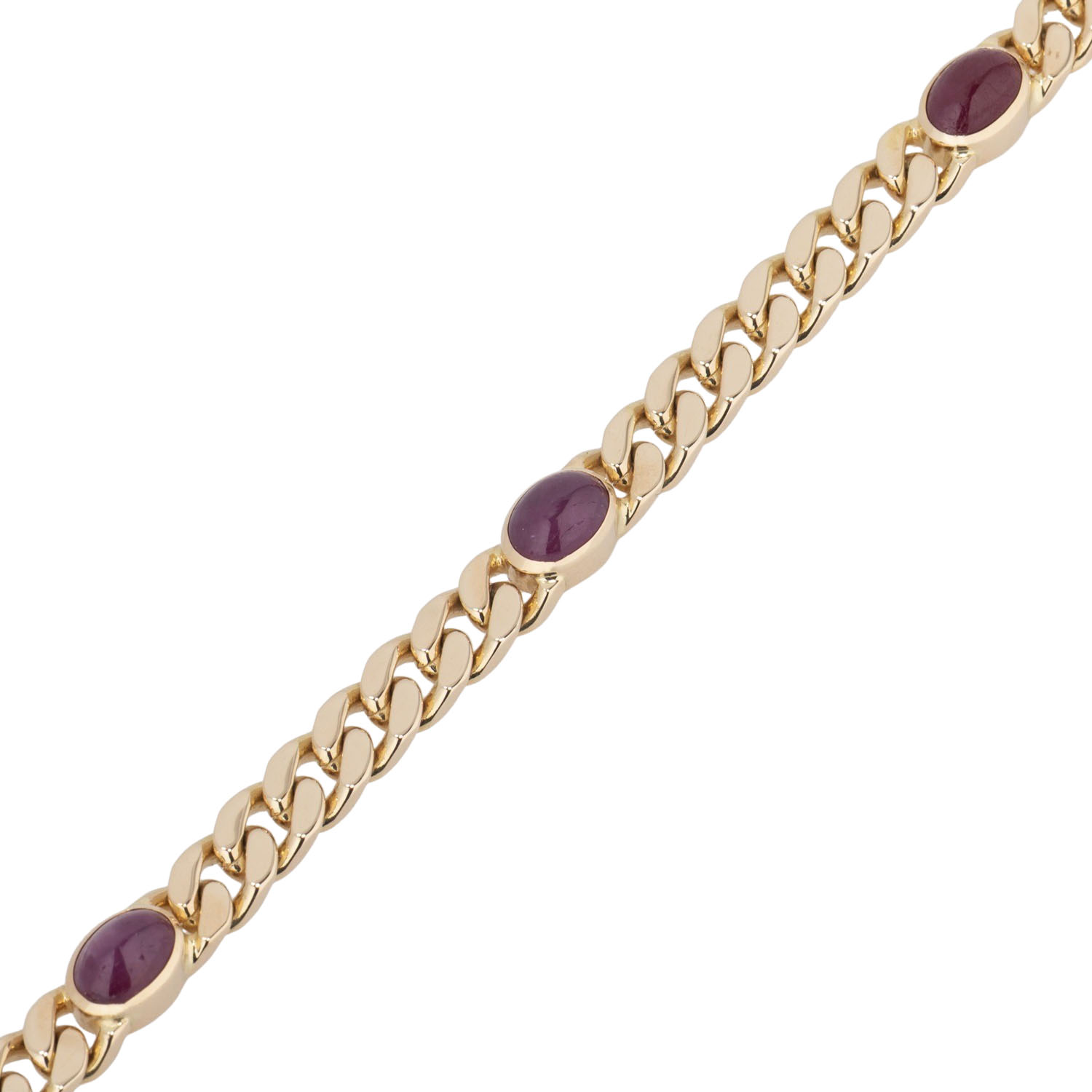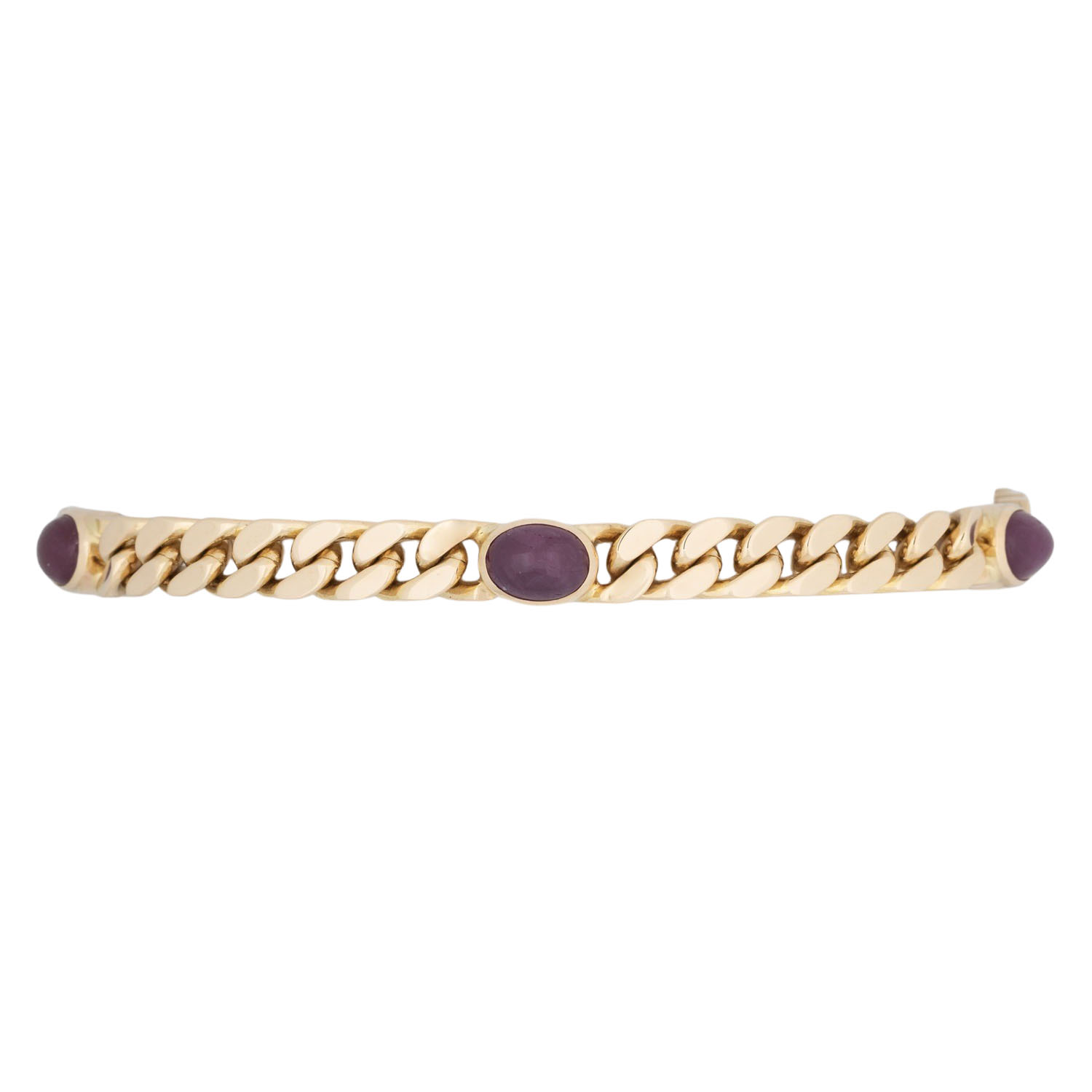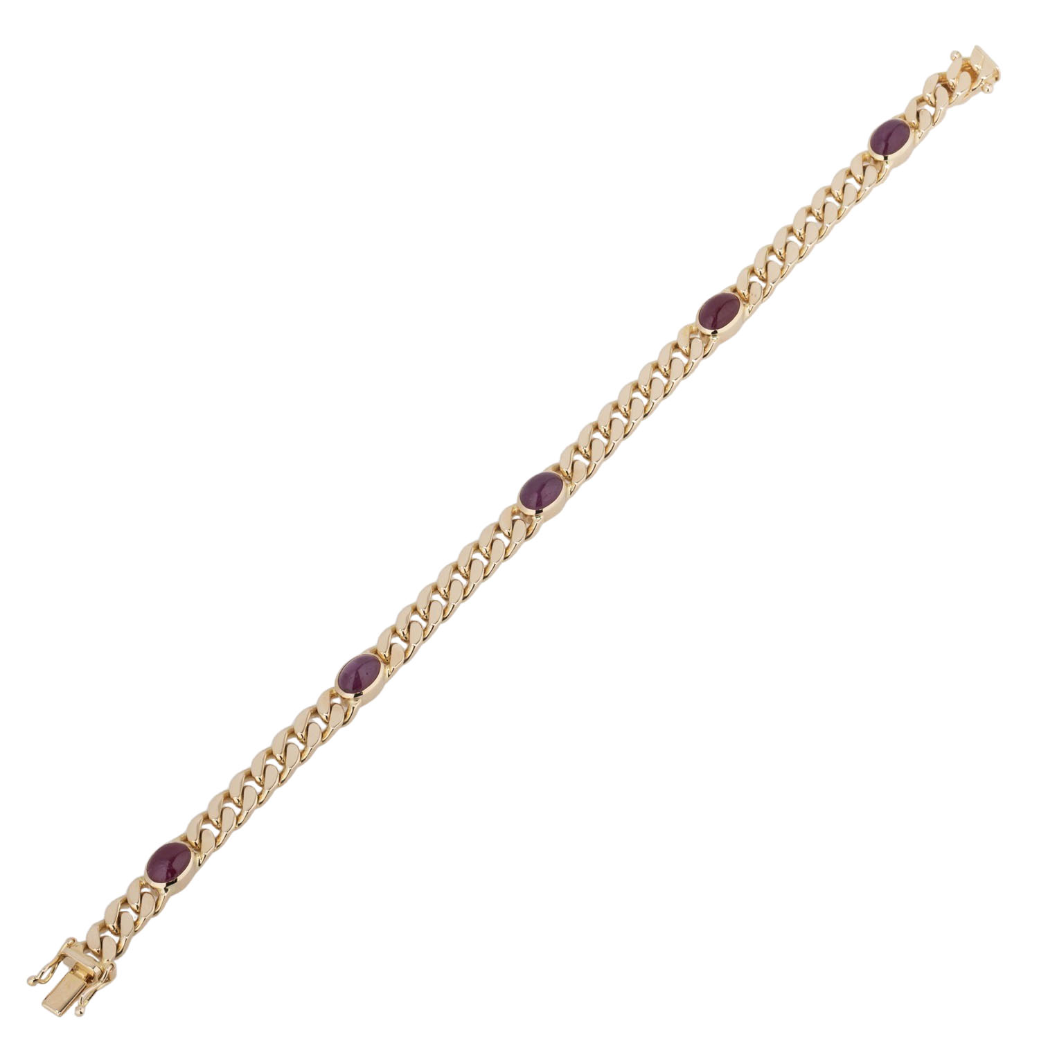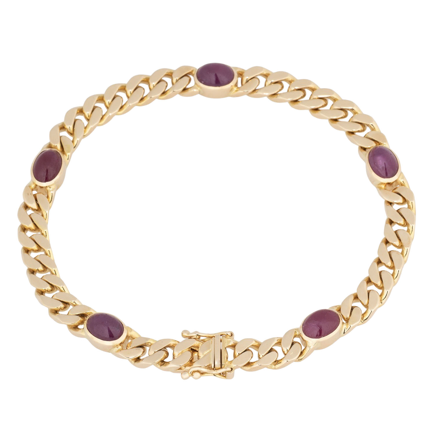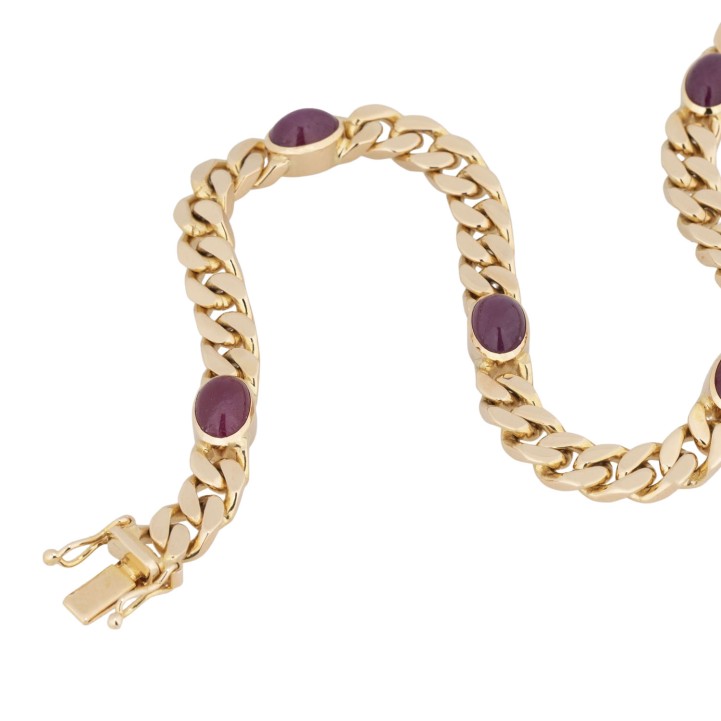 Curb link bracelet with 5 rubie cabochon, each ca. 7 x 5 mm, 14K yellow gold, 21.7 g, L: ca. 19 cm, arround 1970, minor signs of wear, box clasp with 2 safety catches.