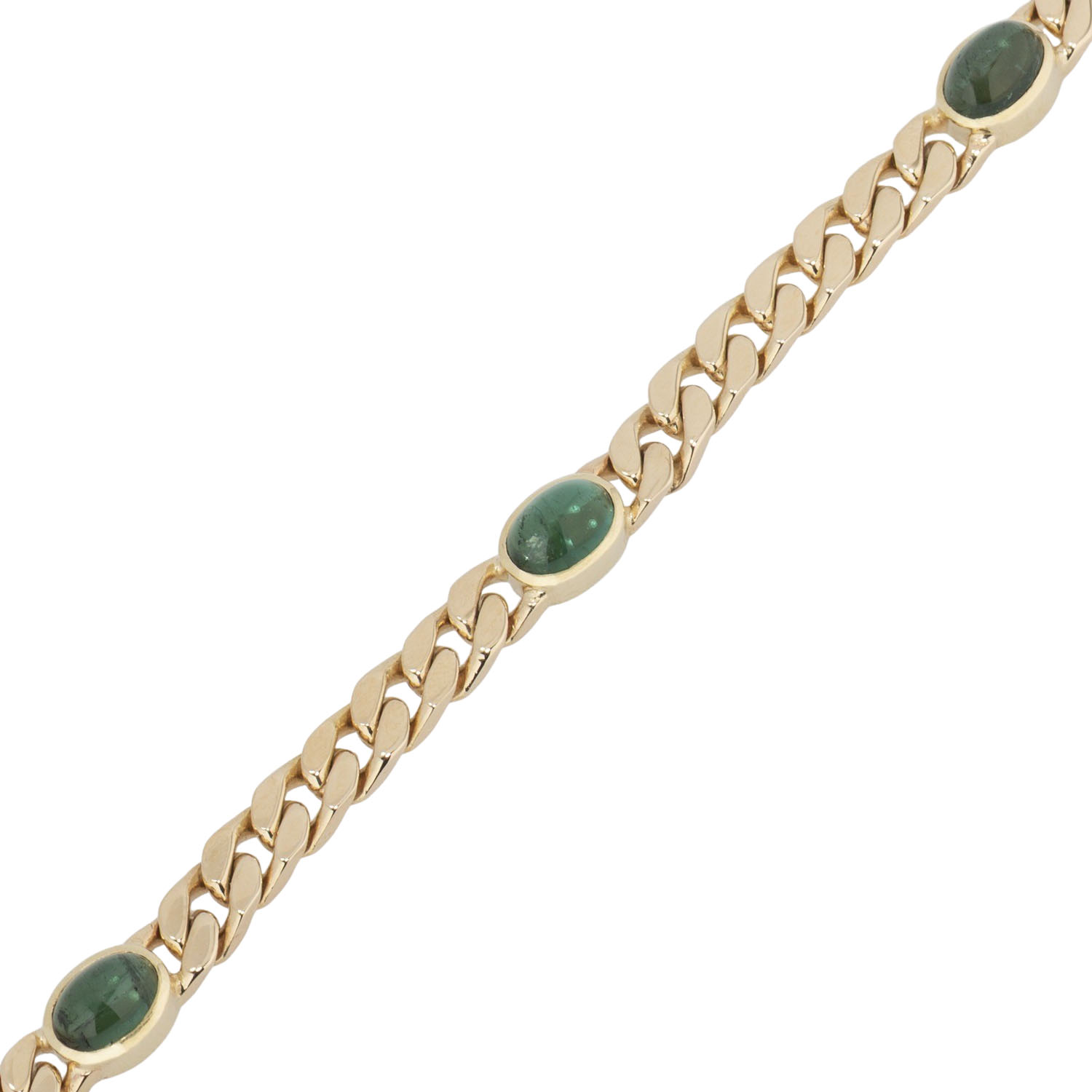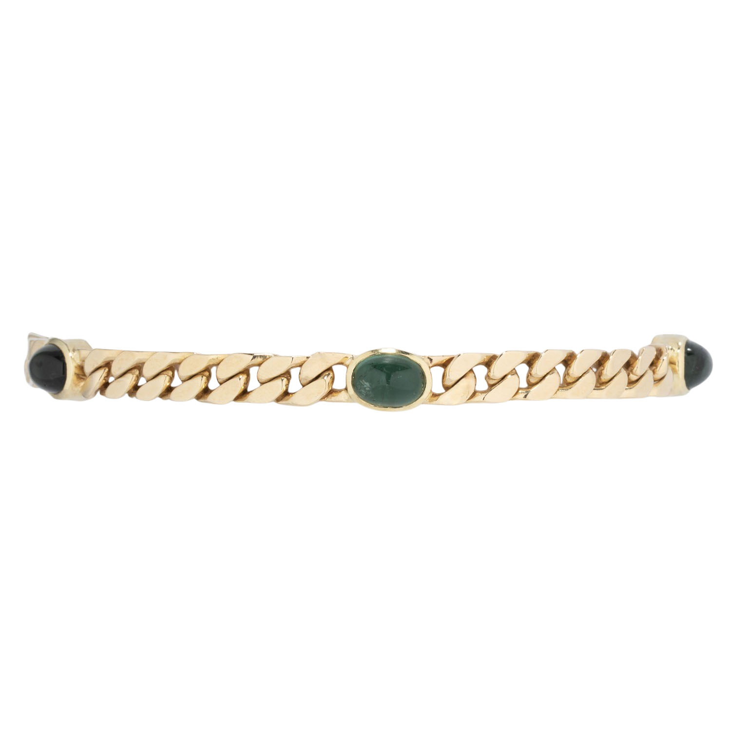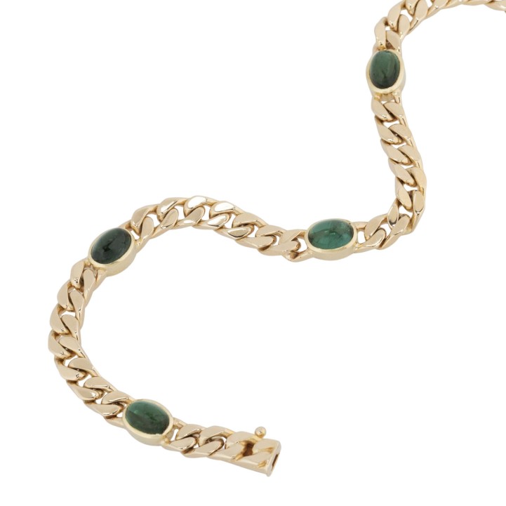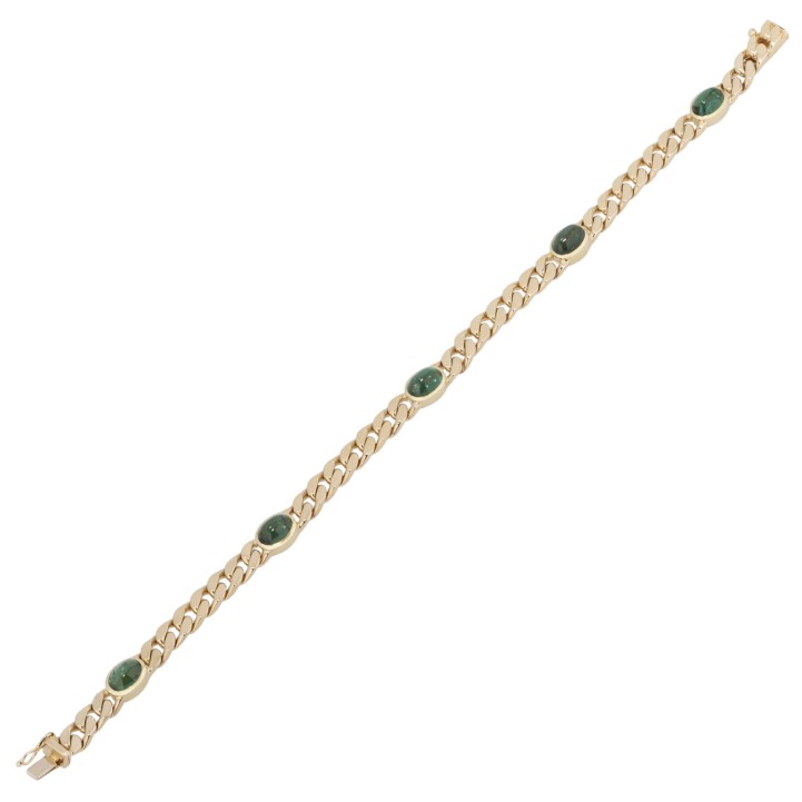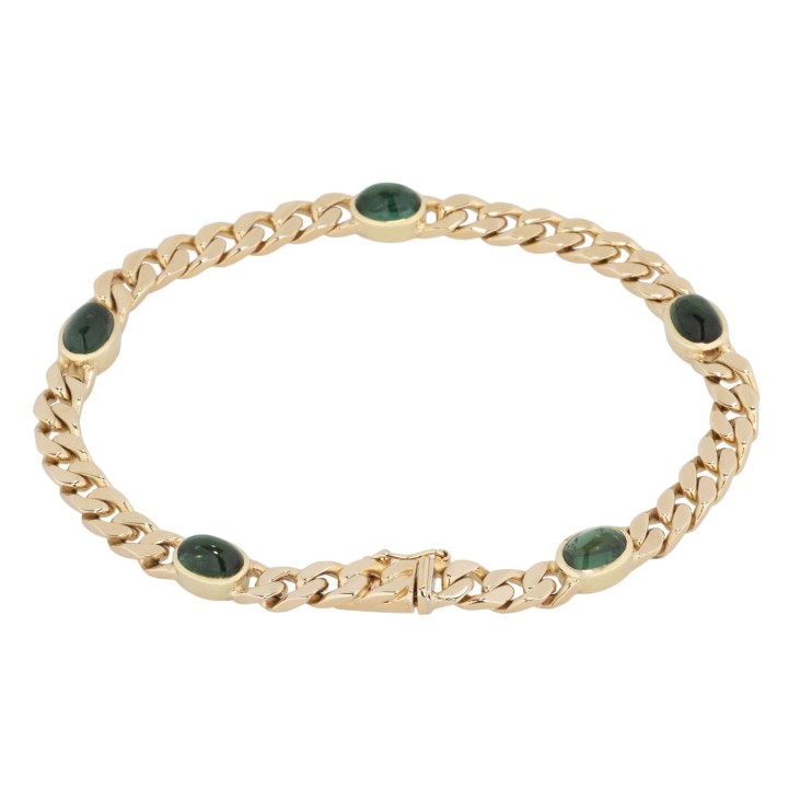 Curb link bracelet with 5 tourmaline cabochon, each ca. 7 x 5 mm, 14K yellow gold, 16.9 g, L: ca. 19 cm, arround 1970, minor signs of wear, box clasp with 2 safety catches.