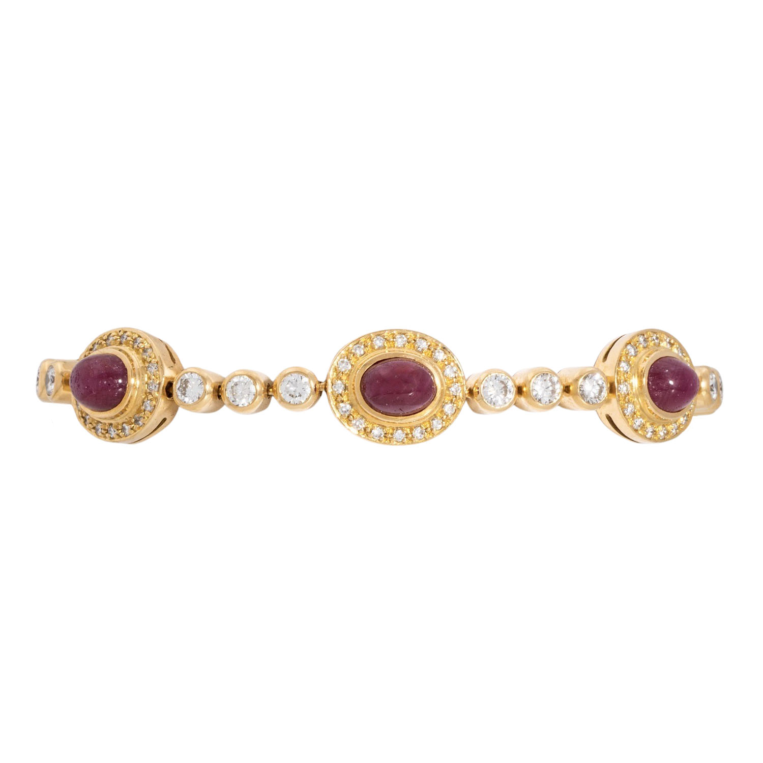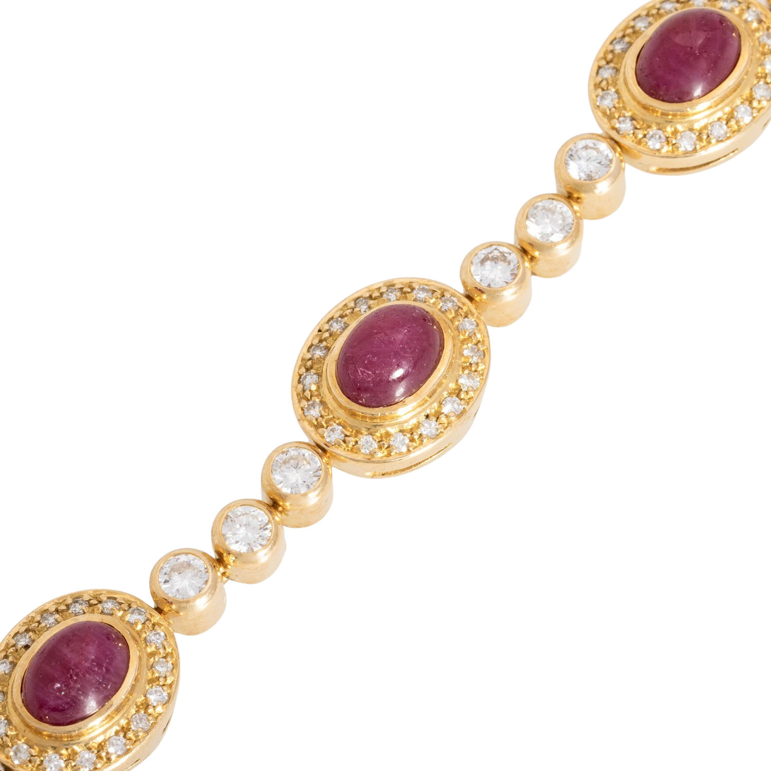 Bracelet with 6 oval cabochon-cut rubies and brilliant-cut diamonds totalling ca. 3.5 ct, ca. STW (I-J)/SI, 18K yellow gold, 36.2 g, L: 19.5 cm (with 3 enlargement parts), late 20th century, good condition, solid workmanship.