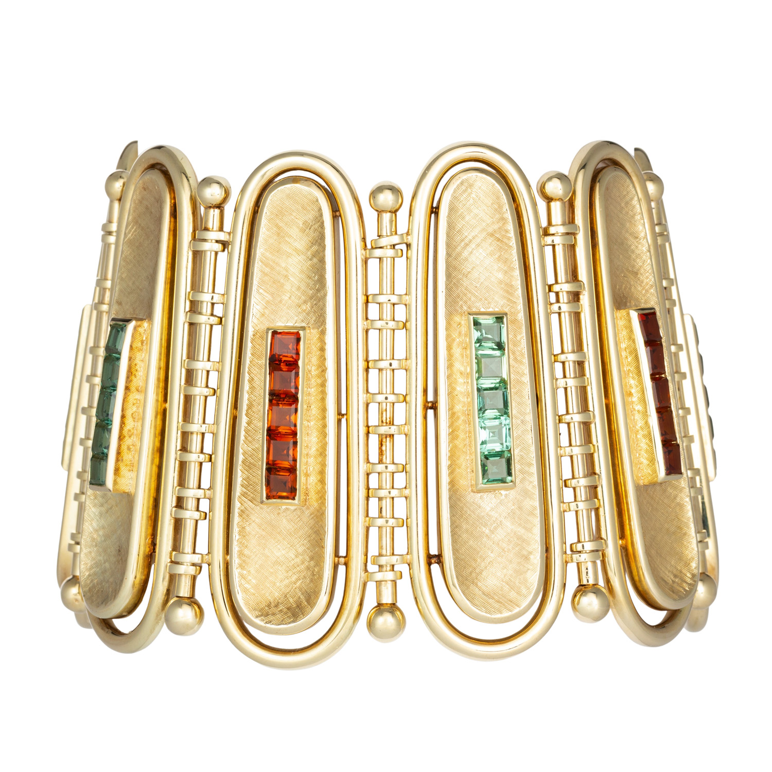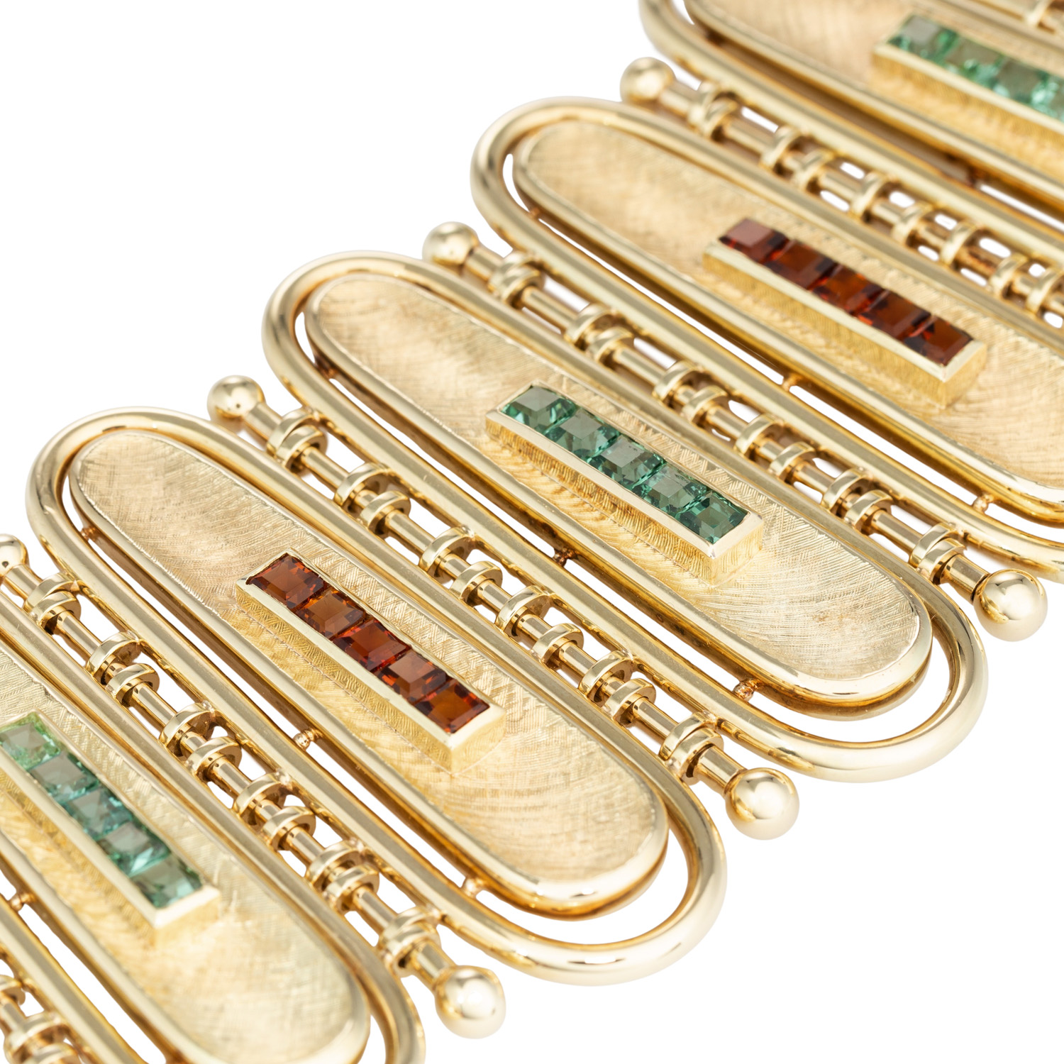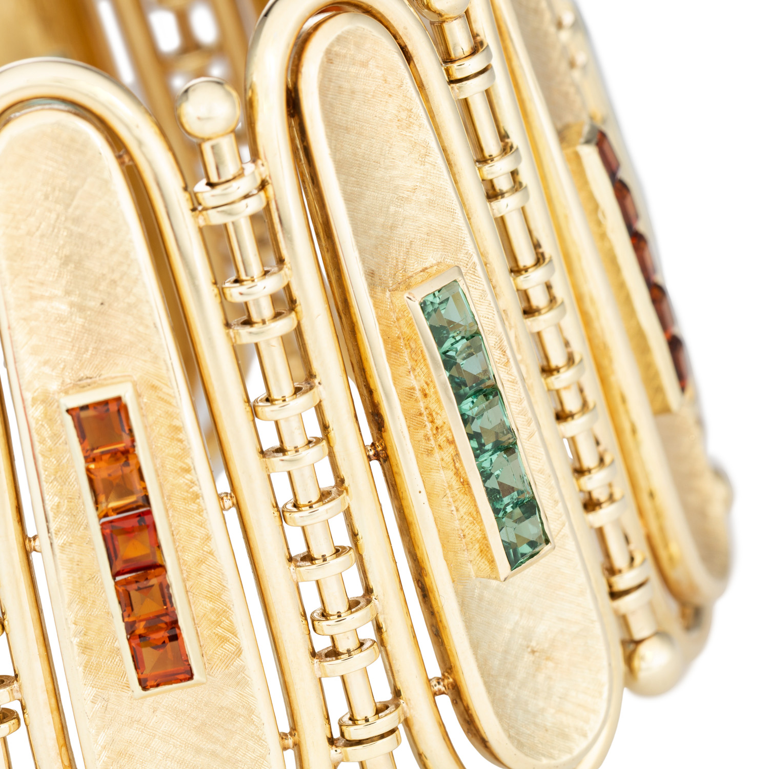 Bracelet with each 20 tourmaline and citrine carés, set in rows to 5 on line mated links, 14K yellow gold, 145.9 g, bracelet with conical shape, inner circumference (bottom/top): 20/17.5 cm, box clasp, late 20th century, costumised design - handcrafted.