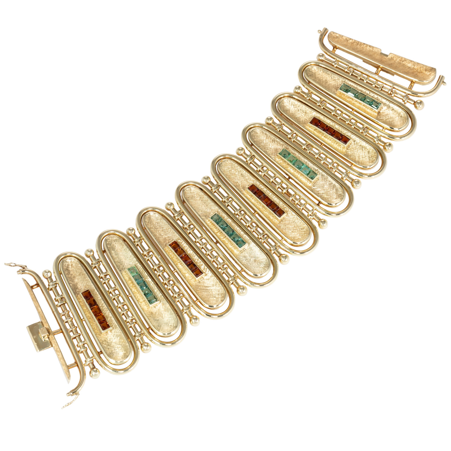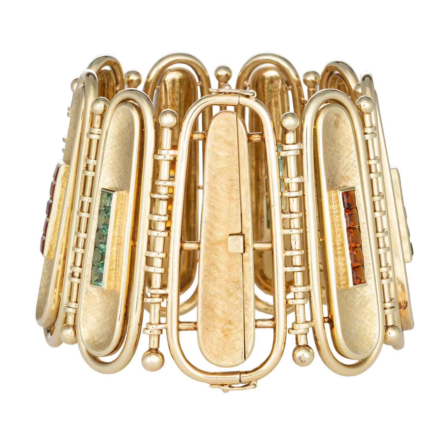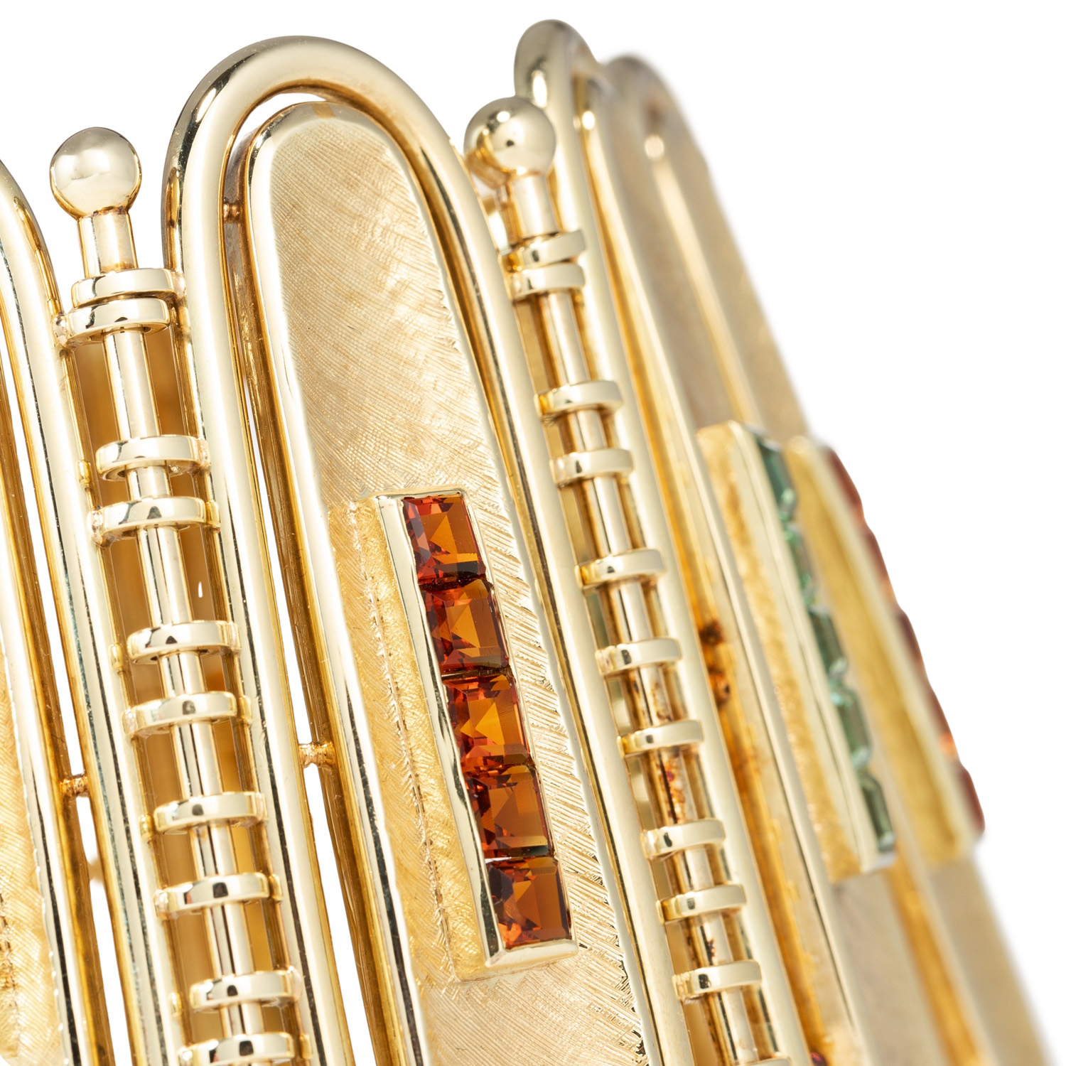 Bracelet with each 20 tourmaline and citrine carés, set in rows to 5 on line mated links, 14K yellow gold, 145.9 g, bracelet with conical shape, inner circumference (bottom/top): 20/17.5 cm, box clasp, late 20th century, costumised design - handcrafted.