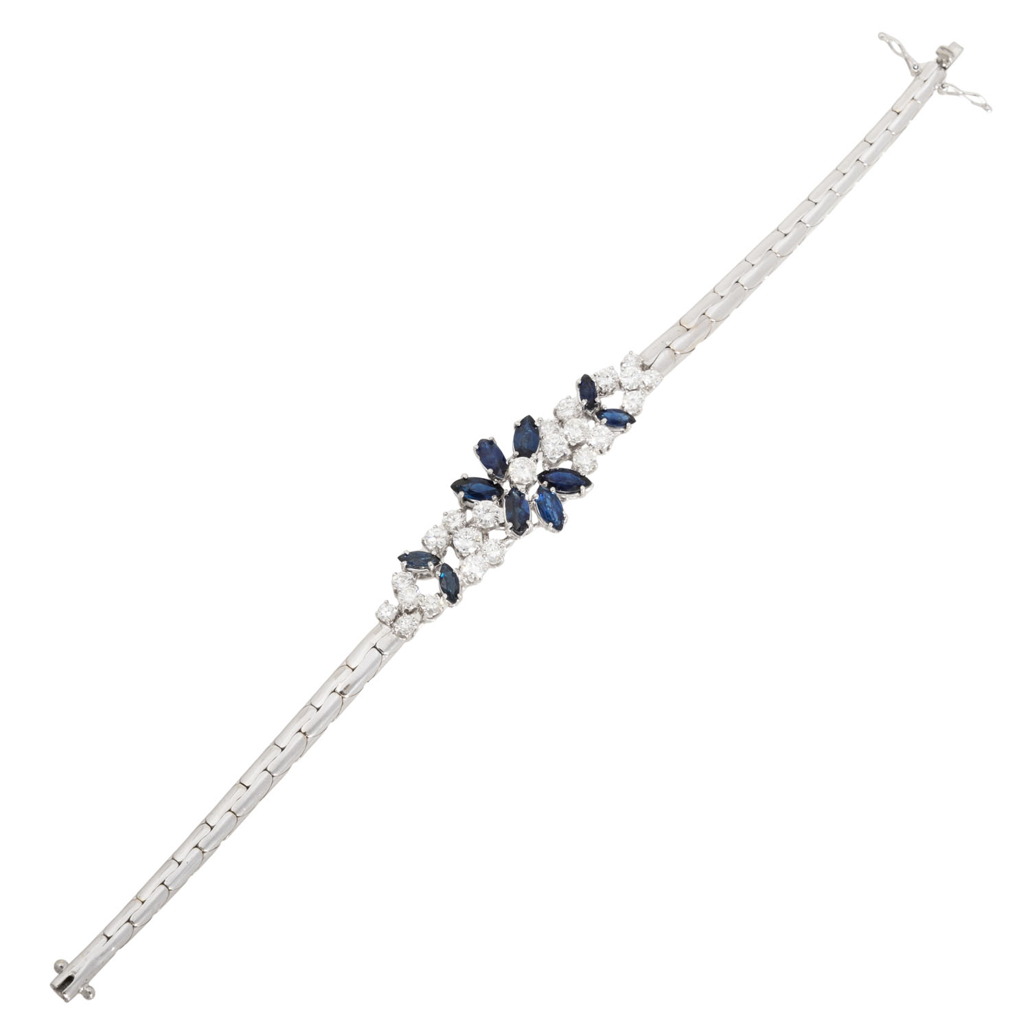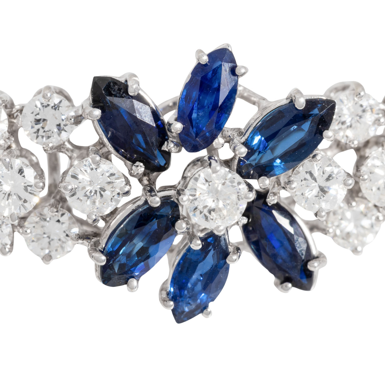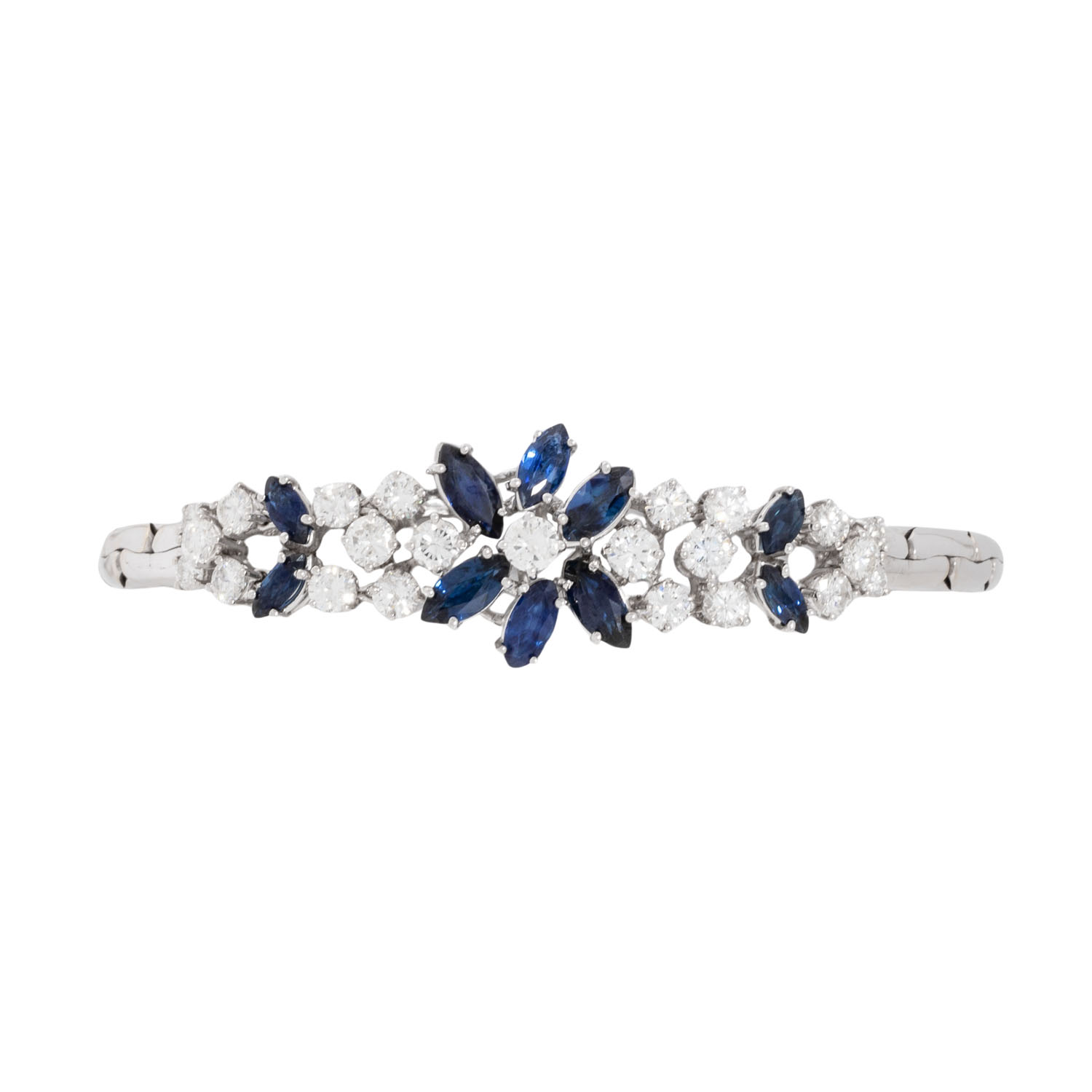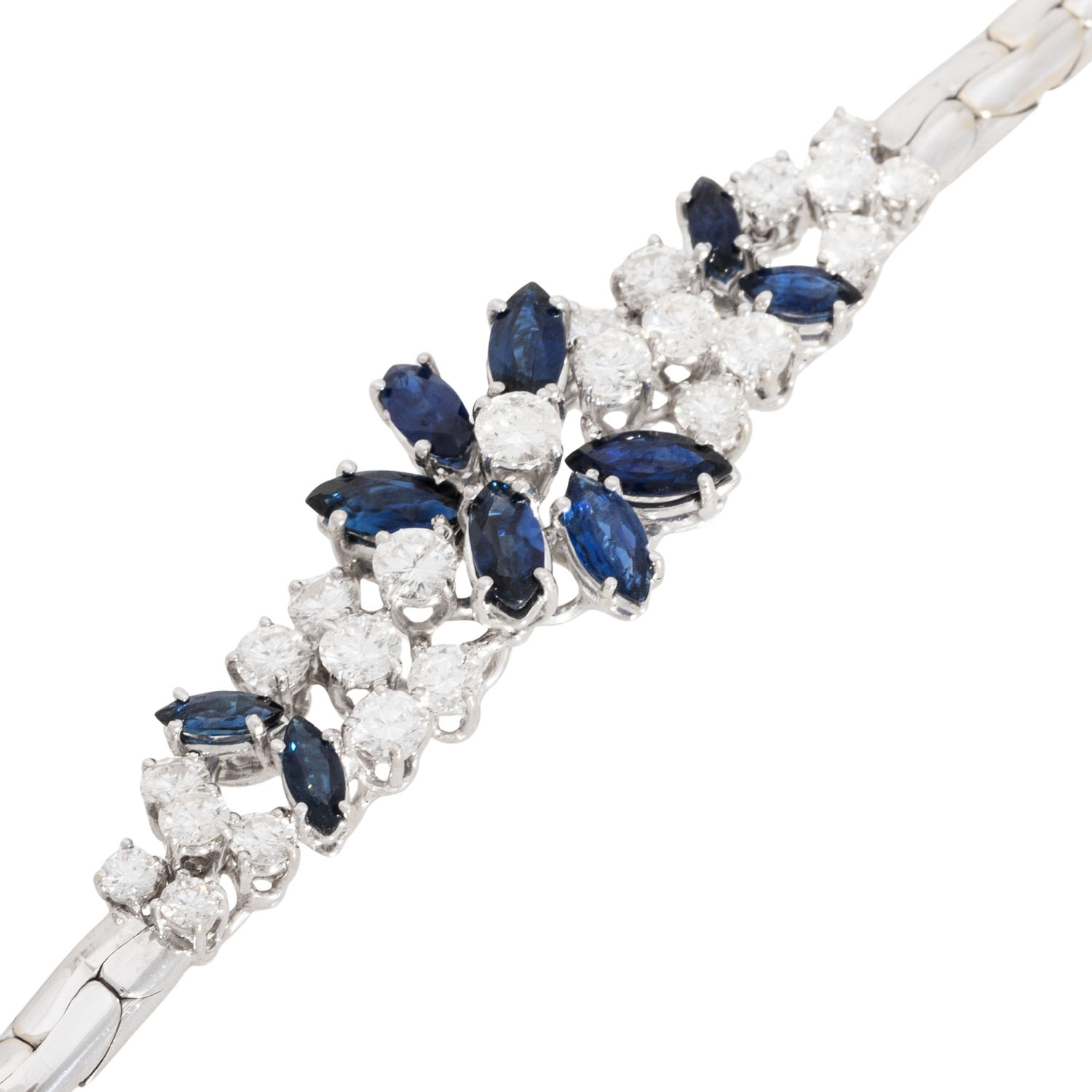 Bracelet with navette-cut sapphires and brilliant-cut diamonds totalling ca. 2.2 ct, ca. WHITE-STW (H-J)/SI-I1, 18K white gold, 24.2 g, L: 18.5 cm, 2nd half of 20th century, good condition.