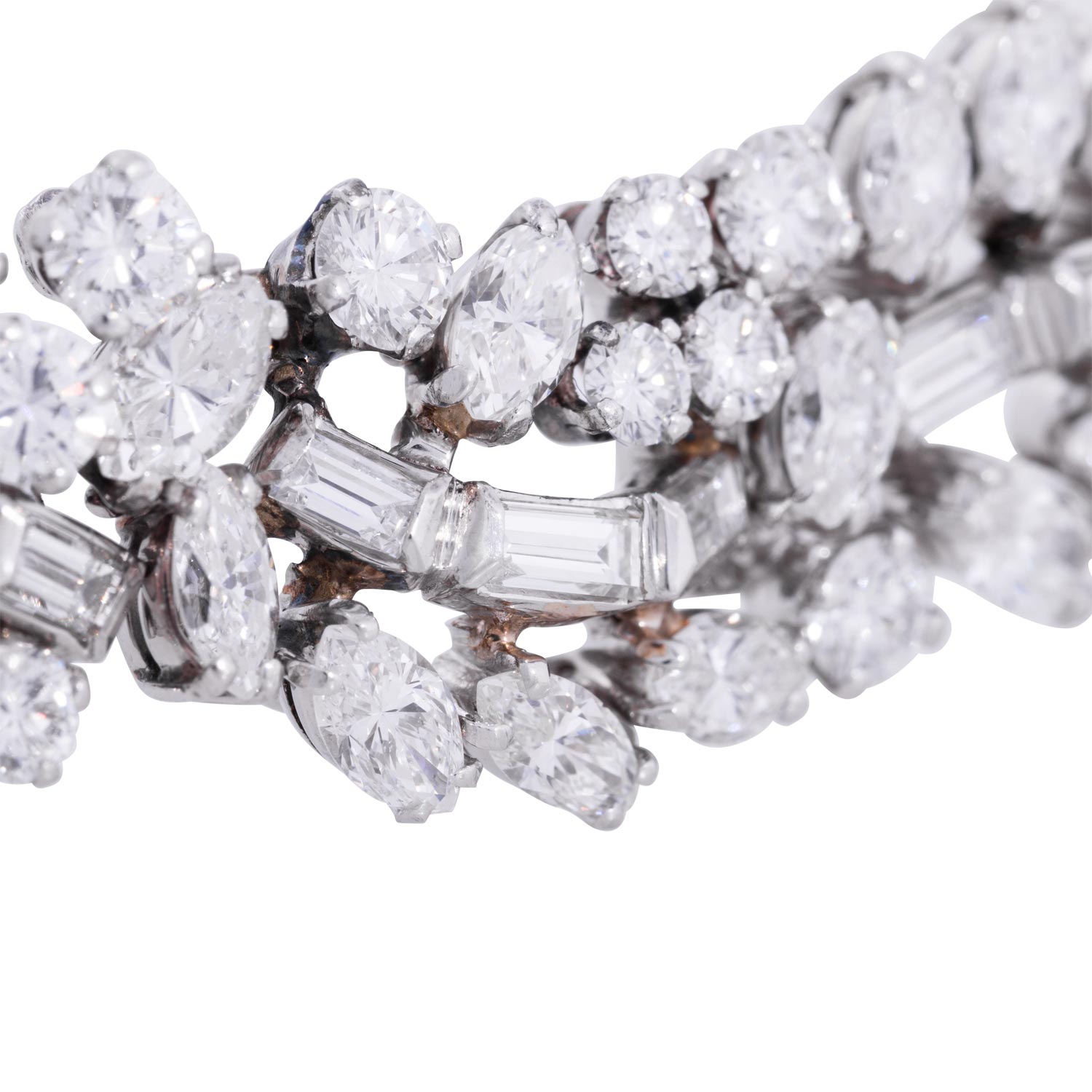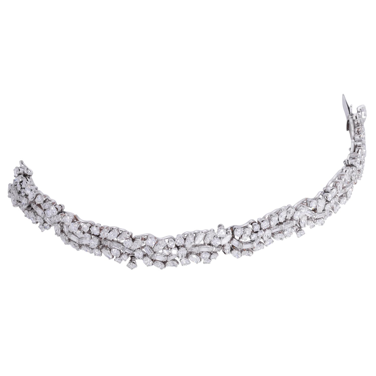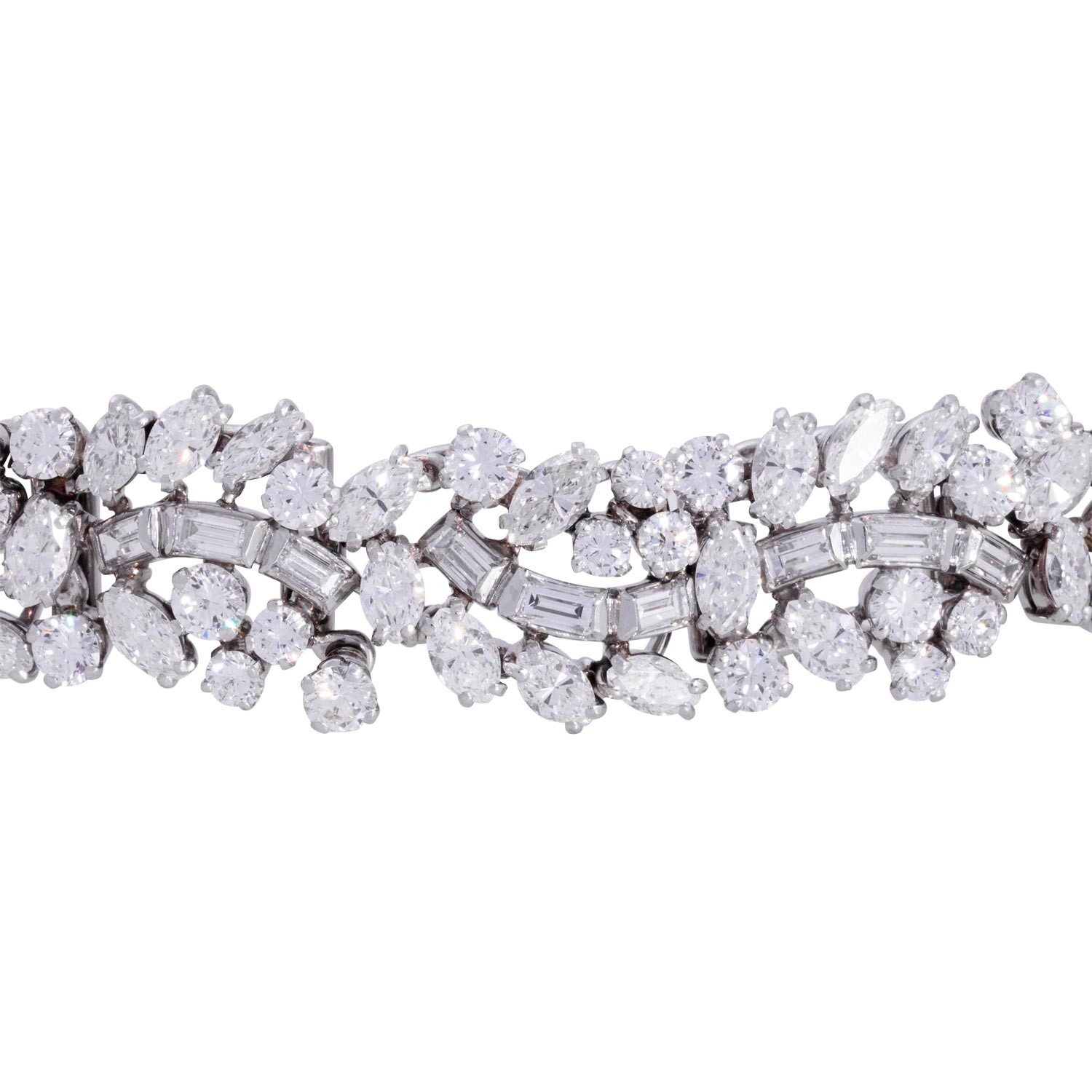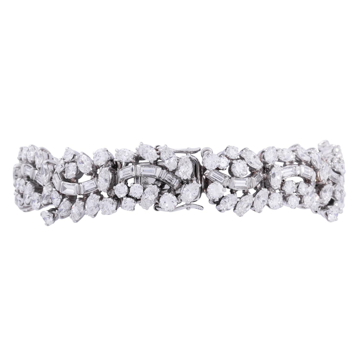 Bracelet with numerous diamonds totalling ca. 19.2 ct, baguette-cut, navette-cut, brilliant-cut (of which 6 pc. movable), all stones ca. RW-WHITE (G-H), mostly VVS-VS, single stones piqué, replacement value ca. 80,000 €, platinum, tongue at the clasp 18K WG, 54.8 gr, L: ca. 18 cm, 2nd half 20th century, minor signs of wear, handcrafted.