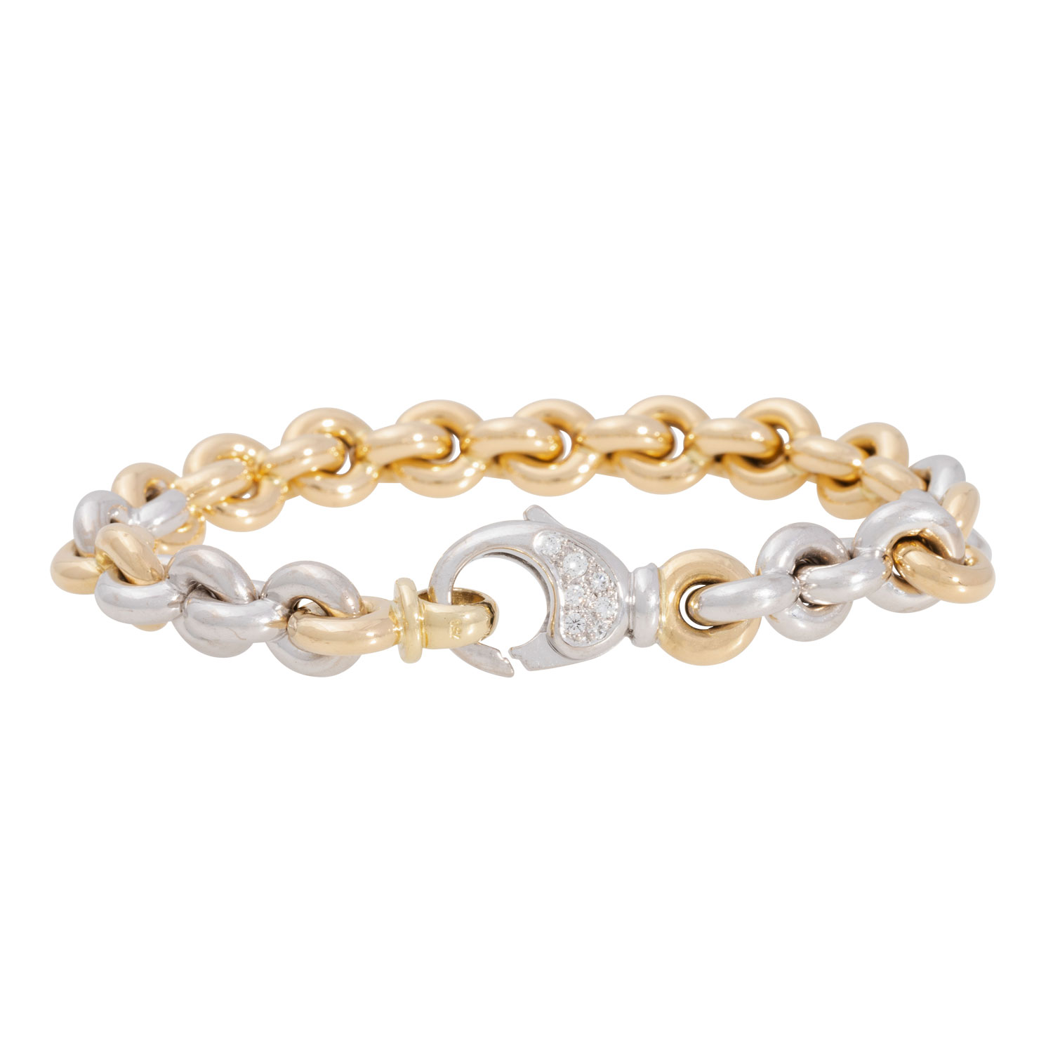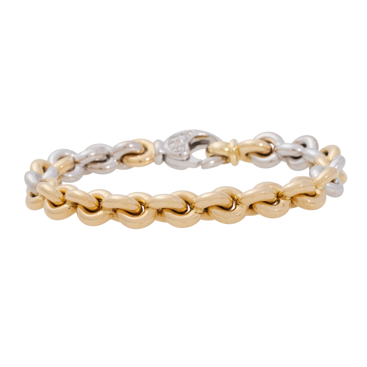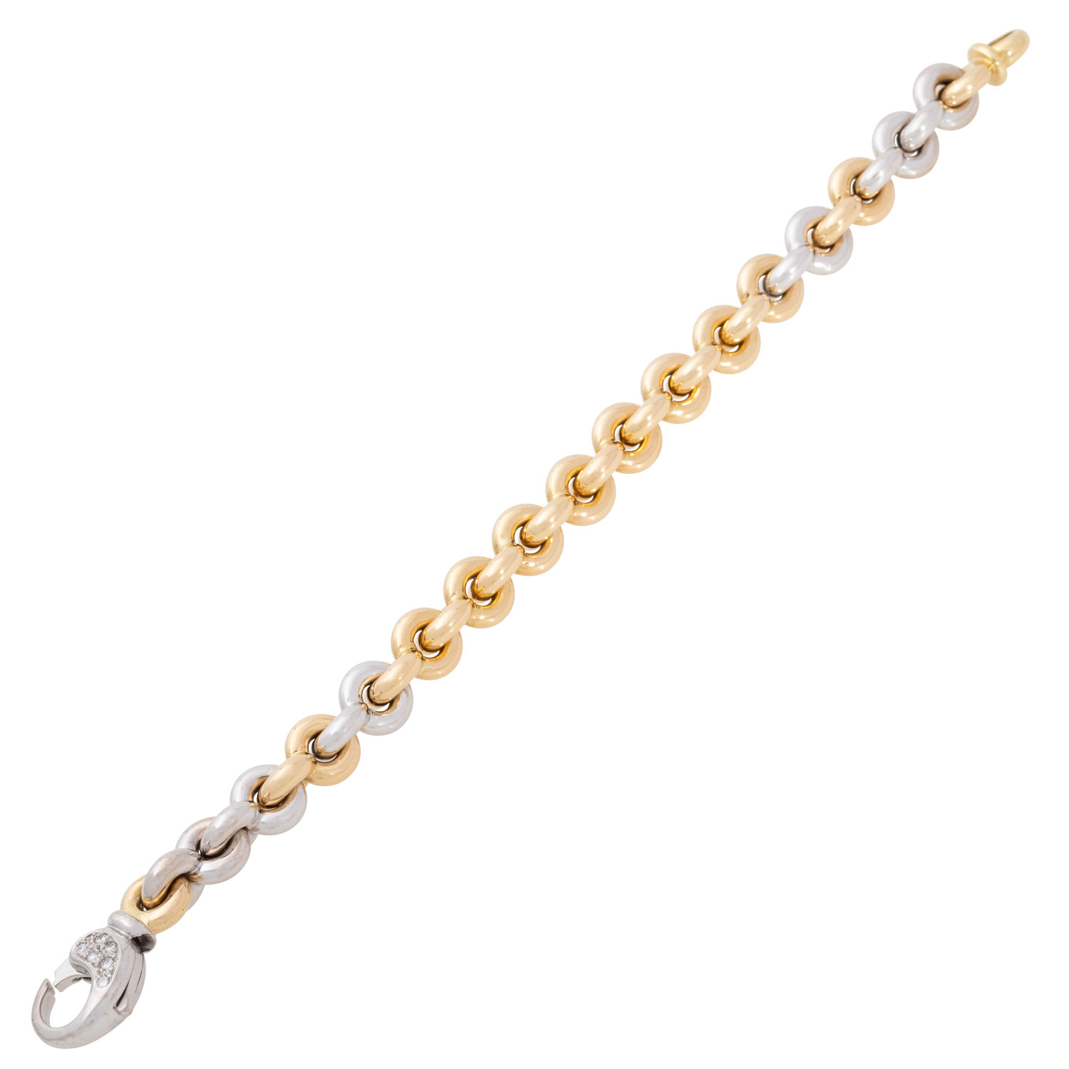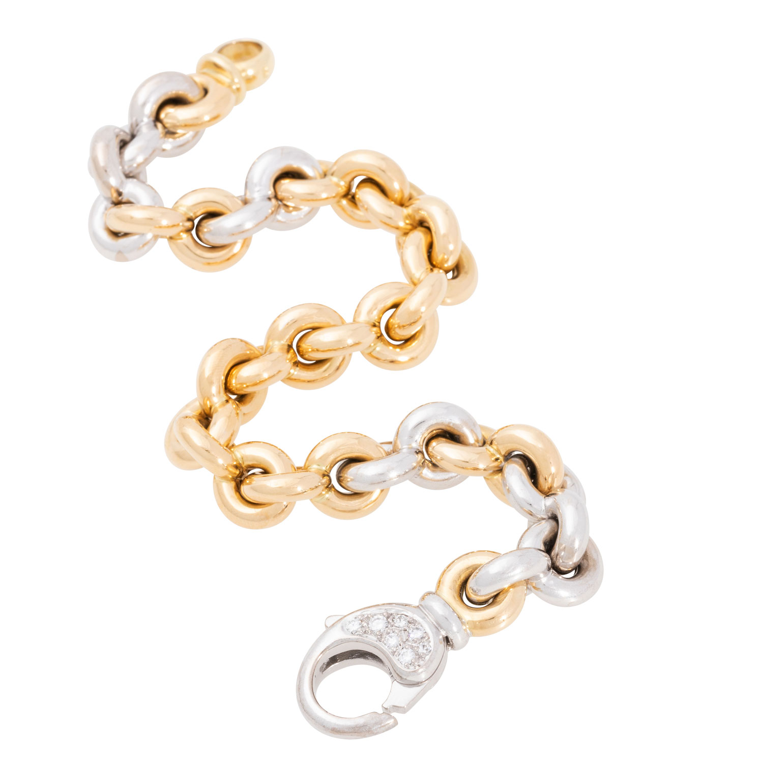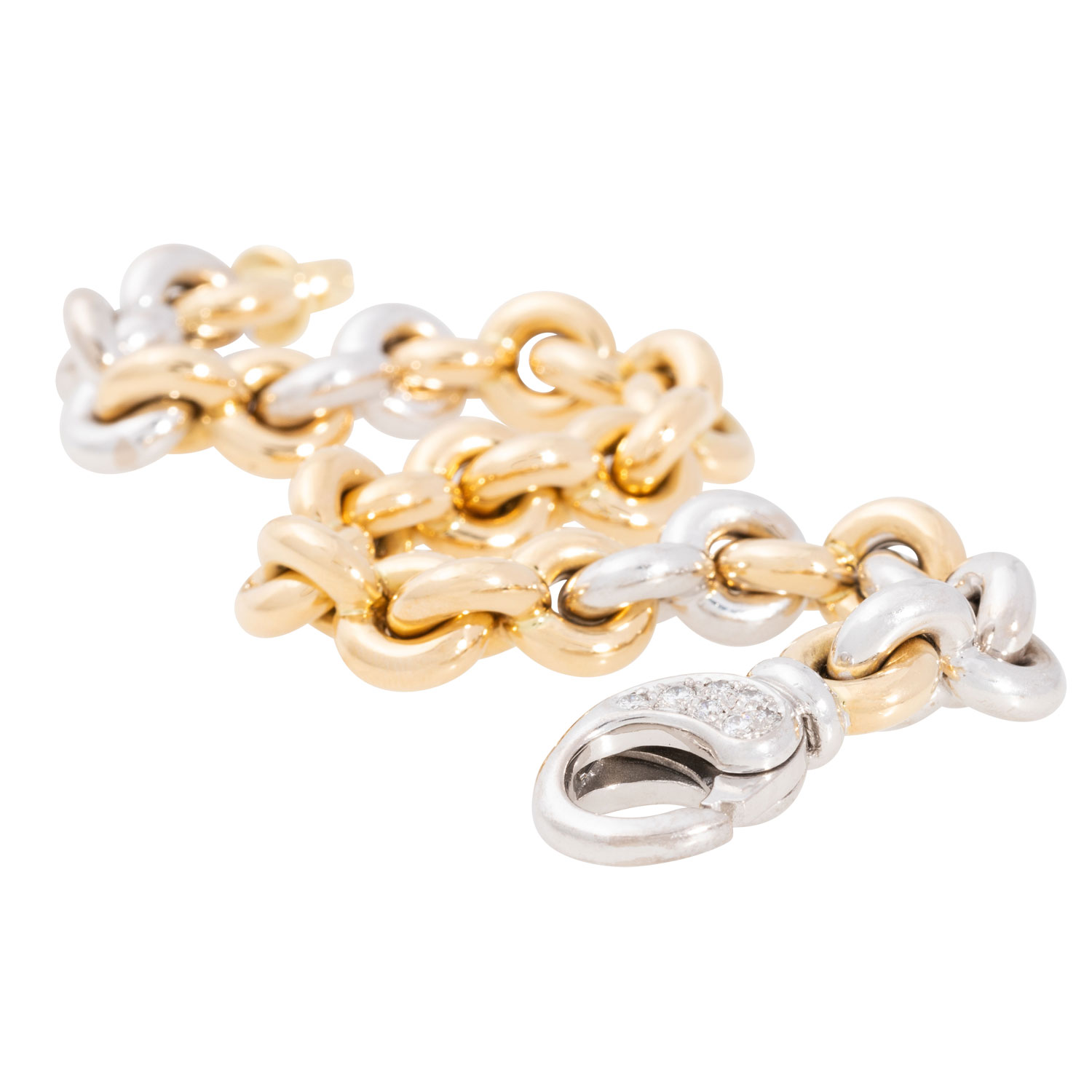 Bracelet, round anchor variation, carabiner clasp set with 14 brilliant cut diamonds, totalling ap. 0.35 ct, good colour and clarity, 18K yellow and white gold, 47.1 g, L: 20.5 cm, W: 1 cm, 20th/21st century, minimal signs of wear.