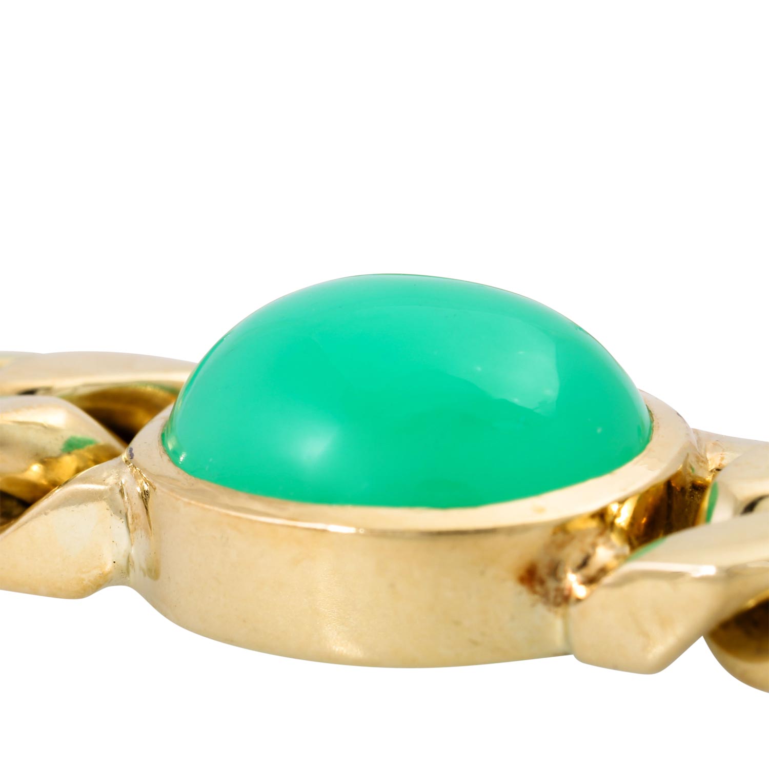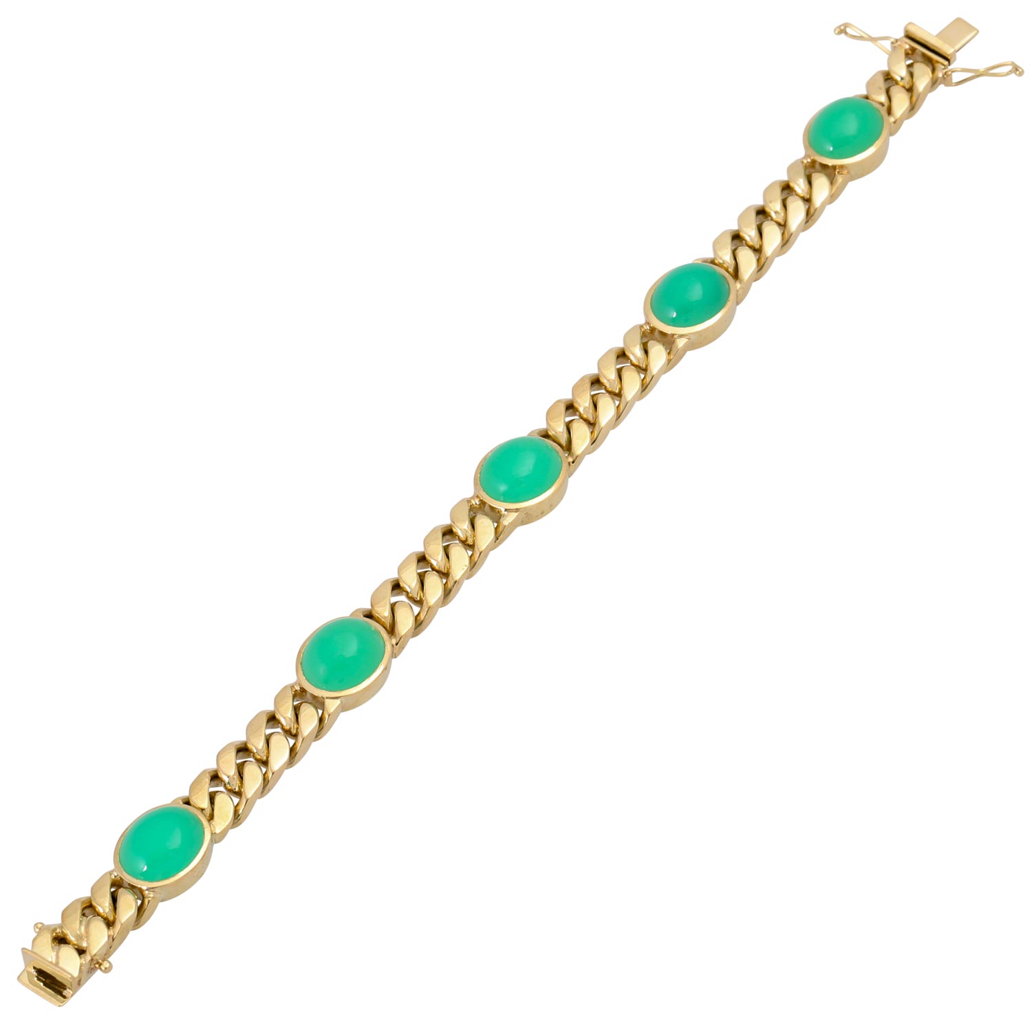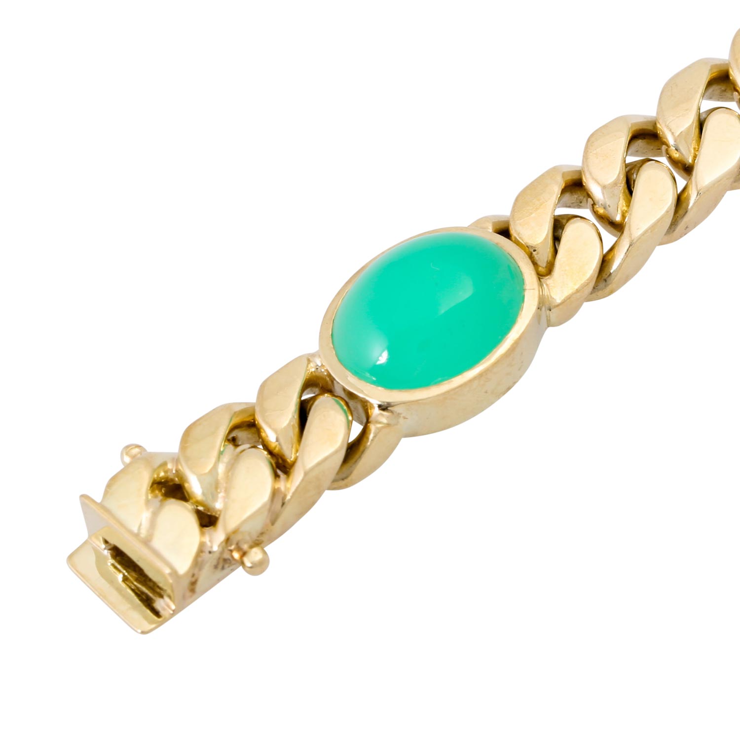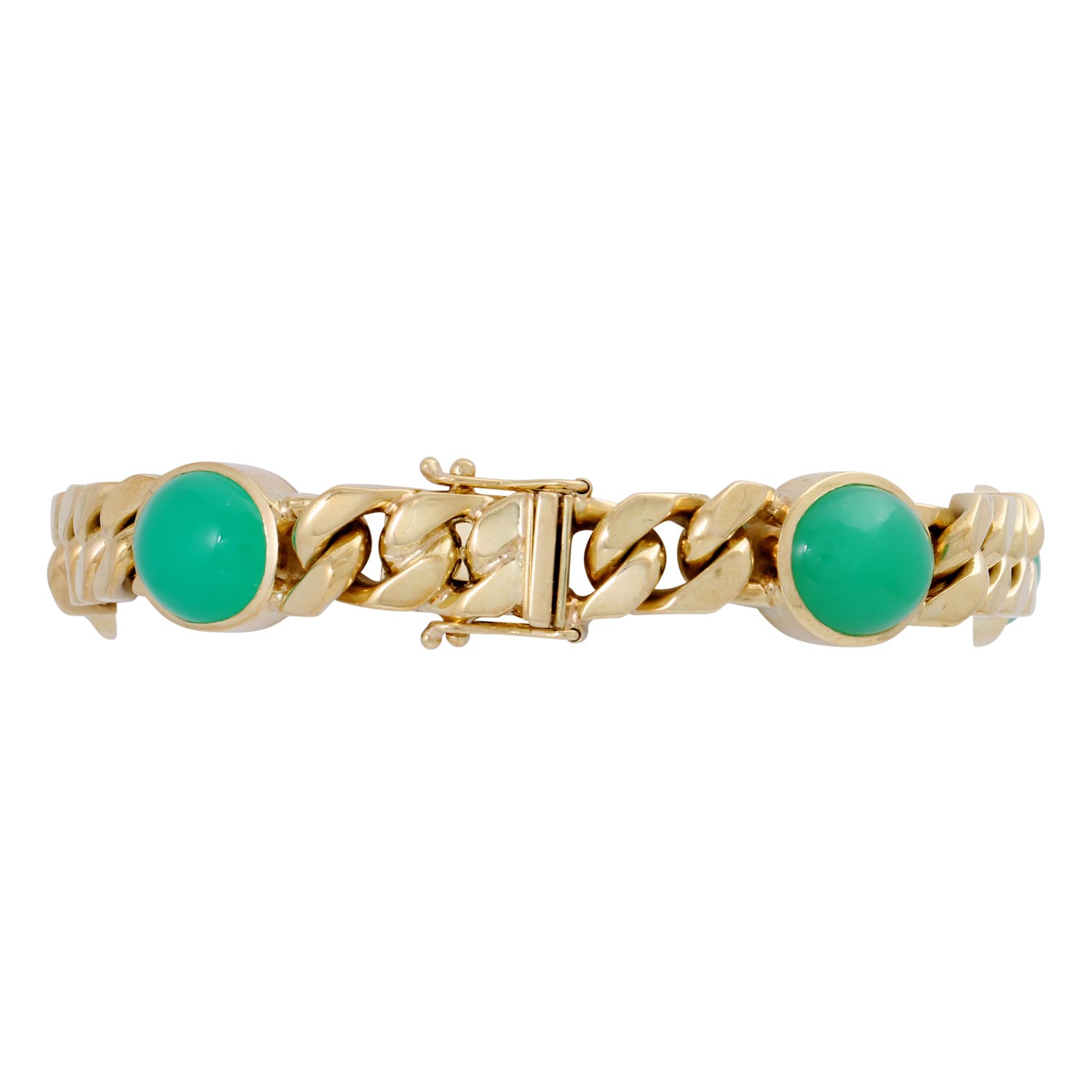 Curb link bracelet with 5 chrysoprases, cabochon cut, ca. 11.5 x 9.2 mm, GG 14K, 45g, L: ca. 19 cm, W: ca. 8.2 mm, late 20th century, slight signs of wear.