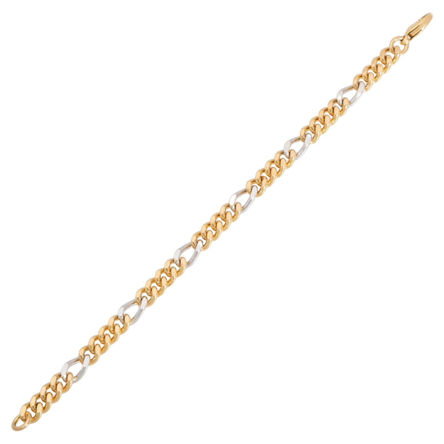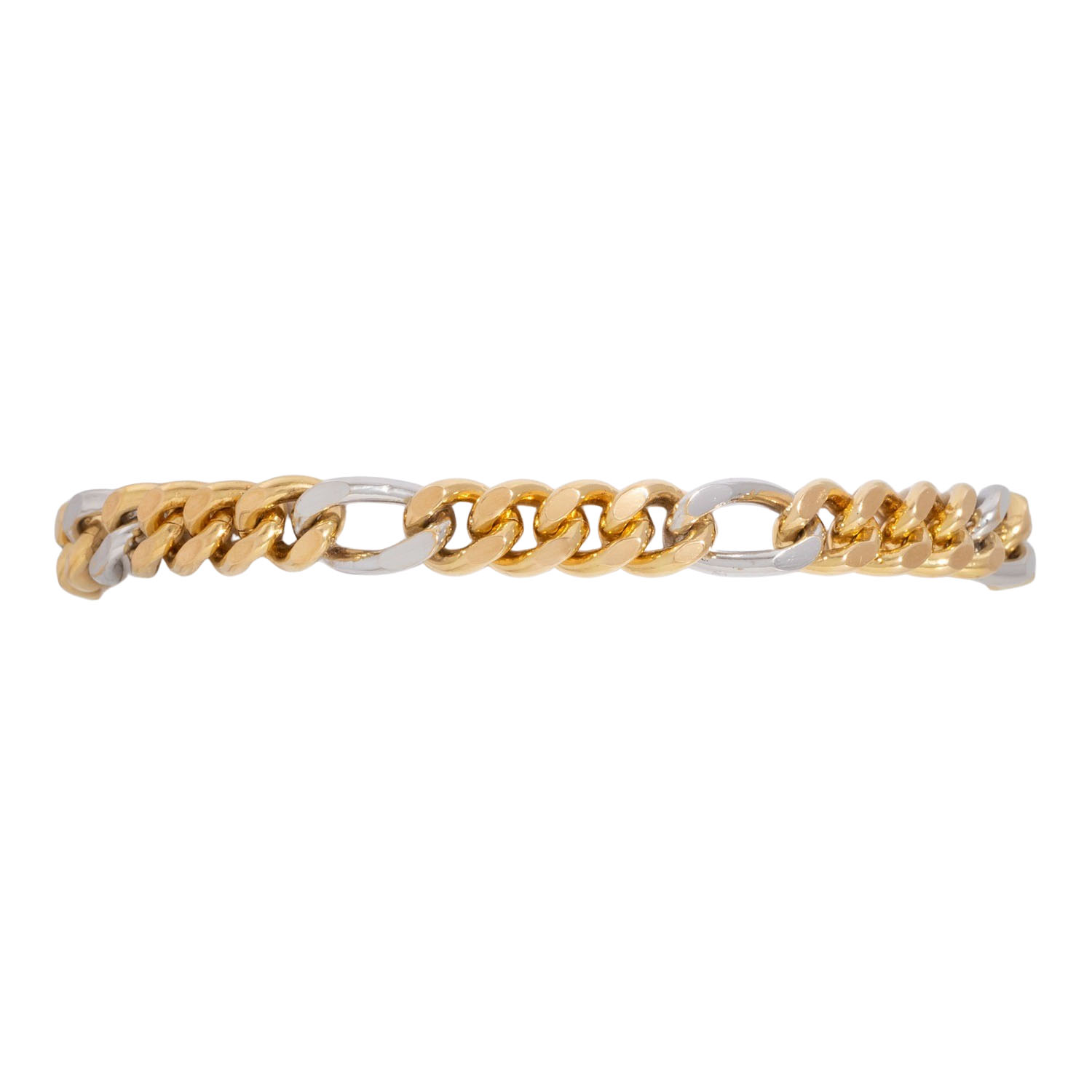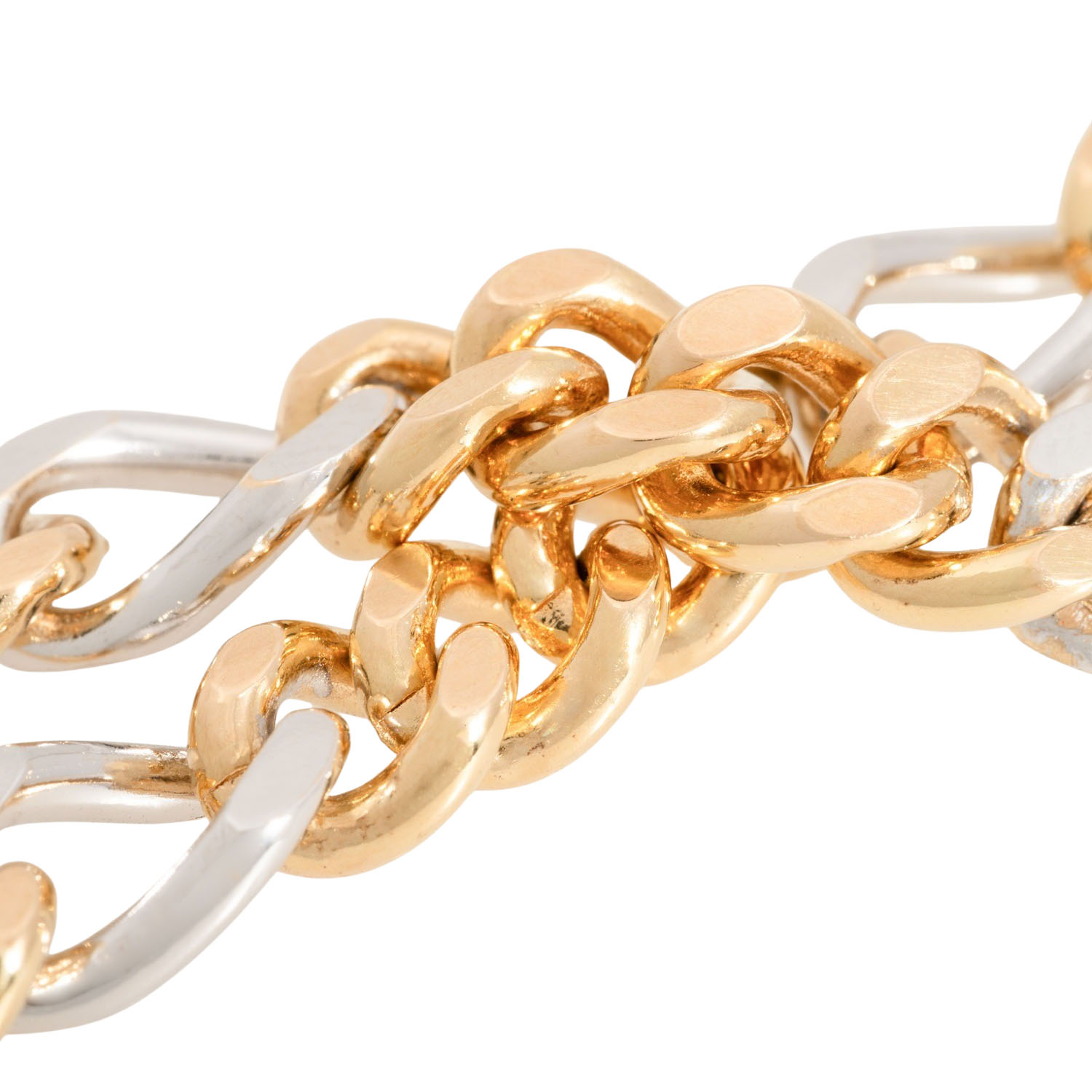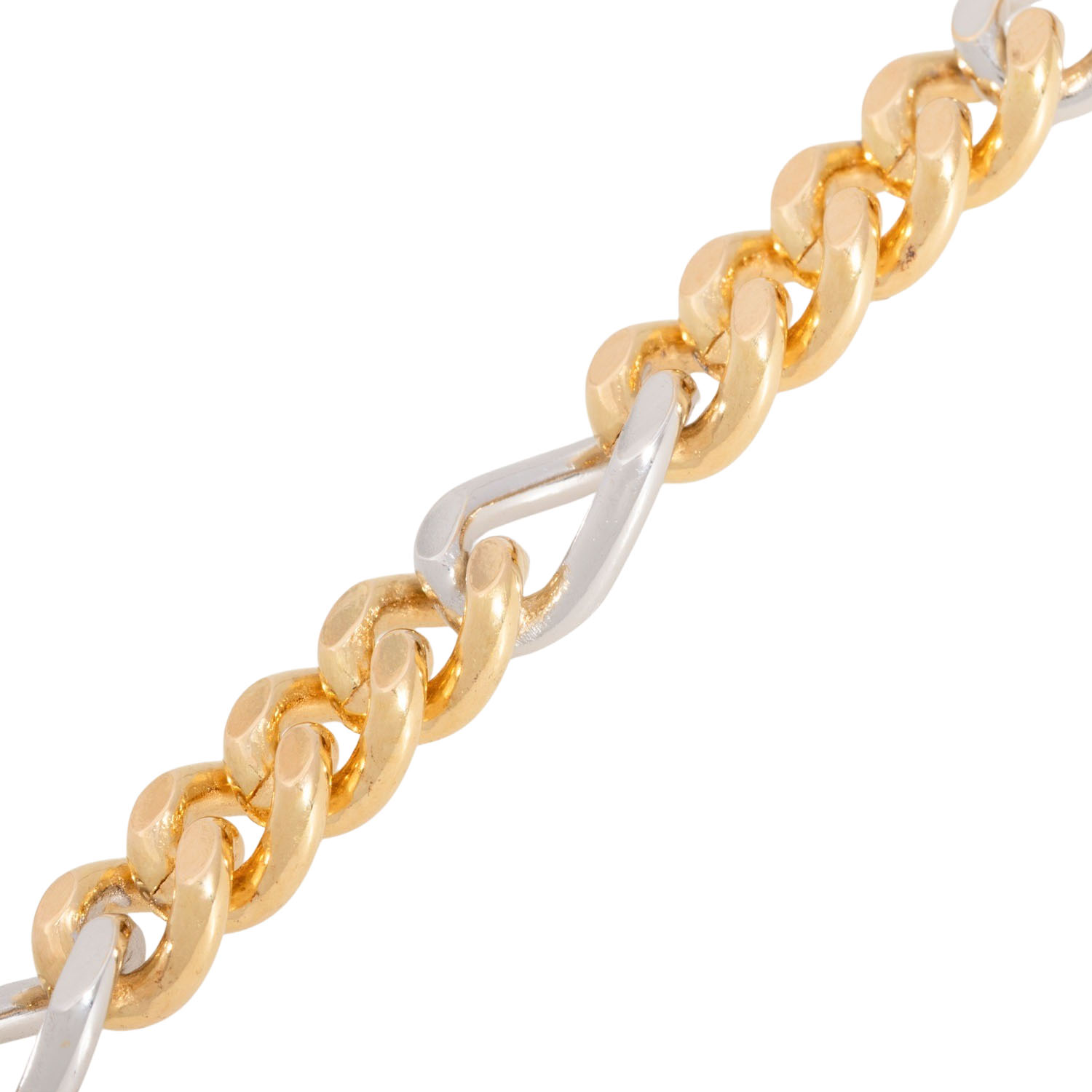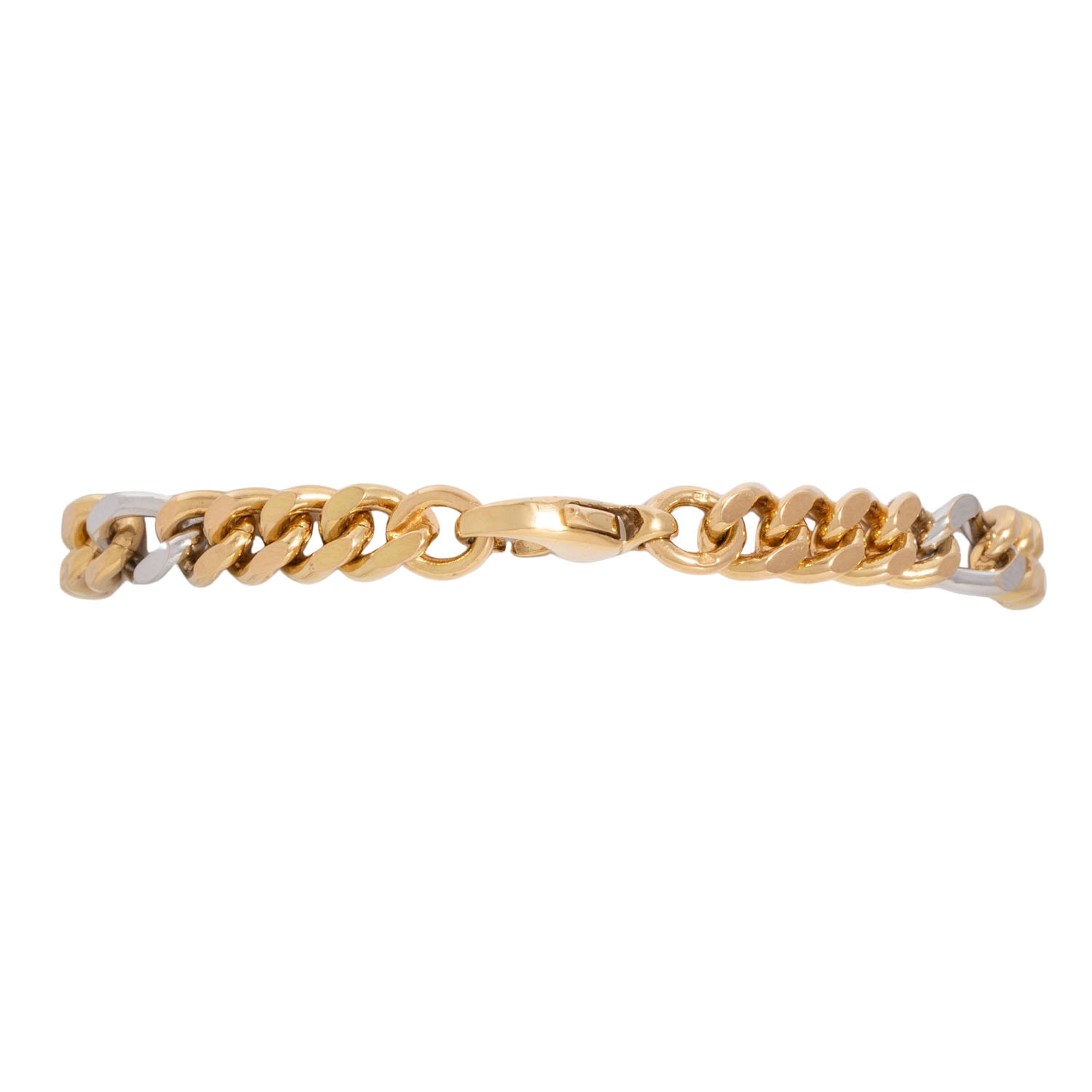 Curb link bracelet, polished, 18K yellow and white gold, 24,9 g, L: ca. 18 cm, W: ca. 6.4 mm, late 20th century, minor signs of wear, carabiner.