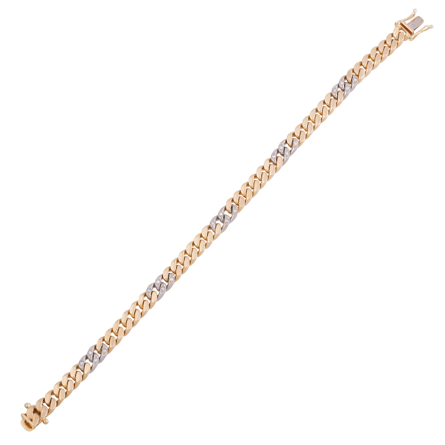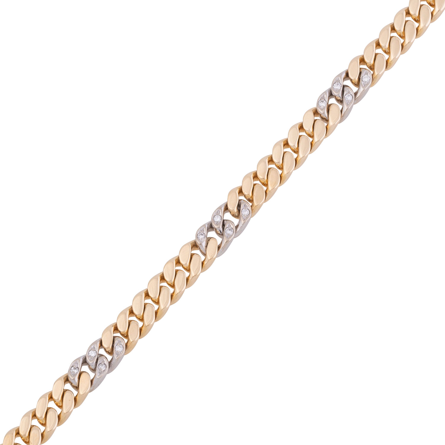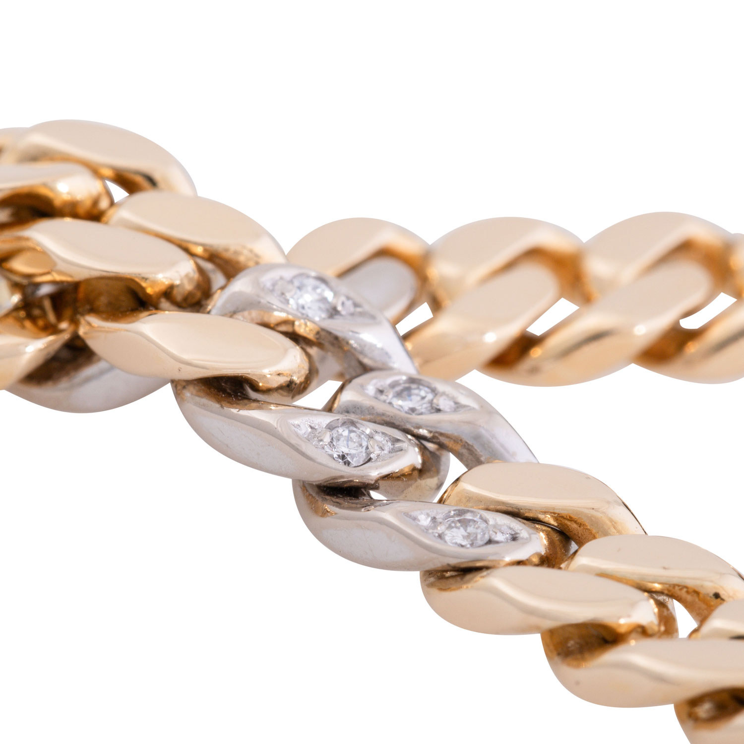 Bracelet, curb link chain, grinded, set with 20 brilliant cut diamonds, ap. 0.20 ct, good colour and clarity, 14K yellow and white gold, 21,8 g, L: 19 cm, W: ca. 6 mm, box clasp with 2 security catches, late 20th century, minimal signs of wear.