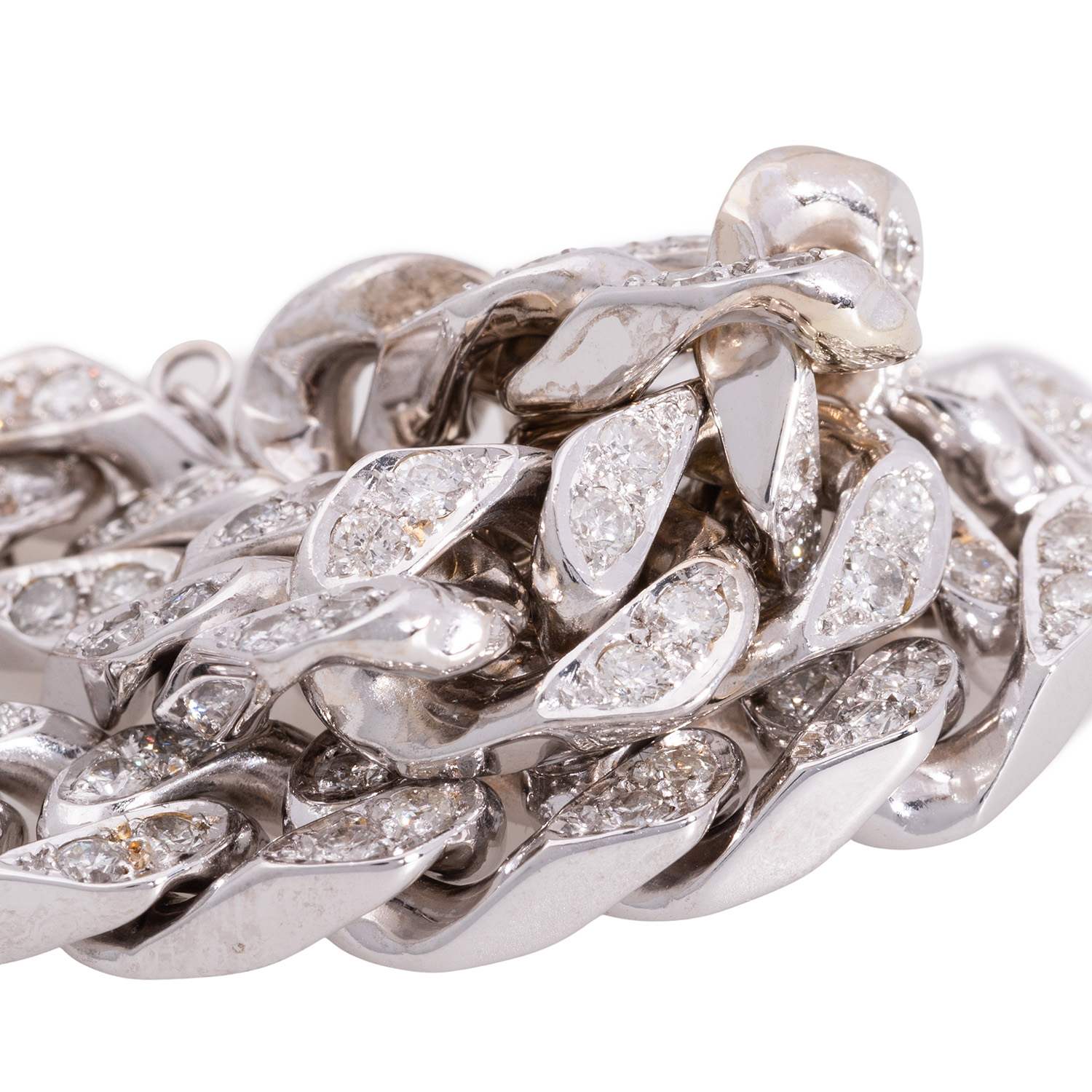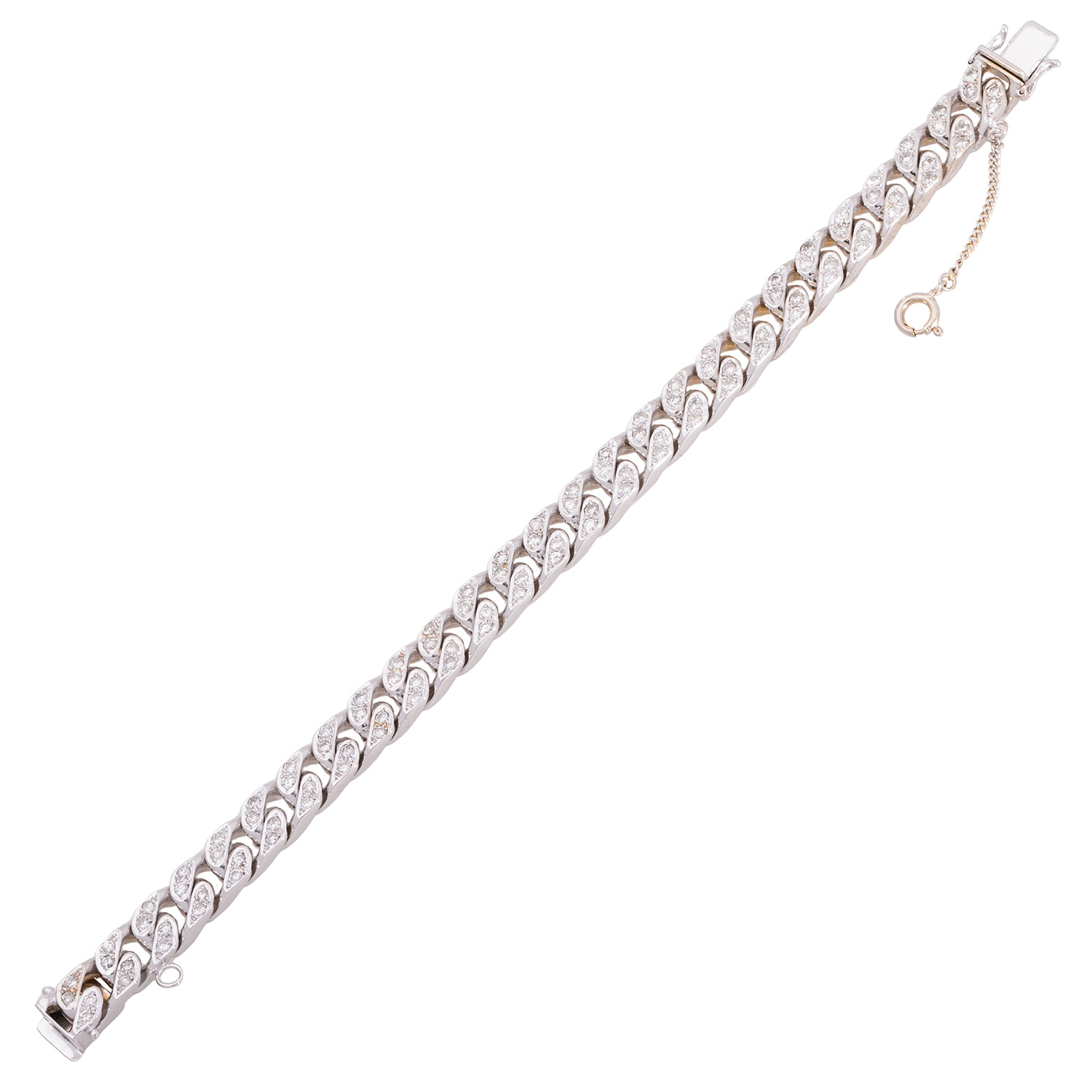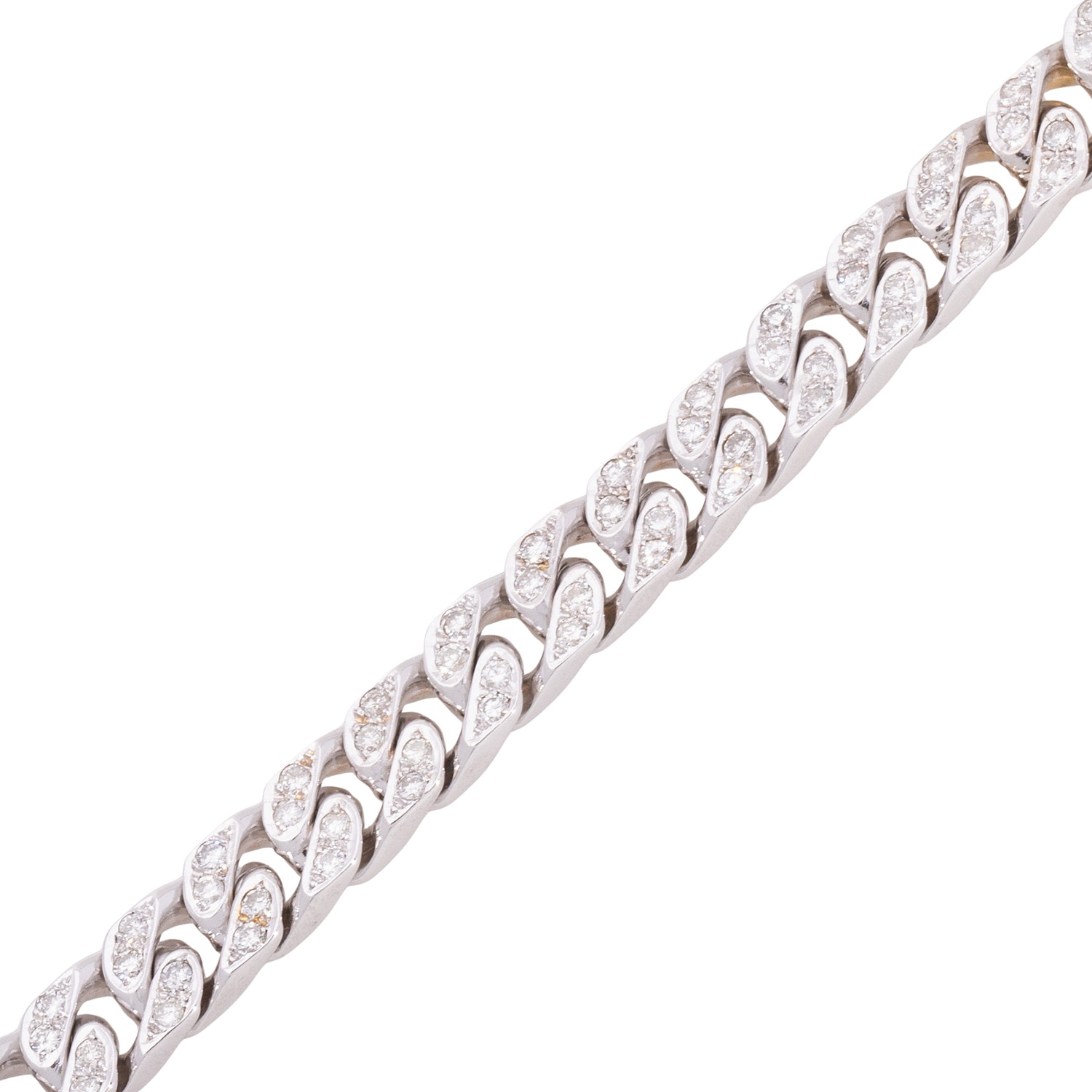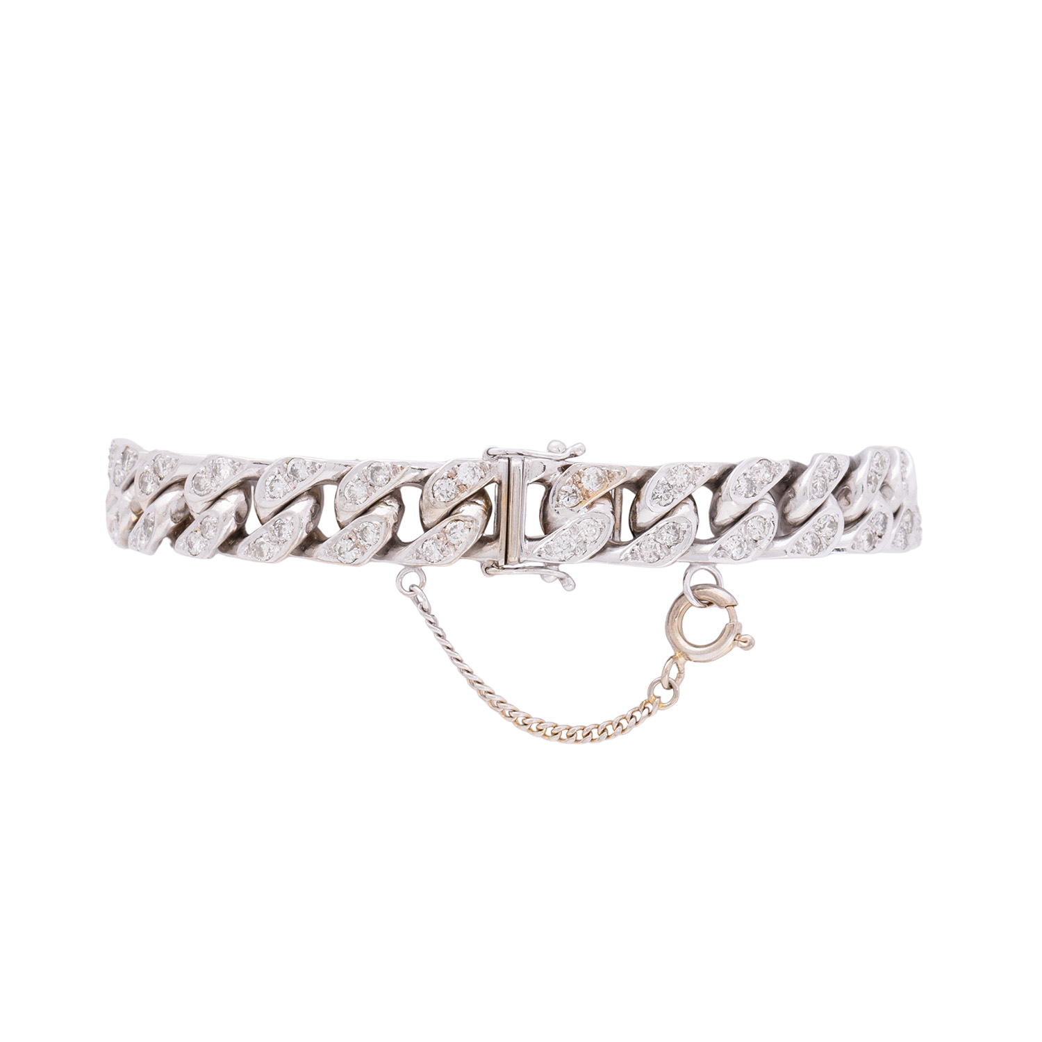 Curb link bracelet with 108 brilliant-cut diamonds totalling ca. 3.2 ct, good colour and good to medium clarity, 14 WG, 54.5 g, L: ca. 19.5 cm, late 20th century, minor signs of wear, box clasp with 2 safety catches, safety chain, 4 diamonds chipped, solid workmanship.