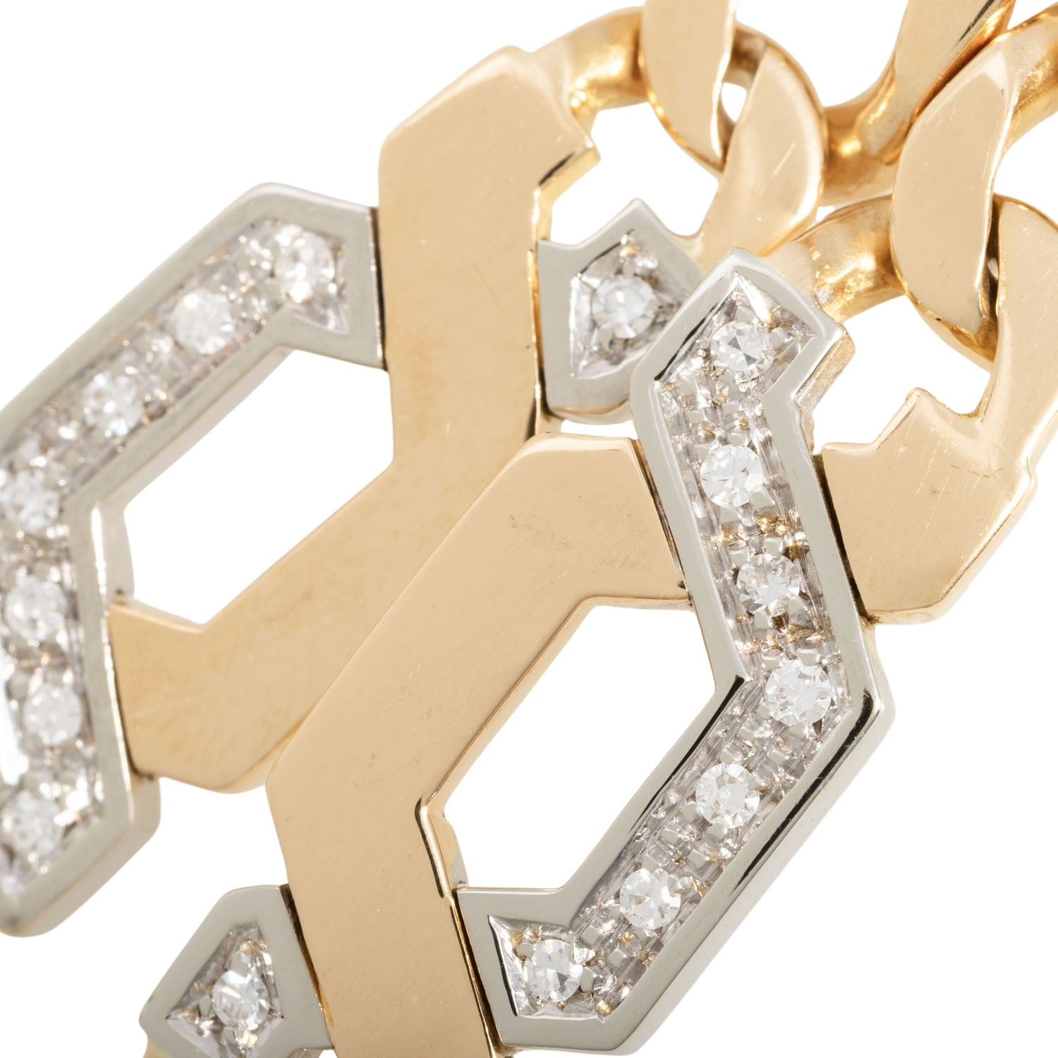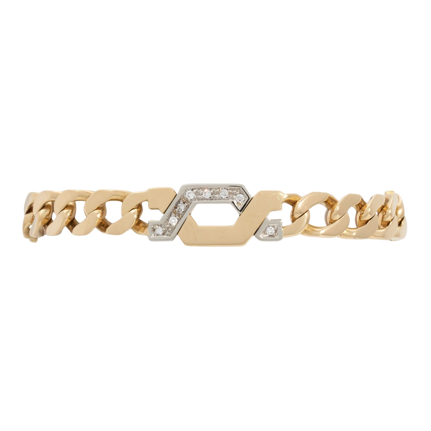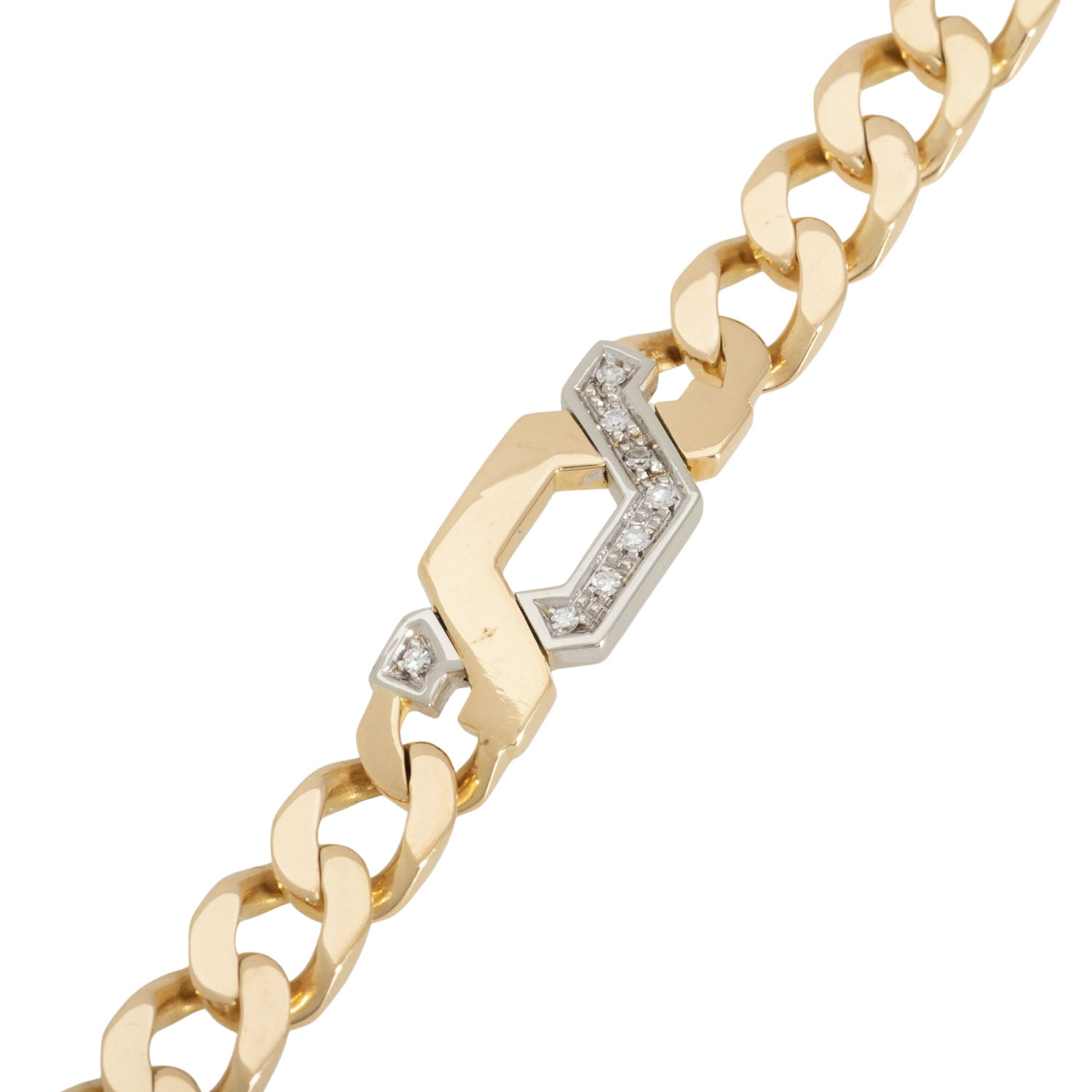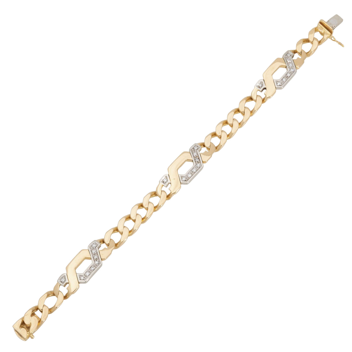 Bracelet, curb link chain with 3 intermediate links, set with 24 single cut diamonds, ap. 0.21 ct, good colour and clarity, 18K yellow and white gold, 37.6 g, L: 18.8 cm, W (intermediate link/curb link): 11/8 mm, box clasp, safety catch, late 20th century, minor signs of wear.