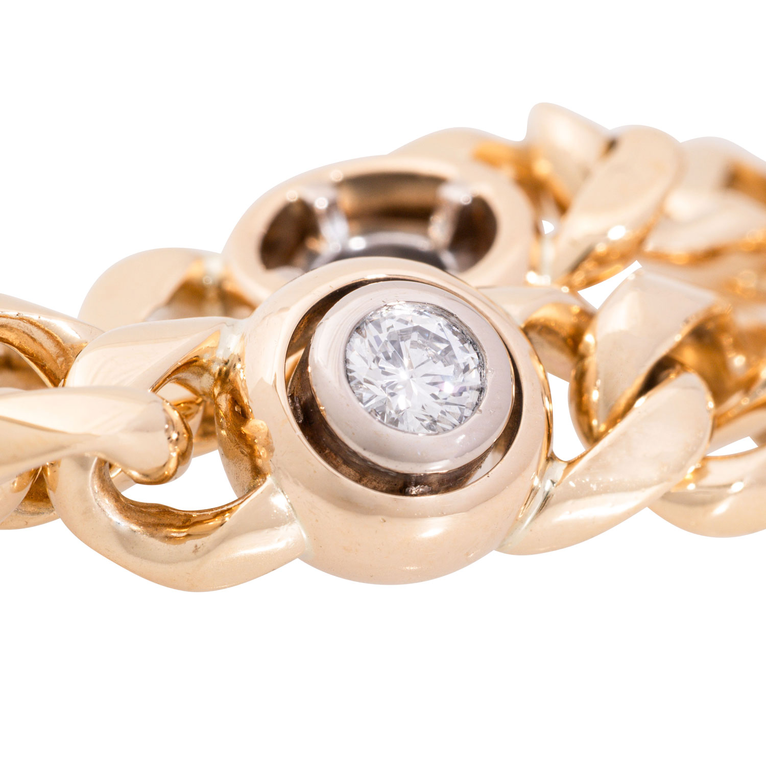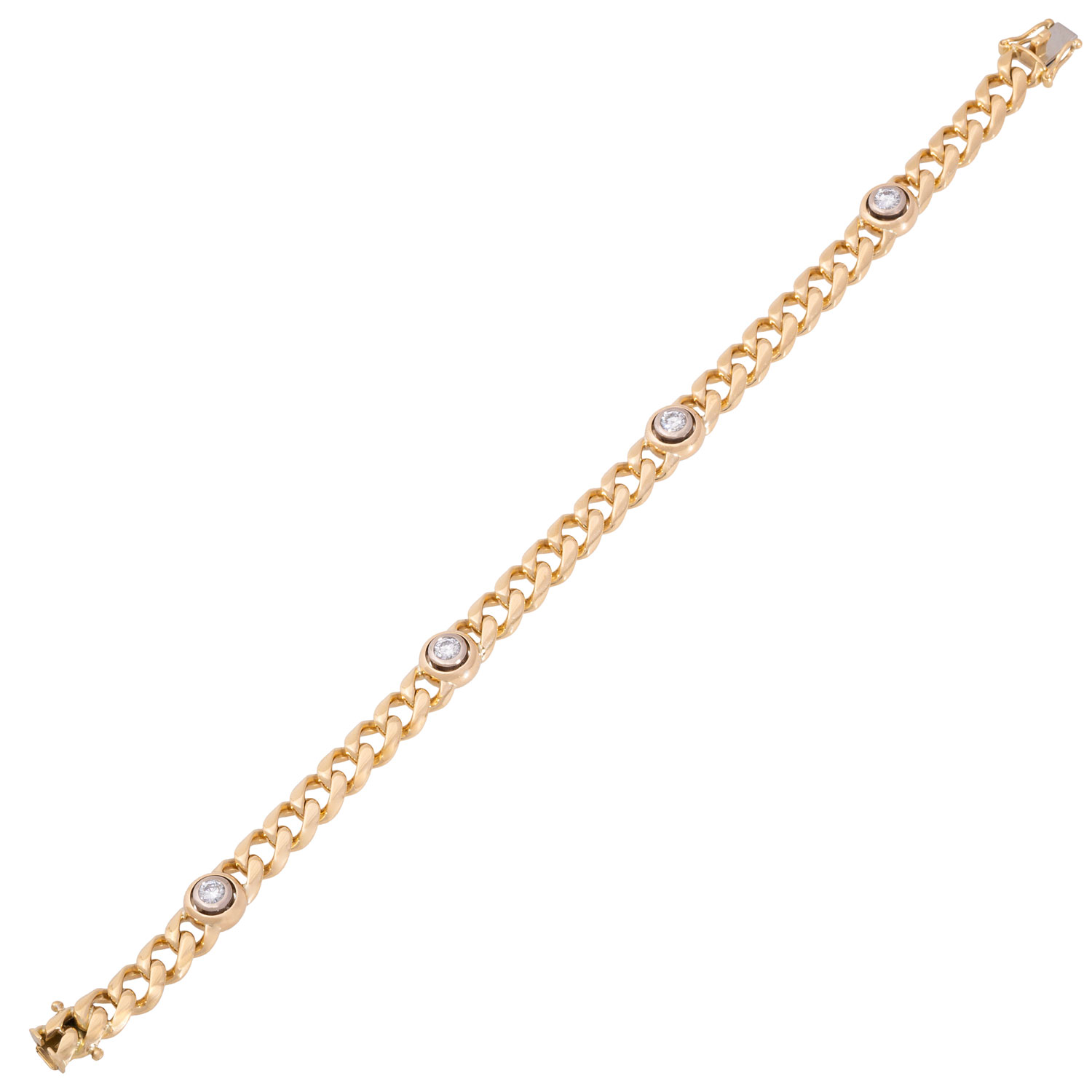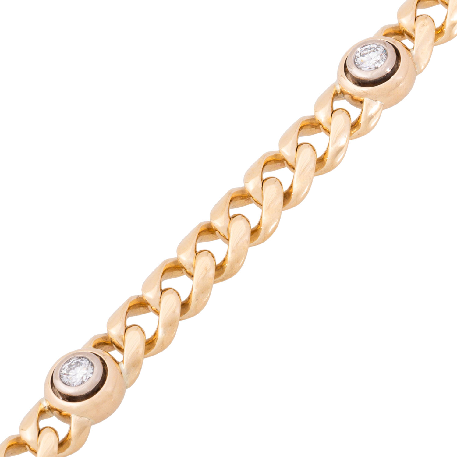 Curb bracelet with 4 brilliant-cut diamonds totalling approx. 0.60 ct, RW (F-G)/VS, 18K yellow gold/white gold, 36,4 g, L: approx. 21 cm, W: approx. 7.2 - 8.6 mm, end of 20th century, signs of wear, with hallmark 'Be'. Handcrafted.