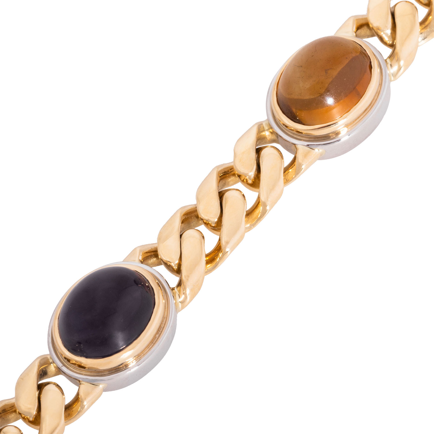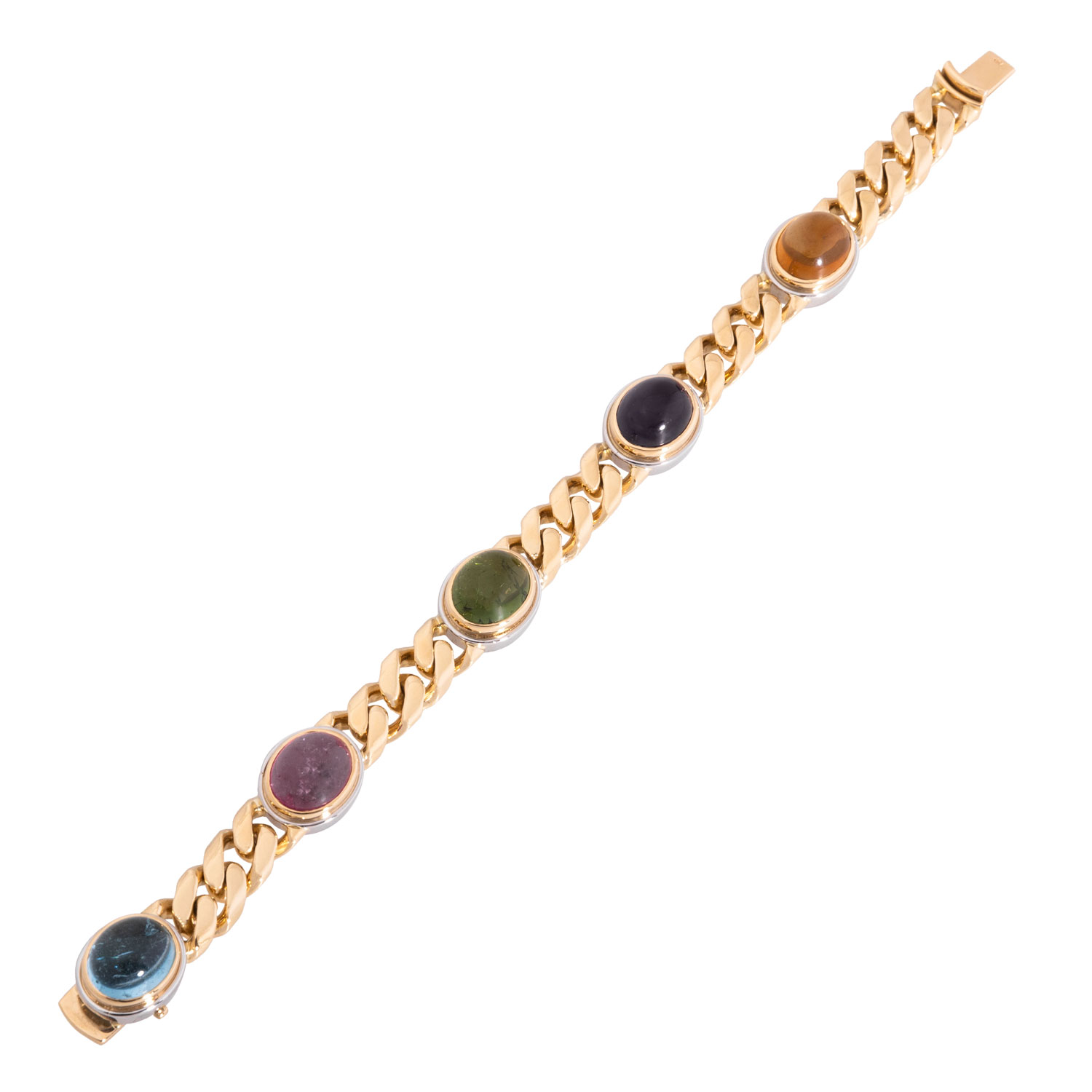 Bracelet, curb link chain with 5 oval cabochons, citrine, amethyst, olivine, tourmaline, topaze, ap. 12 x 9.5 mm, 18K yellow gold 63.0 mm, L: 18.5 cm, box clasp with upside security flap, late 20th century, minimal signs of wear.