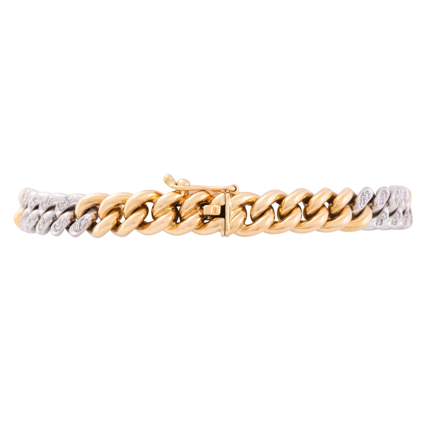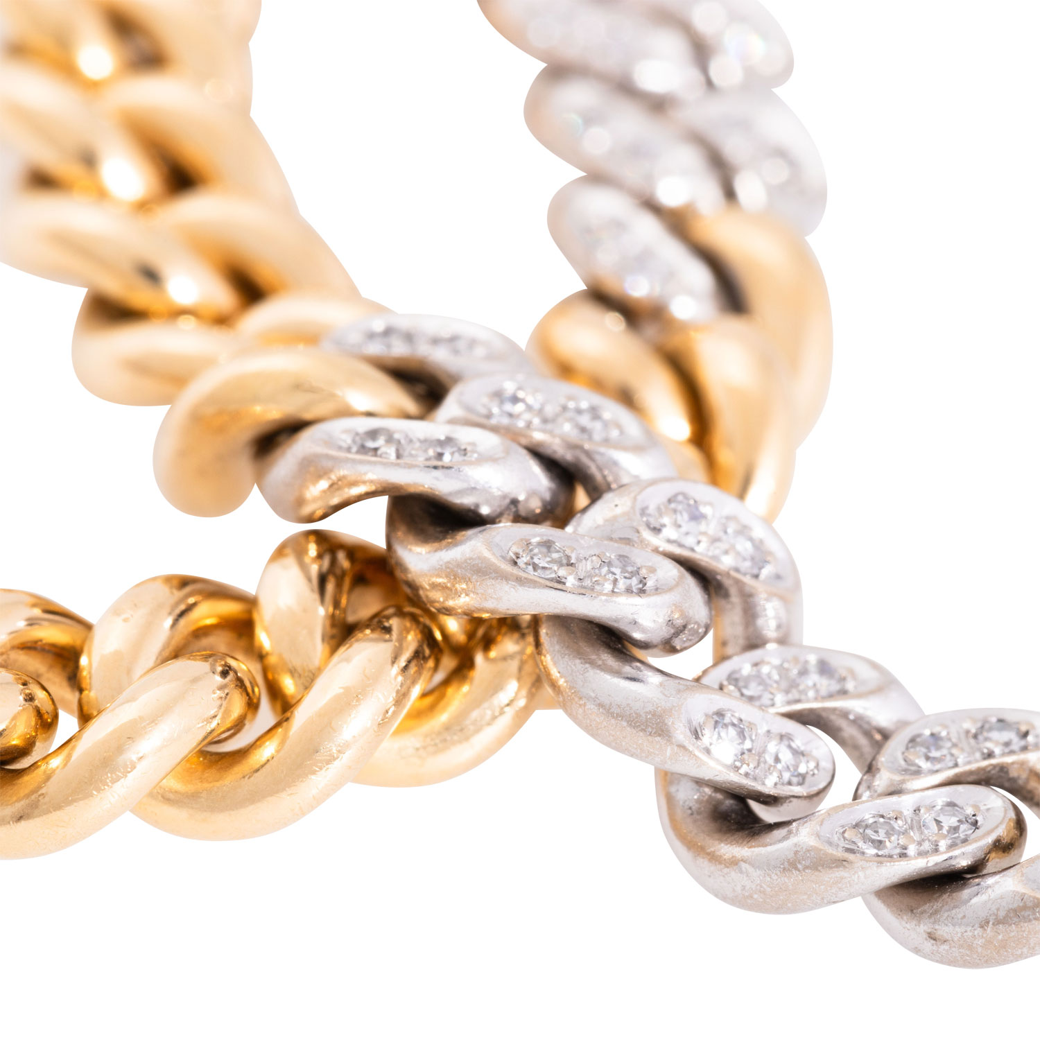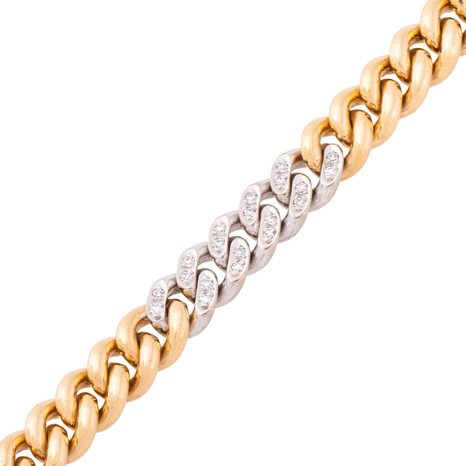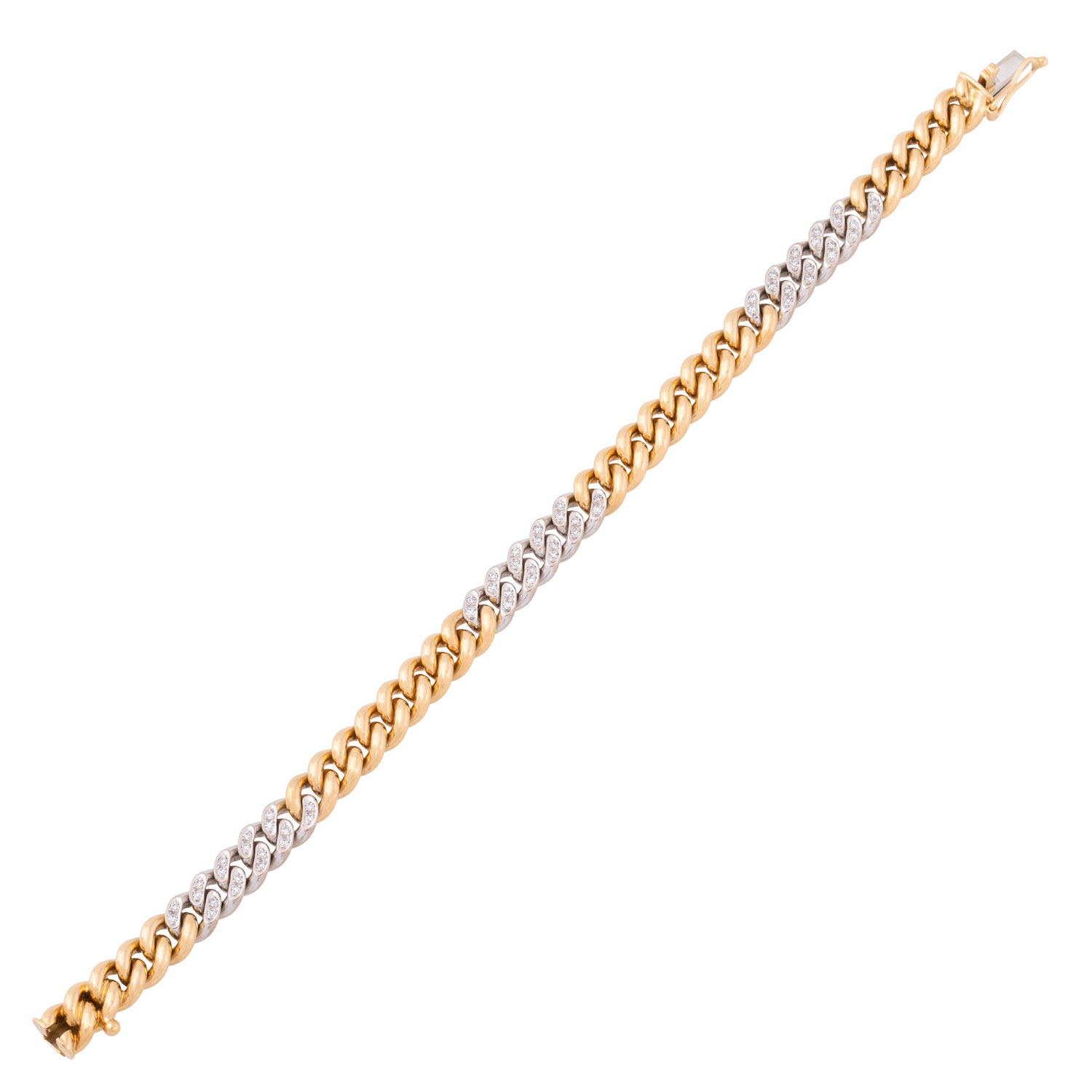 Curb link bracelet with 60 single-cut diamonds totalling ca. 0.30 ct, ca. STW (I-J)/VS, 18K yellow gold/white gold, 38.6 g, L: ca. 18 cm, W: ca. 6.9 mm, end of the 20th century, minimal signs of wear, with hallmark, solid work.