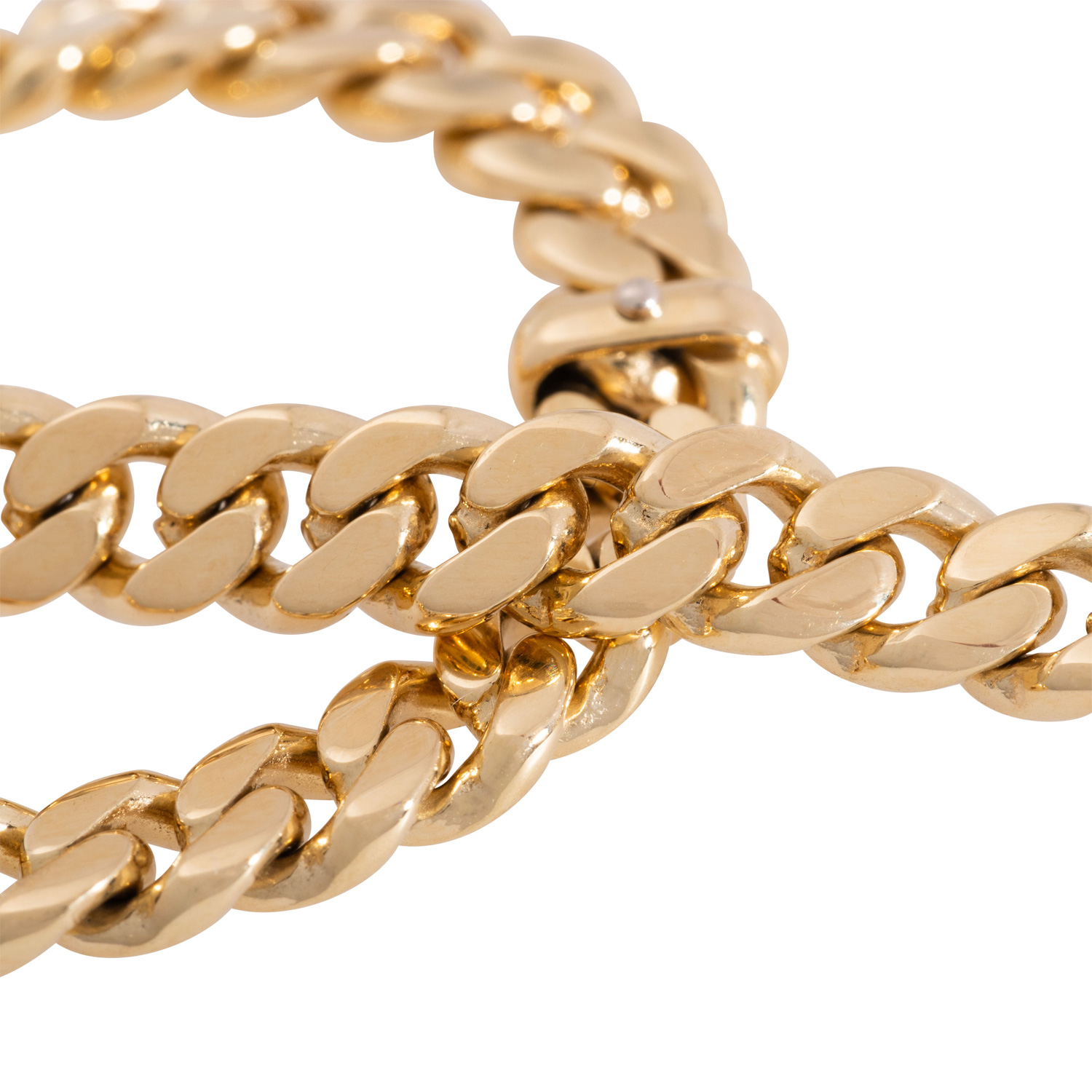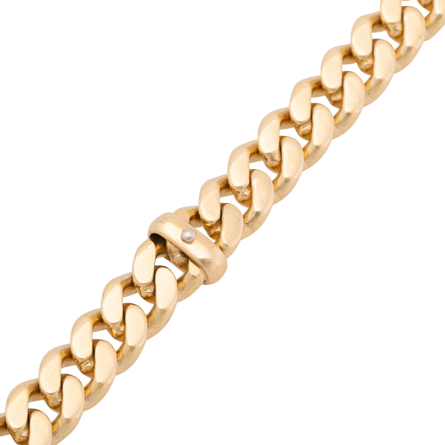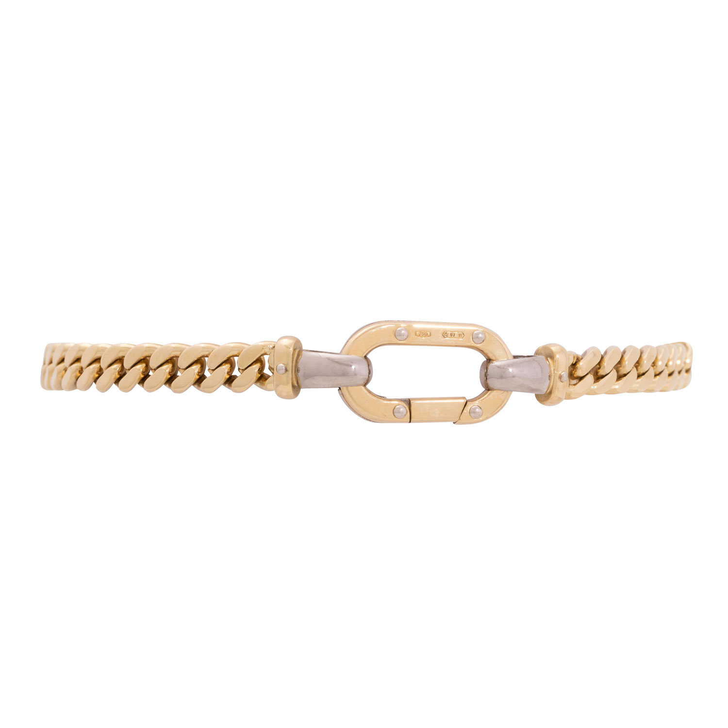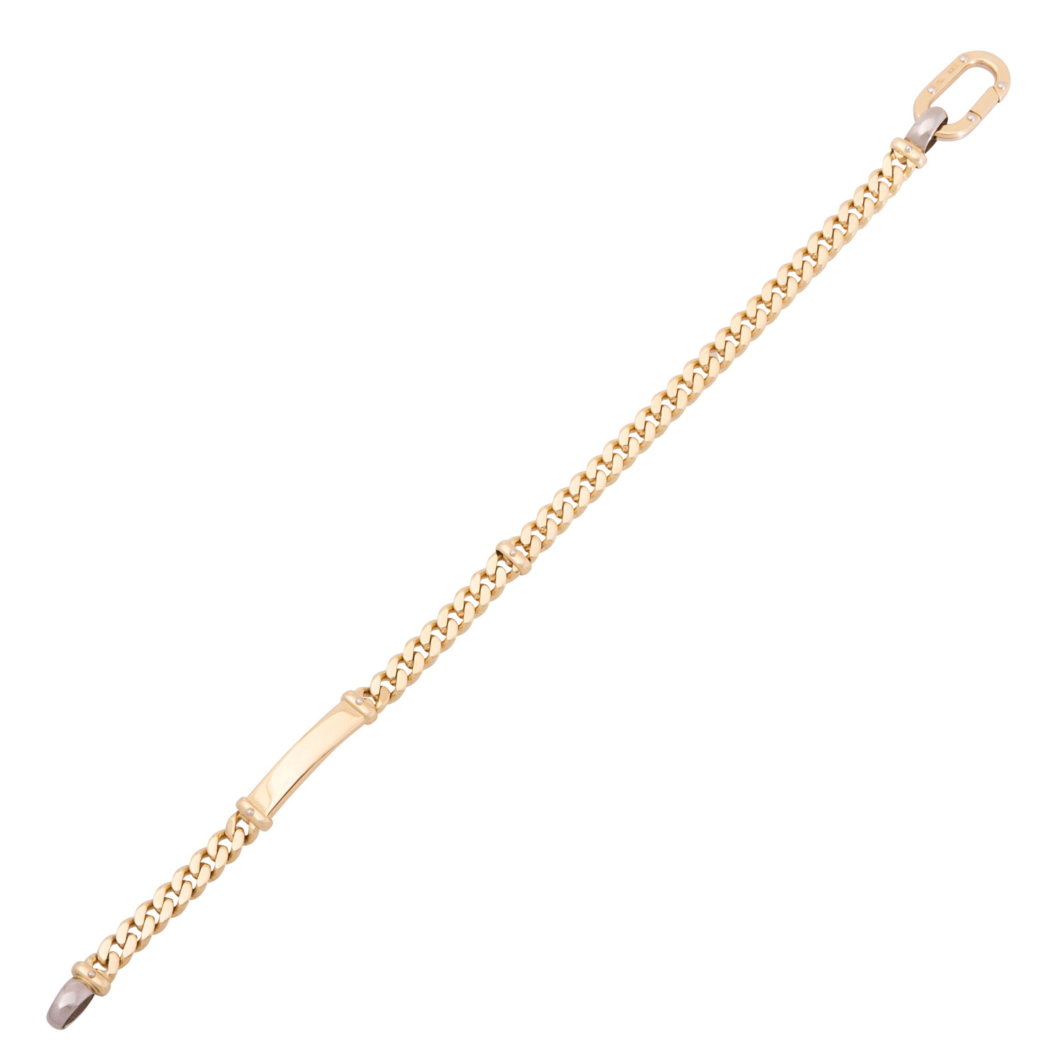 Curb link bracelet with engraving plate, grinded, polished, 18K yellow gold/white gold, 24.5 g, L: ca. 21 cm, W: ca. 0.5 cm, 21st century, minimal signs of wear, with Italian maker's hallmarks, engraving plate hallmark on the backside: 'SIGNORETTI', carabiner hallmark: 'BREVEL'.