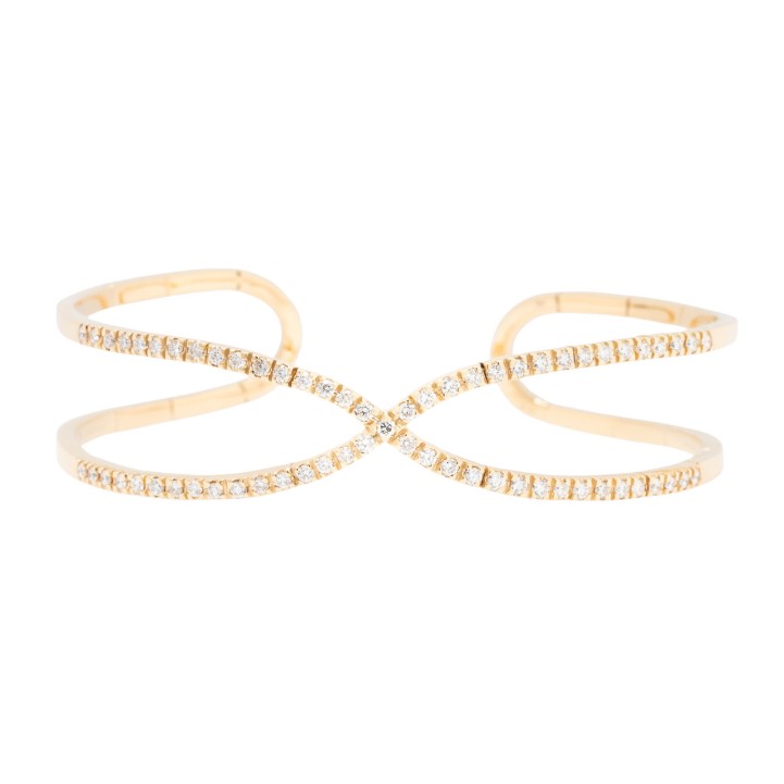 Bangle with 65 brilliant-cut diamonds, 1.10 ct, WHITE (H)/SI, YG 18 K, 19.5 g, IU: 18.5 cm, 21st century. Mint condition.
