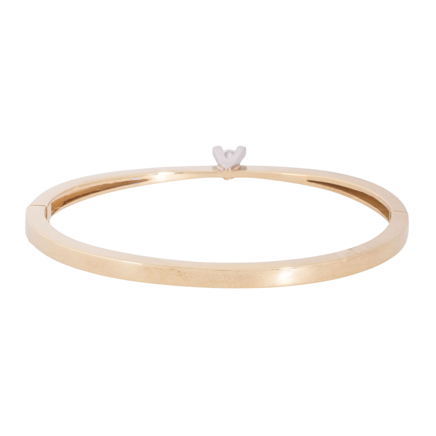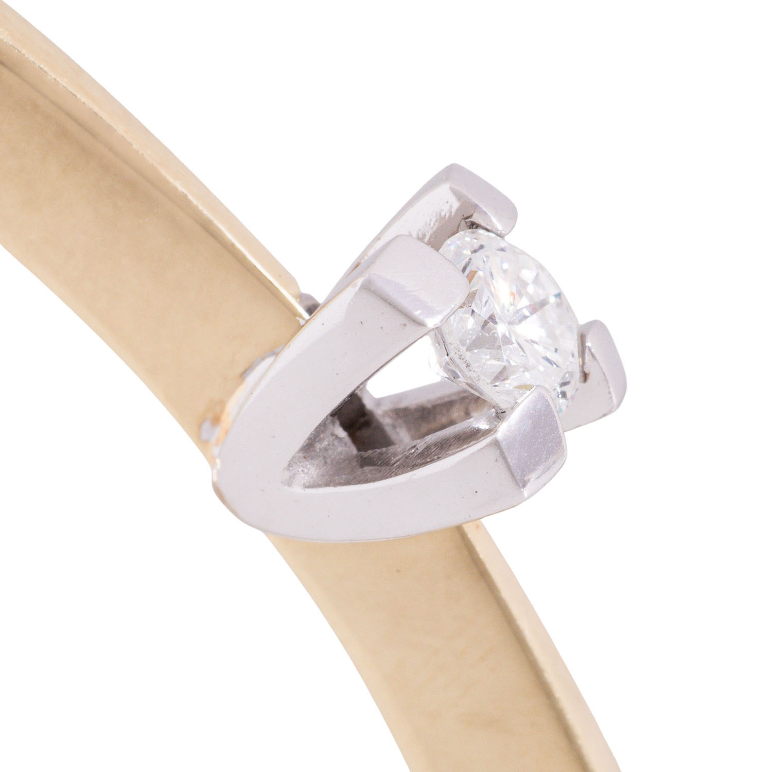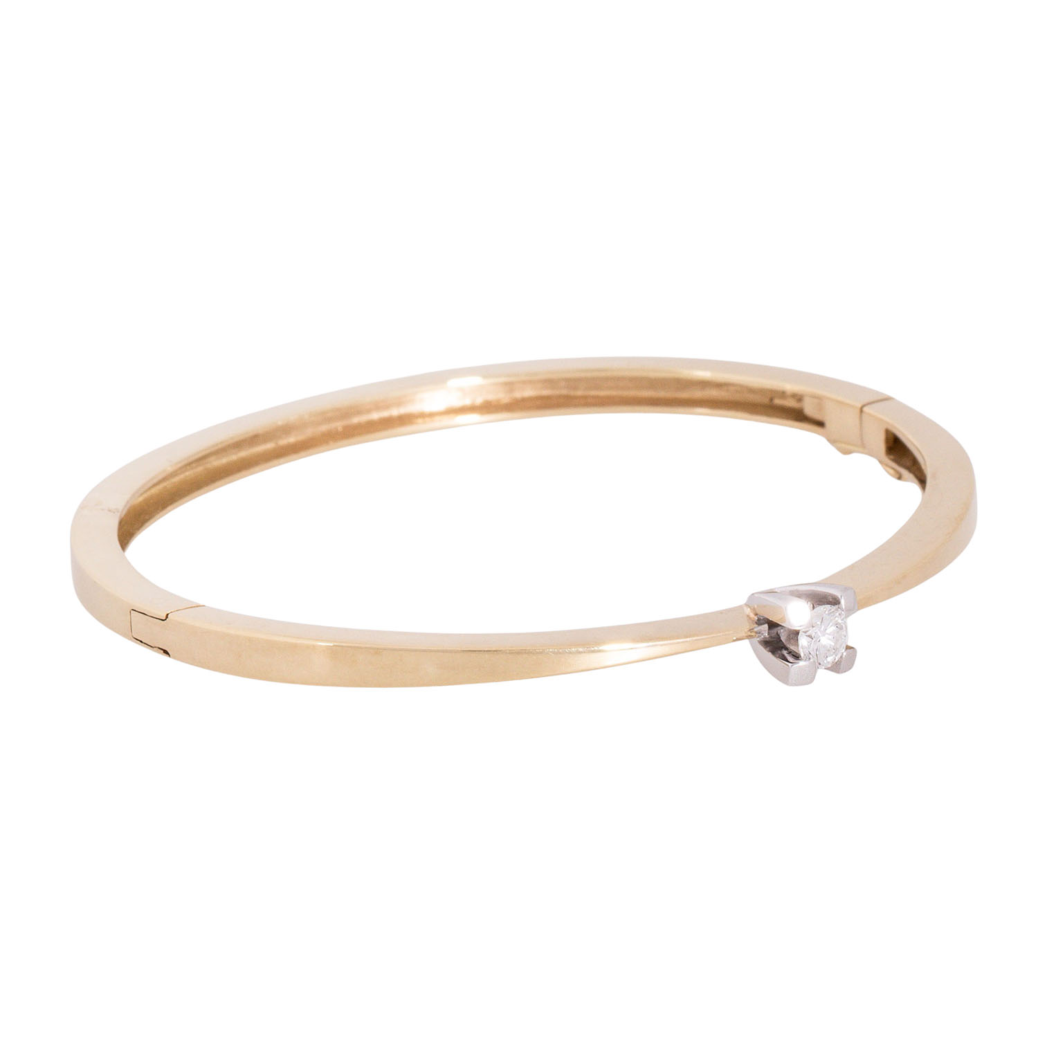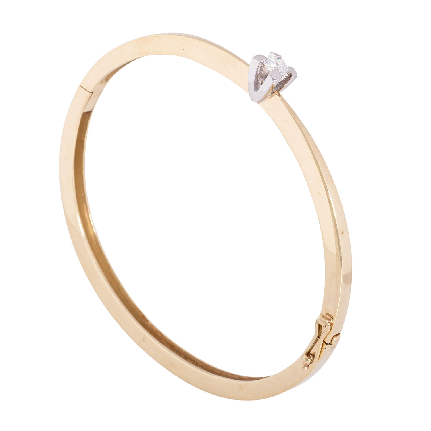 Bangle with brilliant-cut diamond 0.31 ct (engraved), RW-WHITE (F-H)/SI-P, 14K yellow gold/white gold, 16.1 g, inner circumference: approx. 17 cm, W: approx. 3.5 - 5.7 mm, around 1970, minimal signs of wear, with hallmark.