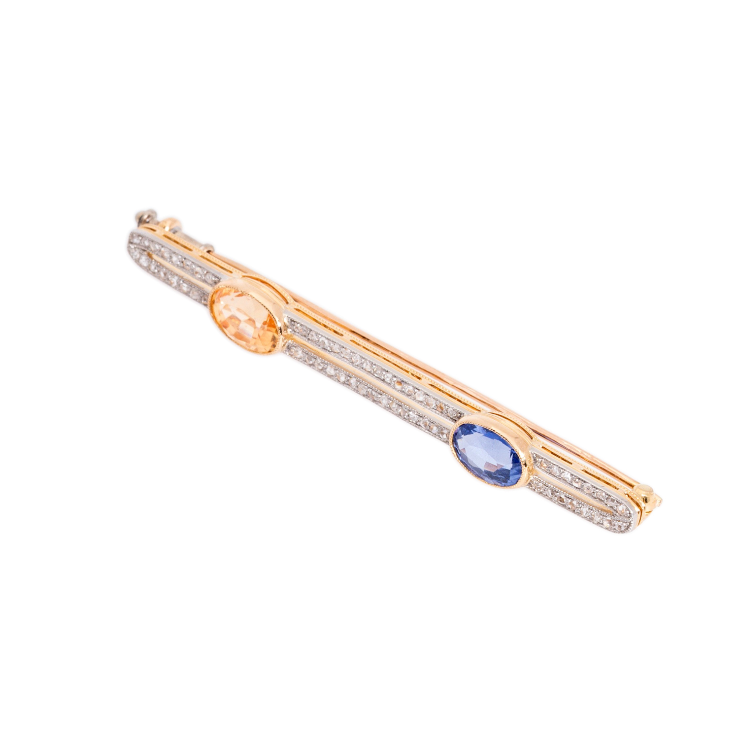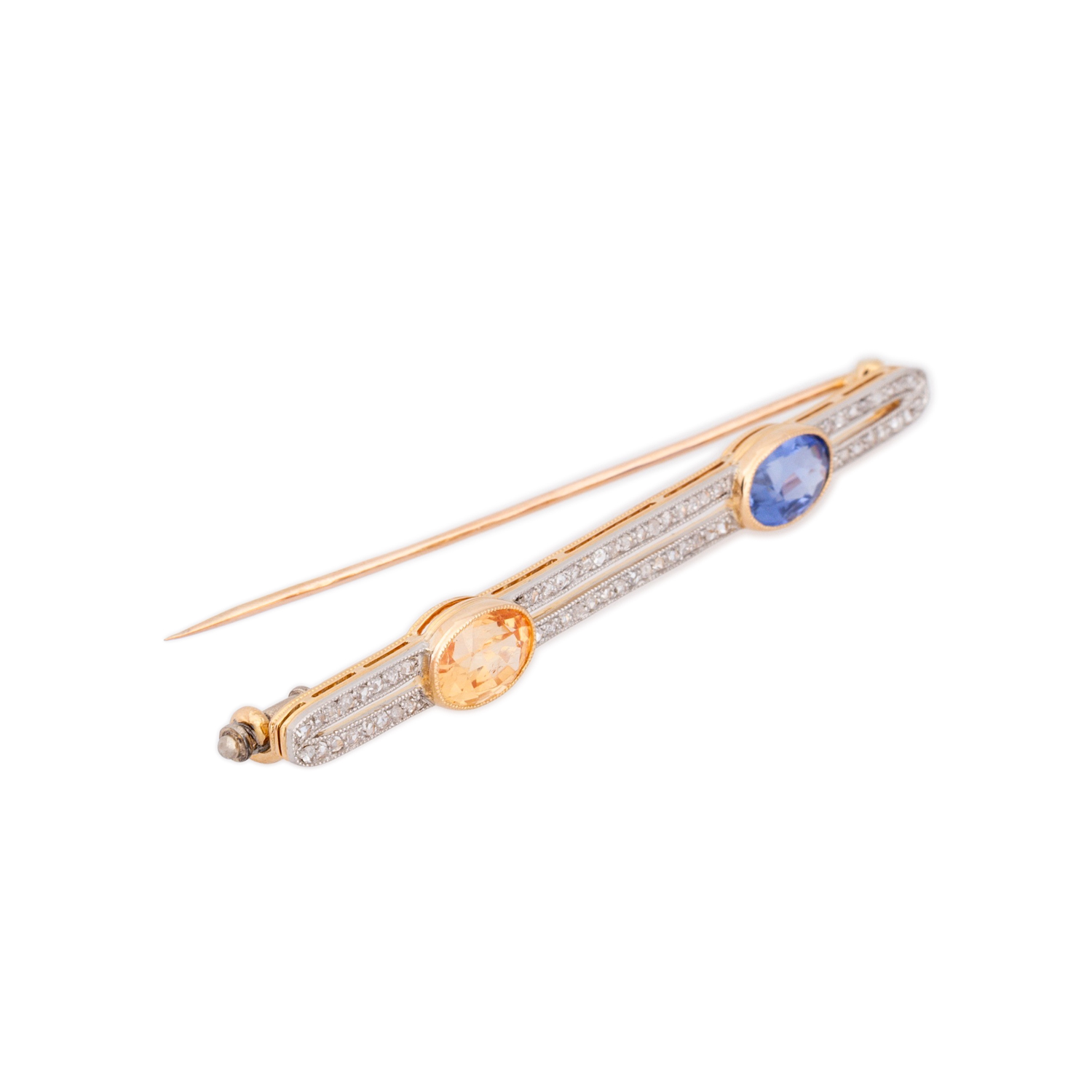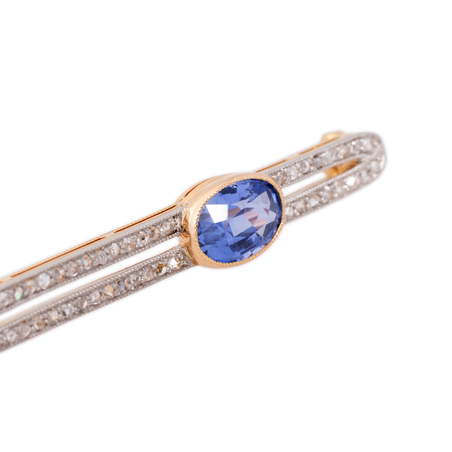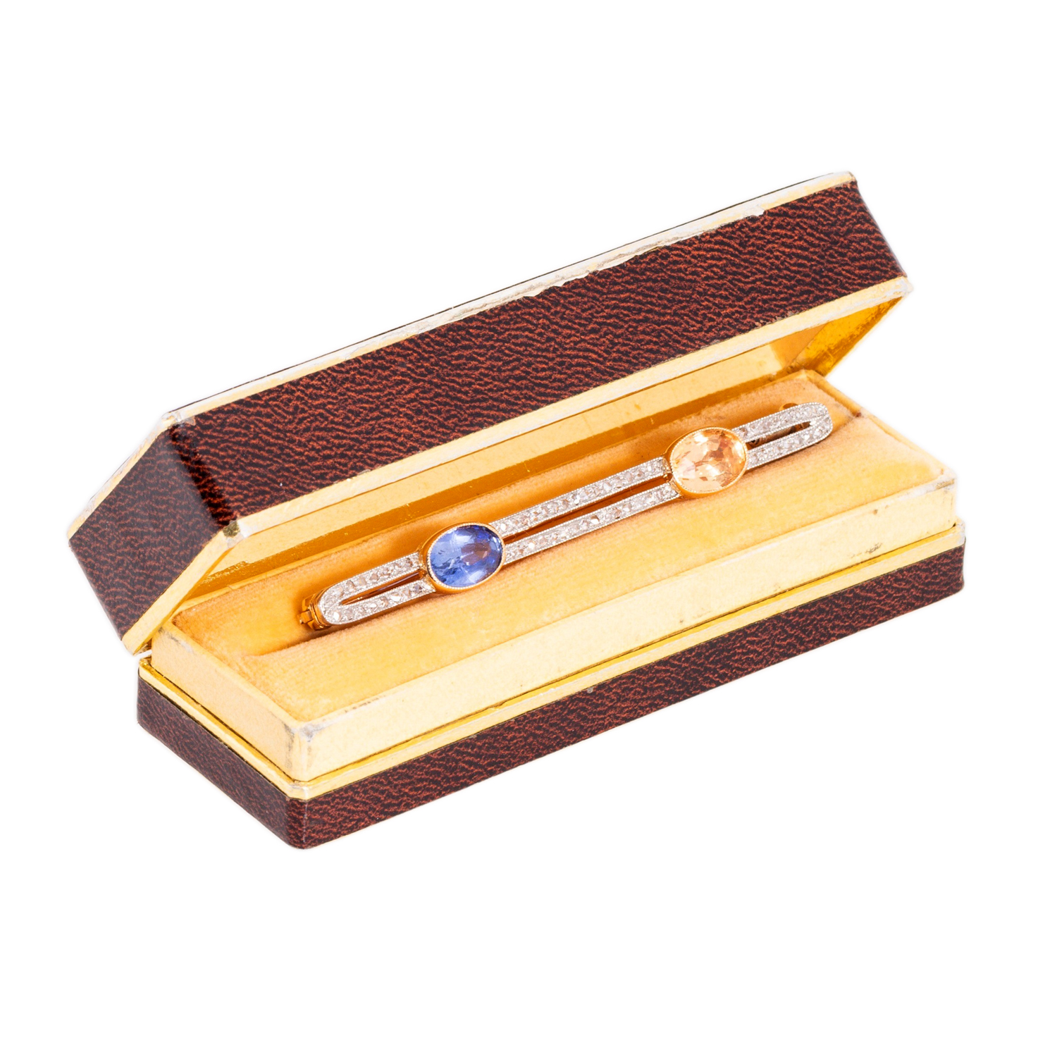 Art Déco brooch with 2 fine oval faceted sapphires totalling ca. 2.5 ct, blue sapphire without signs of heating, 14K yellow gold, face side platinum, needle of 18K rose gold, 6.3 g, safety brooch accessoire from later times, silver, fixed in hook with tin-solder, 6.4x0.5 cm, around 1930, minor signs of wear, in an antique small box (jeweller Pfister, Stuttgart).