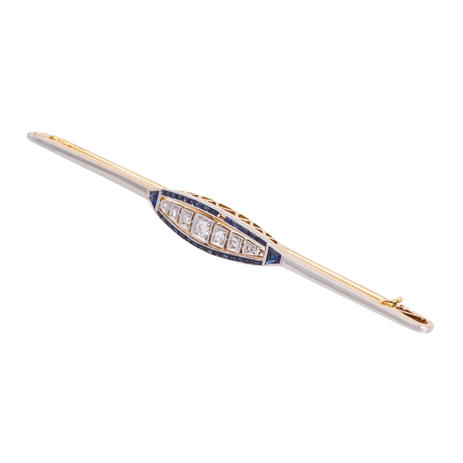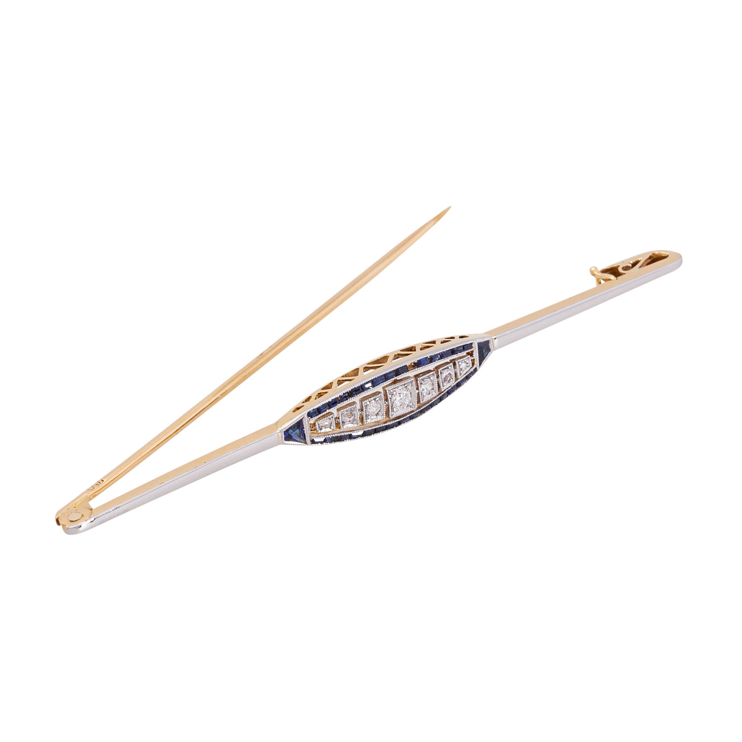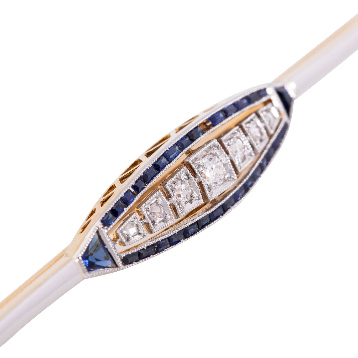 Art Deco brooch with 31 sapphires, 3 old-european-cut diamonds and 4 rose-cut diamonds totalling ca. 0.08 ct, ca. WHITE -STW(H-J)/SI, 2 trapezoid-cut sapphires, 29 baguette-cut sapphires, 1 stone missing, 18K yellow gold, 4.2 g, faceside platinum, L: ca. 71 mm, W: ca. 1 - 6 mm, 1st half of the 20th century, good condition for its age.
