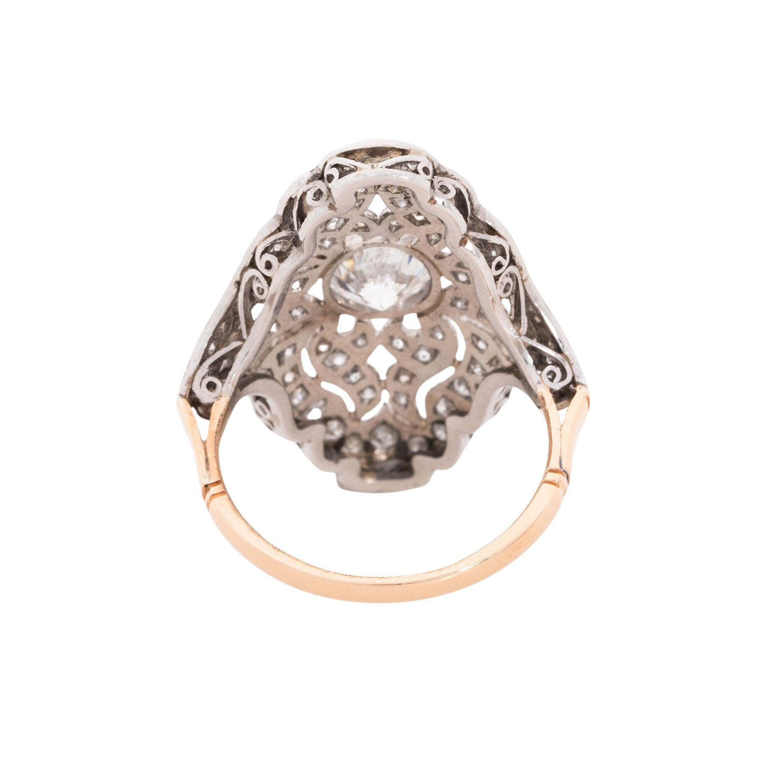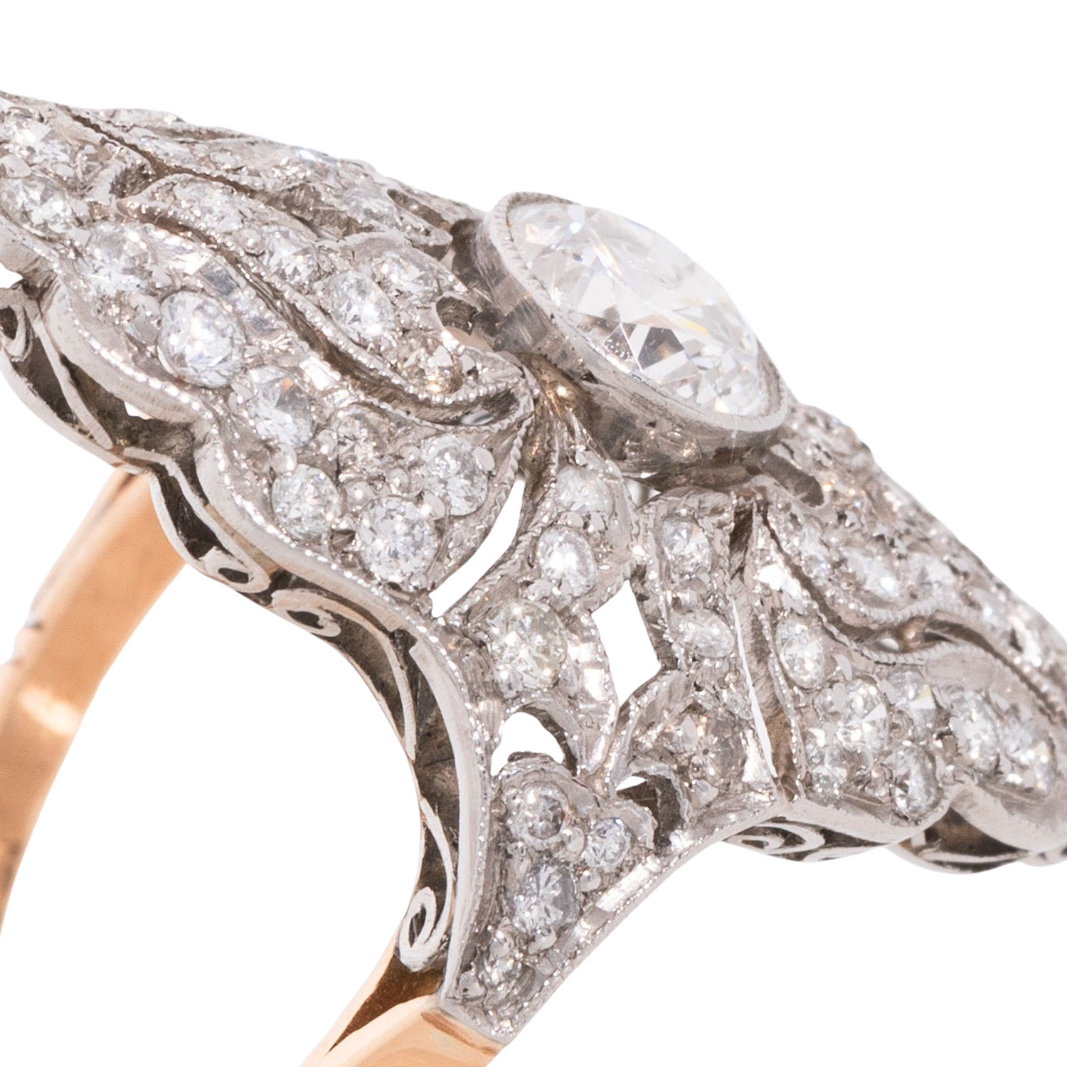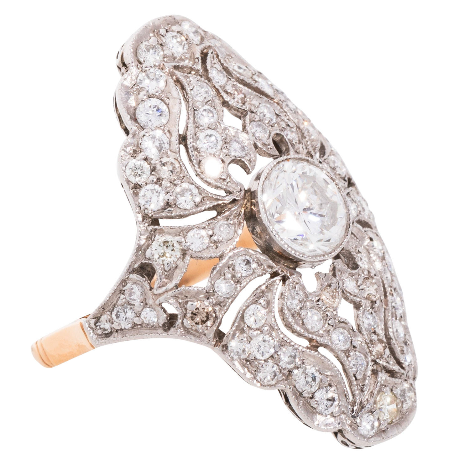 Art Deco Style Ring with brilliant-cut diamond ca. 1,1 ct and other brilliant-cut diamonds totalling ca. 1.3 ct, WHITE-STW (H-J)/SI-P1, YG 18K and platinum, 6.7 g, ring size 53,5, 20th century, good condition.