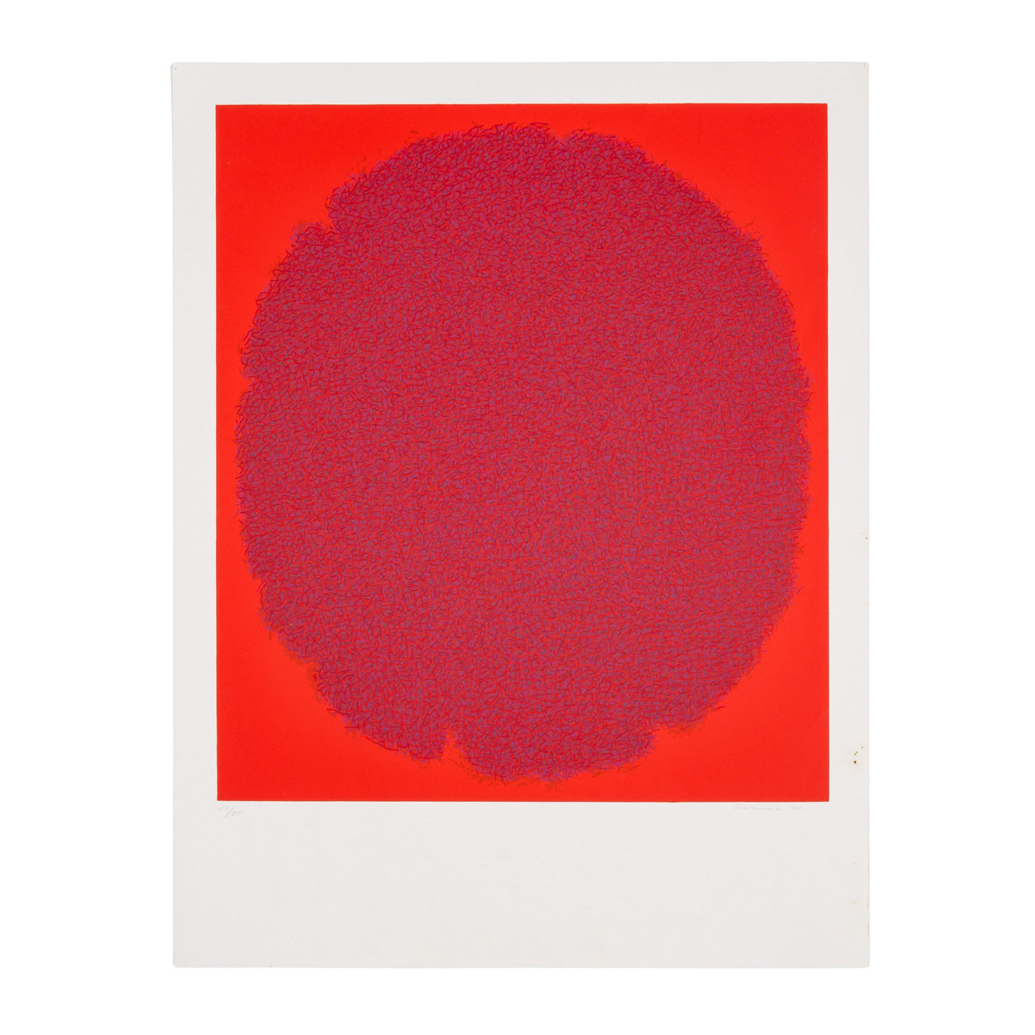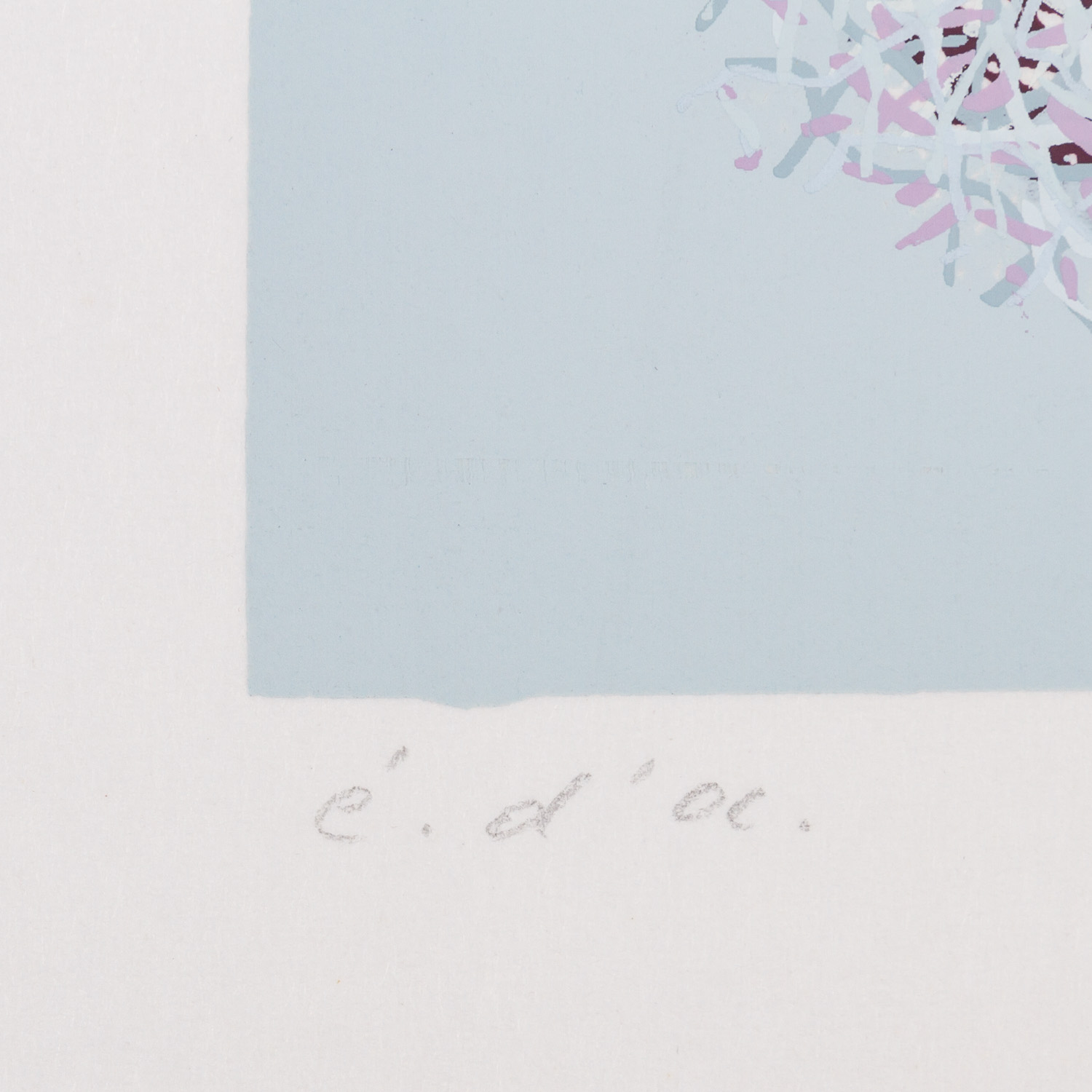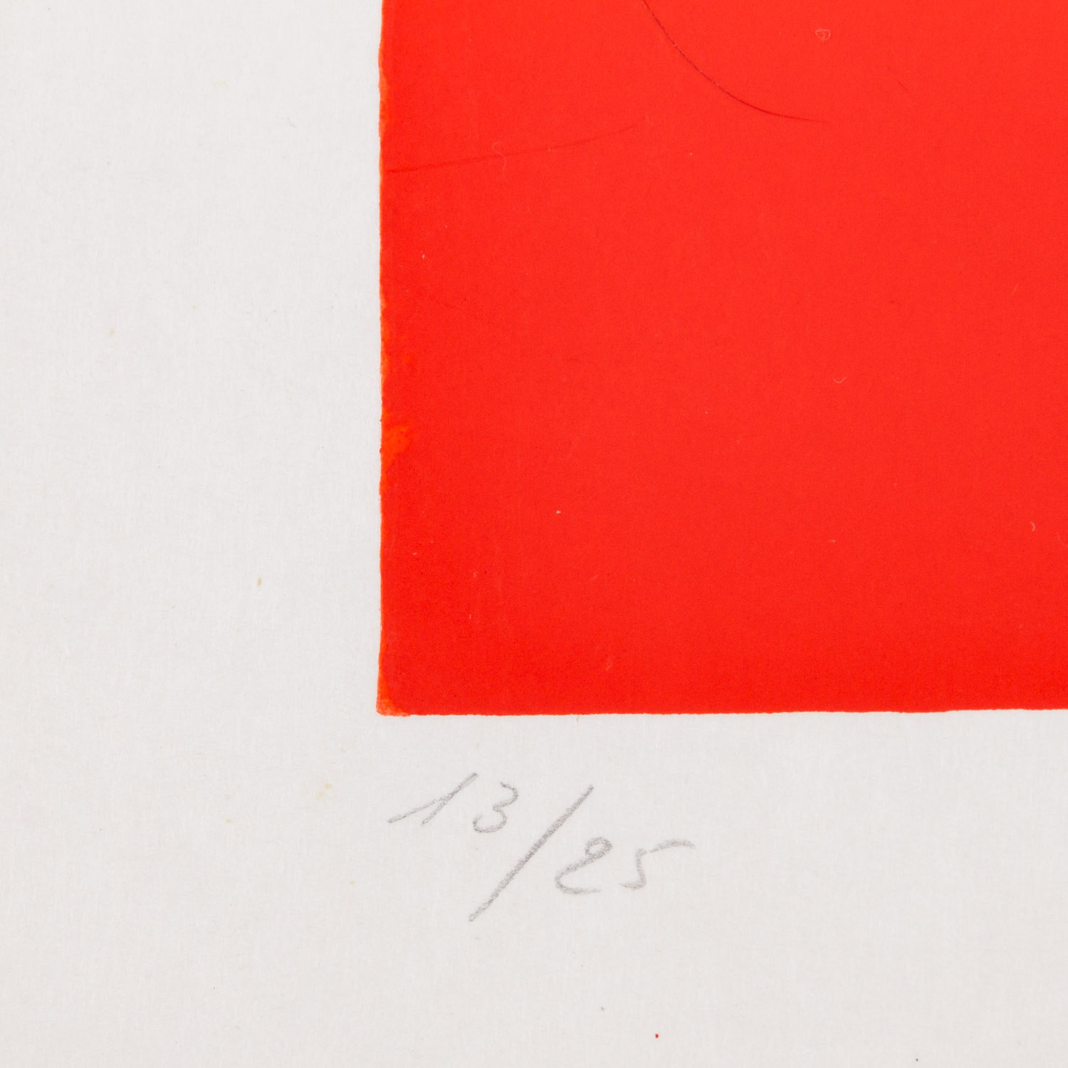 ARTIST 20th century, 2 colour screenprints ‘Abstrakte Komposition’, 1970, 1x in blue tones and 1x in red tones, each indistinctly signed and dated in pencil, 1x indistinctly inscribed ‘e. d. a.’ and numbered 13/25 in pencil, HxW: plate each approx. 50x44 cm, sheet each approx. 65x50 cm. Signs of age and creasing, slightly browned, partially stained, pinholes to corners.