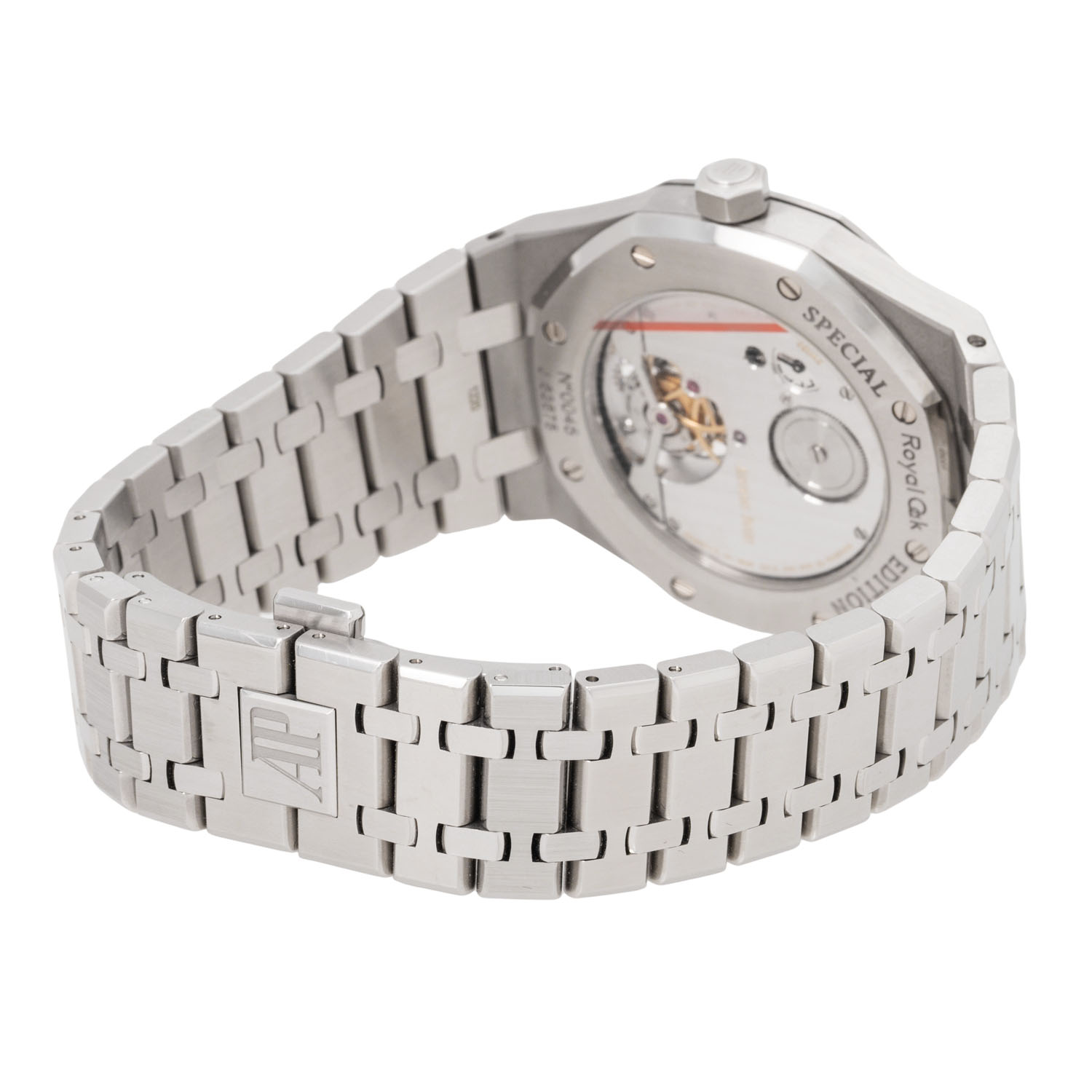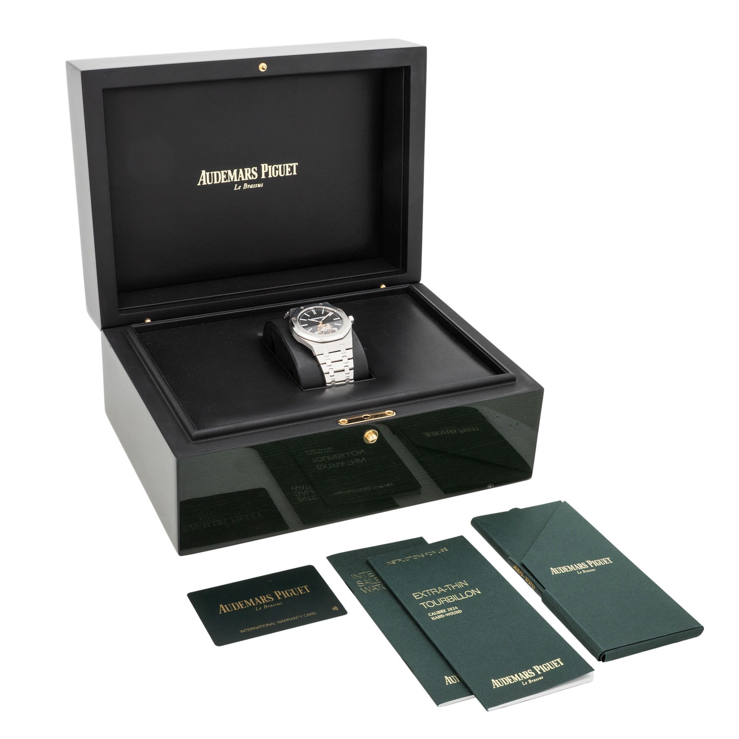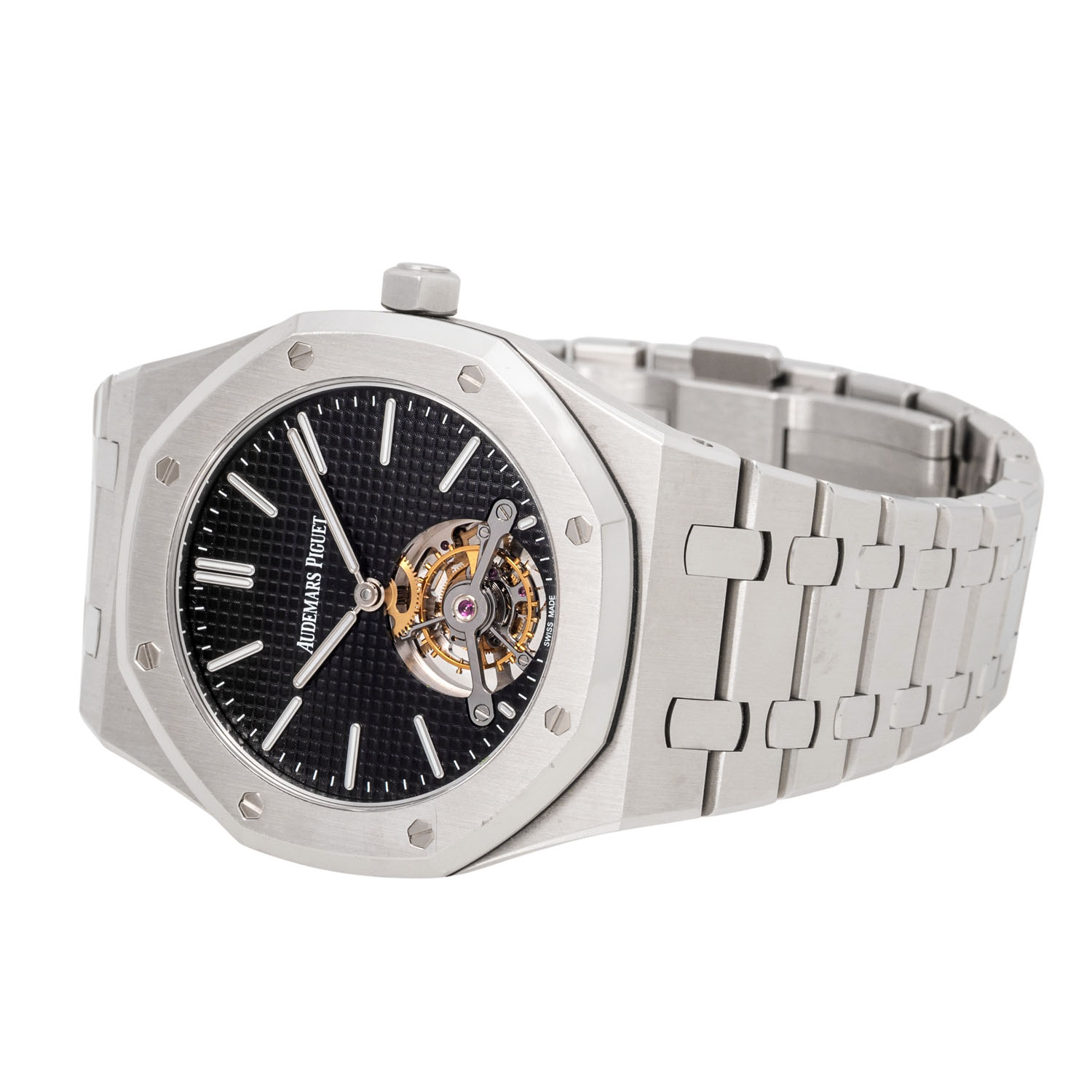 AUDEMARS PIGUET extremely rare 'Royal Oak Extra-Thin Tourbillon' Ref. 26512ST. Box and papers.Stainless steel. Case numbered “No. 0045”, limited Japan Edition of 45 worldwide. Hand-wound cal. 2924 movement with very good performance (+8s/d. 281°), minute tourbillon and power reserve indicator on the back. Black tapisserie dial with visible tourbillon at 6 o'clock. Good, unpolished condition with visible signs of wear on the case and bracelet. Case back with protective film. Original box, guarantee card, guarantee booklet and instructions enclosed. Diameter approx. 41 mm (measured without crown). Fits up to approx. 20.5 cm wrist size.