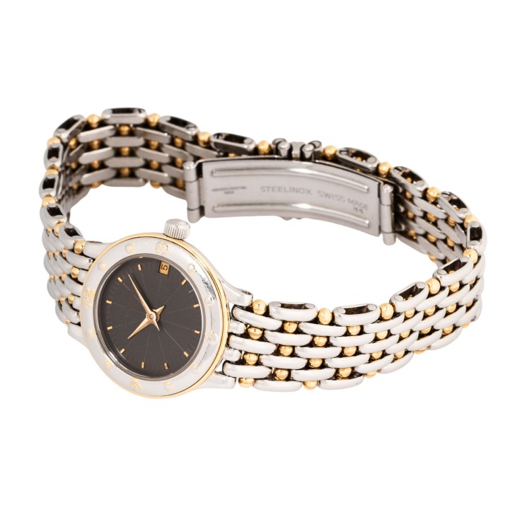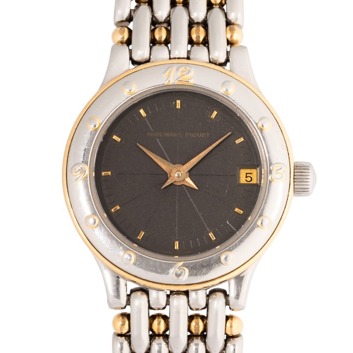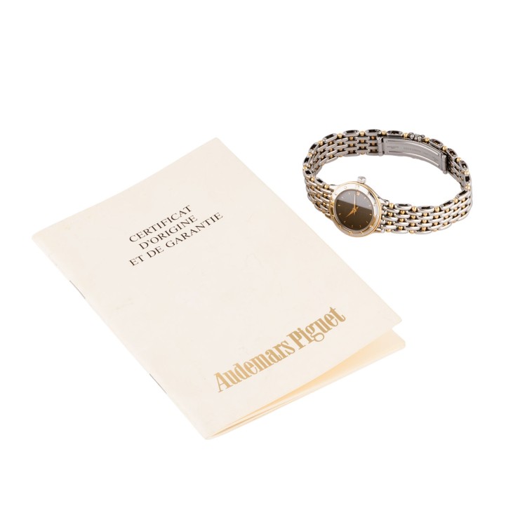 AUDEMARS PIGUET ‘Meridian’ Ref SA66289 Ladies watch from 1989 with papers. Stainless steel / 18K yellow gold. Case number C-49749. Quartz movement in working condition. New battery. Stainless steel / gold bracelet with folding clasp. Anthracite-colored dial with applied indices and date display. Good condition with signs of wear. Warranty booklet and warranty certificate included. Purchased in March 1989 from Gübelin in Switzerland. Diameter approx. 22.5 mm without crown. Suitable for wrist sizes up to approx. 17,5 cm.
