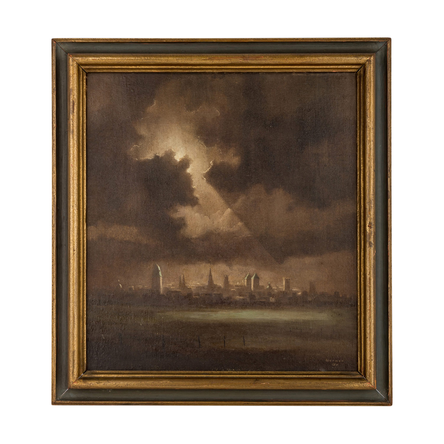 AX, WERNER (painter 20th century), ""Panorama der Stadt Münster in Gewitterstimmung"", signed lower right, oil/canvas mounted on cardboard, HxW: approx. 56x51 cm (67x62 cm with frame). Traces of rubbing to the edge. With frame. Traces of age.