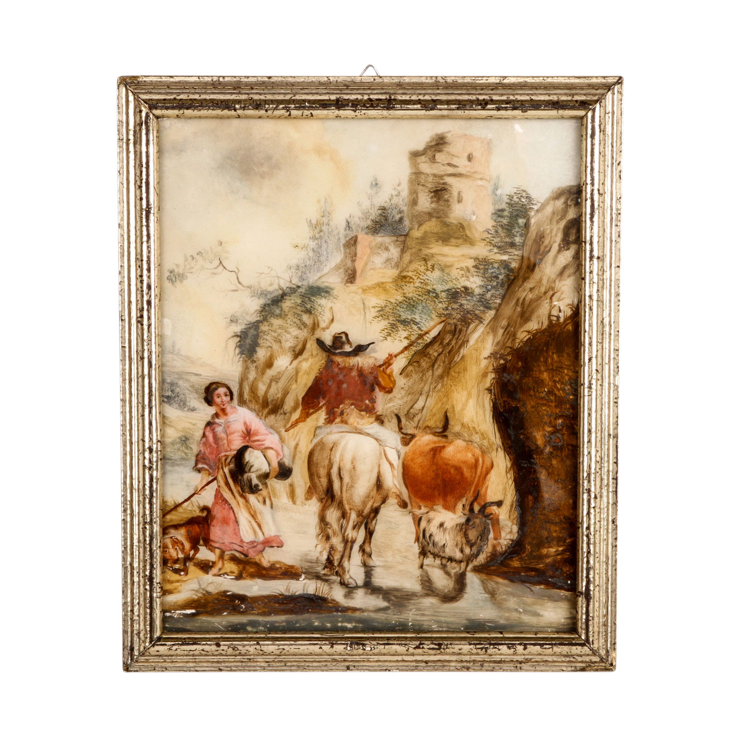 BACKGLASS PAINTING Augsburg 18th/19th century, "Hirten am Fluss", shepherdess with dog and a shepherd on horseback leading their animals through the shallow water at the edge of a rock with castle ruins, unsigned, painting behind glass (backed with cardboard), HxW: 25x20.5 cm (28x23.5 cm with frame). Min paint loss/loss. With frame. Signs of age.