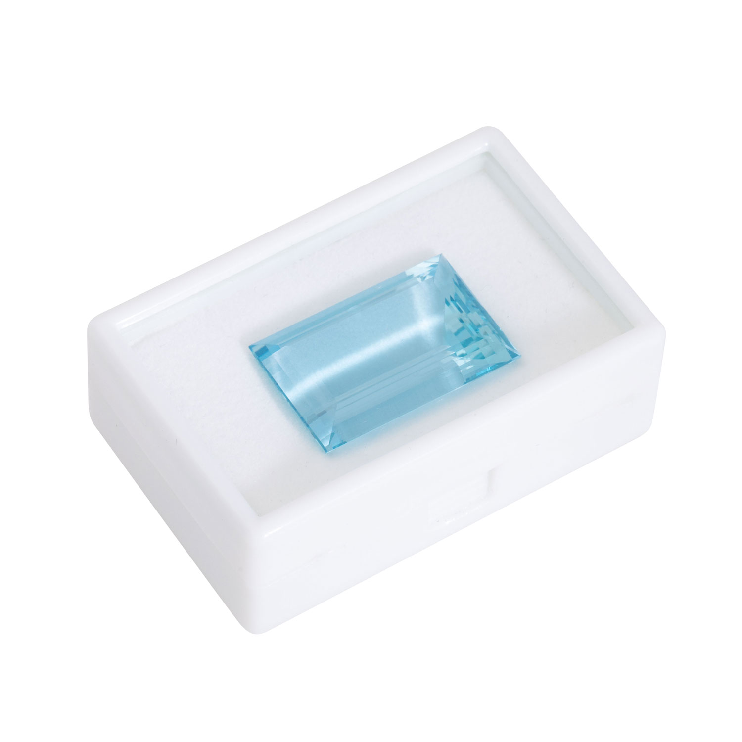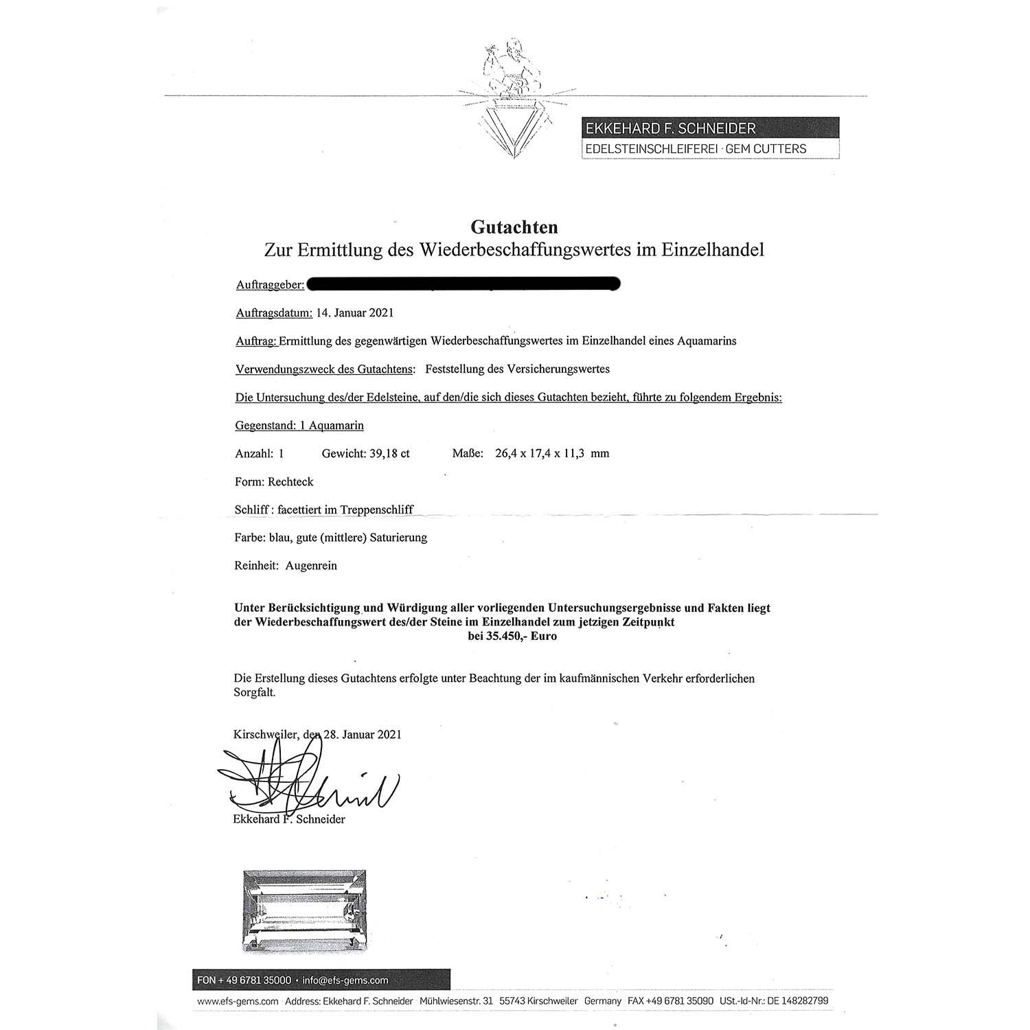 Baguette-cut aquamarine from 39.18 ct, measurements approx 26.4 x 17.4 x 11.3 mm, replacement value according report (2021) approx €35.450.-, very good color and cut proportions, mint condition, copy appraisal of replacement value (2021) enclosed.