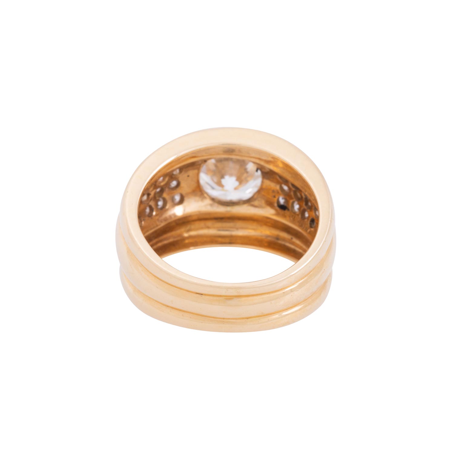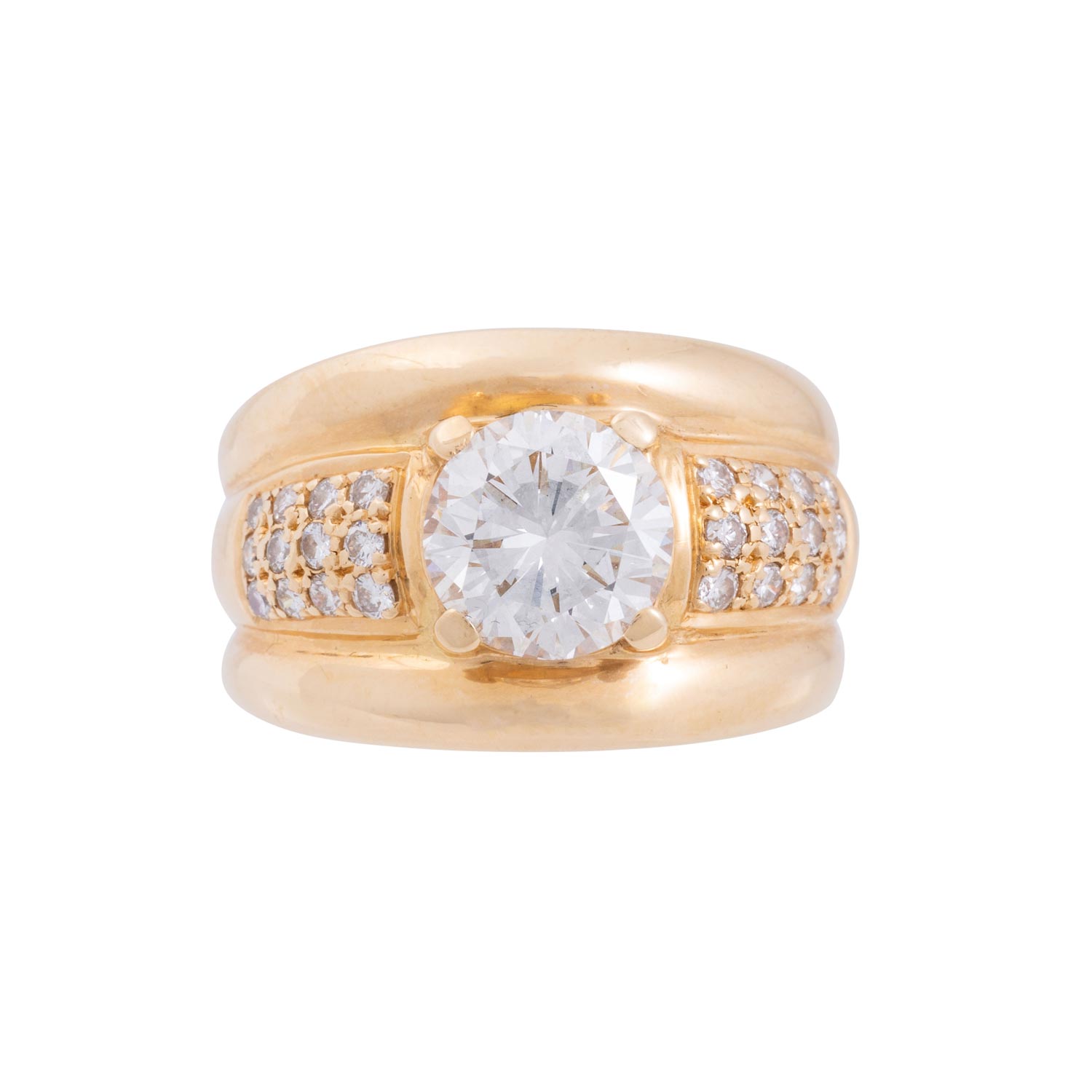 Ring centred with brilliant-cut diamond ca. 2.1 ct, STW (I) /SI1, no fluorescence, facet edges min. abraded, further 24 brilliant-cut diamonds totalling ca. 0.4 ct, ca. WHITE (H) /SI-PI, 18K yellow gold, 10.6 g, ring size 53, 21st century, minor signs of wear, DPL certificate TW 029 of 03/2022 enclosed.