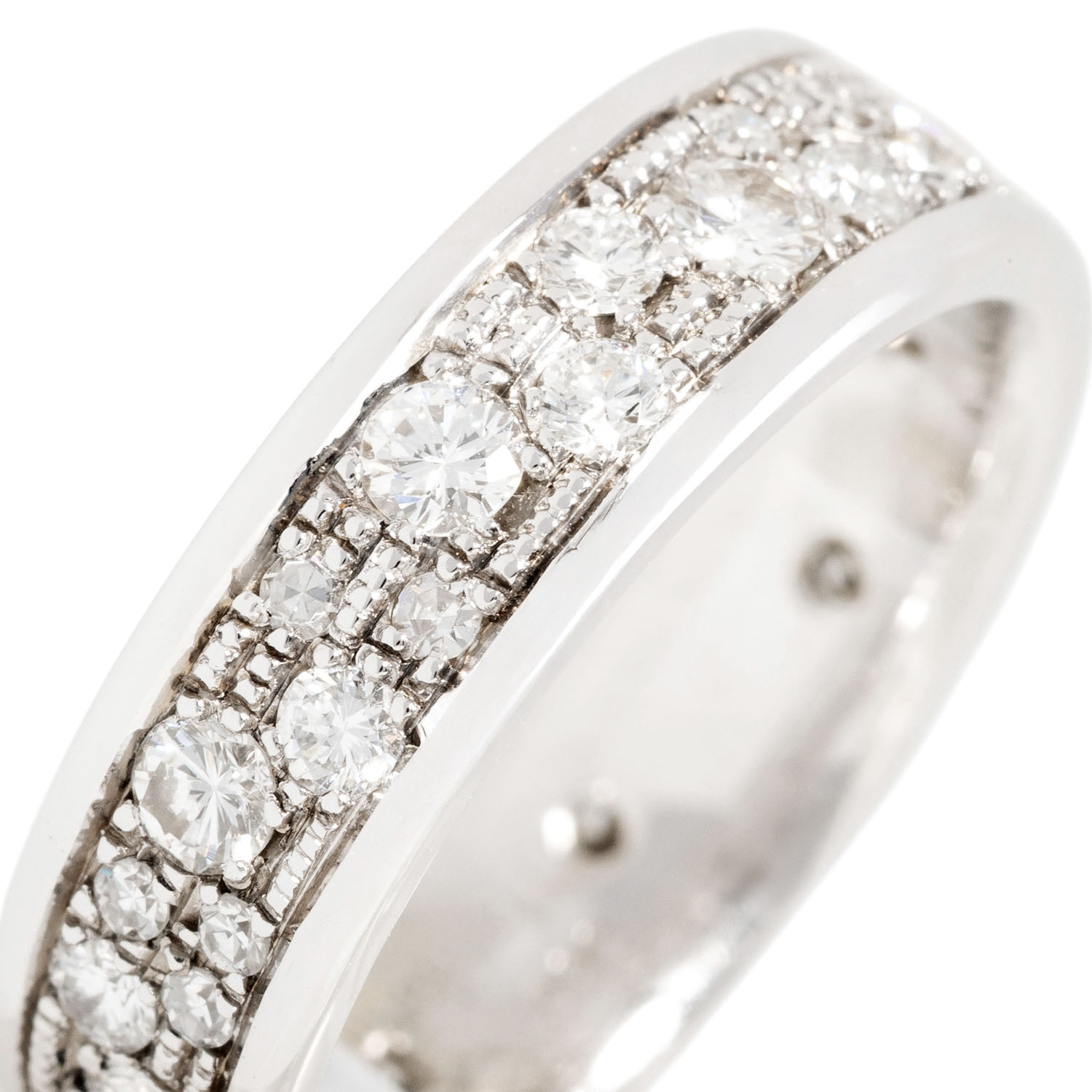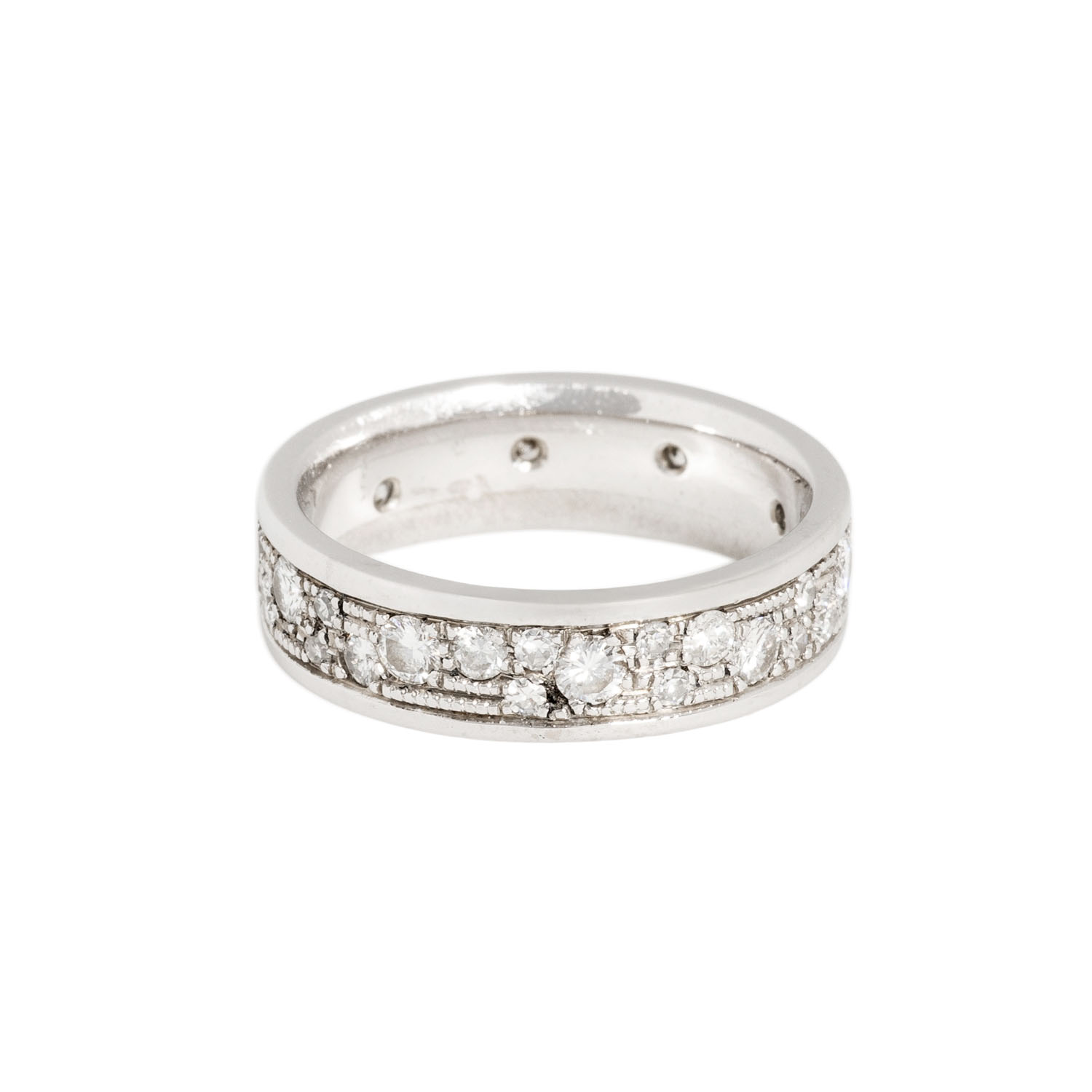 Band ring with 21 brilliant cut diamonds, totalling 1.2 ct (engraved), 21 single cut diamonds, totalling ap. 0.23 ct, good colour and clarity, WG 14K, 5.6 g, RW: 55, late 20th century, minimal signs of wear.