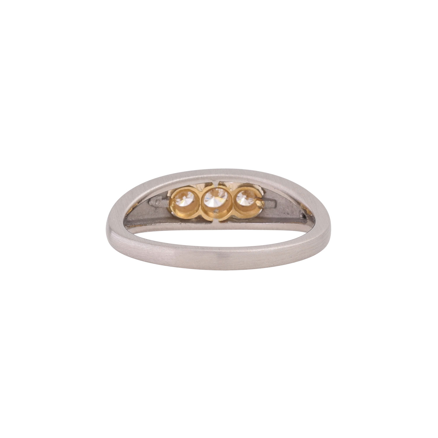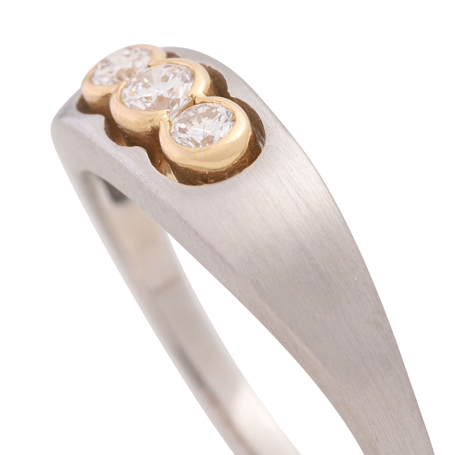 Band ring with 3 brilliants totalling ca. 0.28 ct, central brilliant ca. 0.10 ct, RW-WHITE (G-H)/VS, platinum/yellow gold, 5.9 g, satin finish, ring size: 53, weight: 2-5,8 mm, 20./21 . century, minor signs of wear, hallmark.