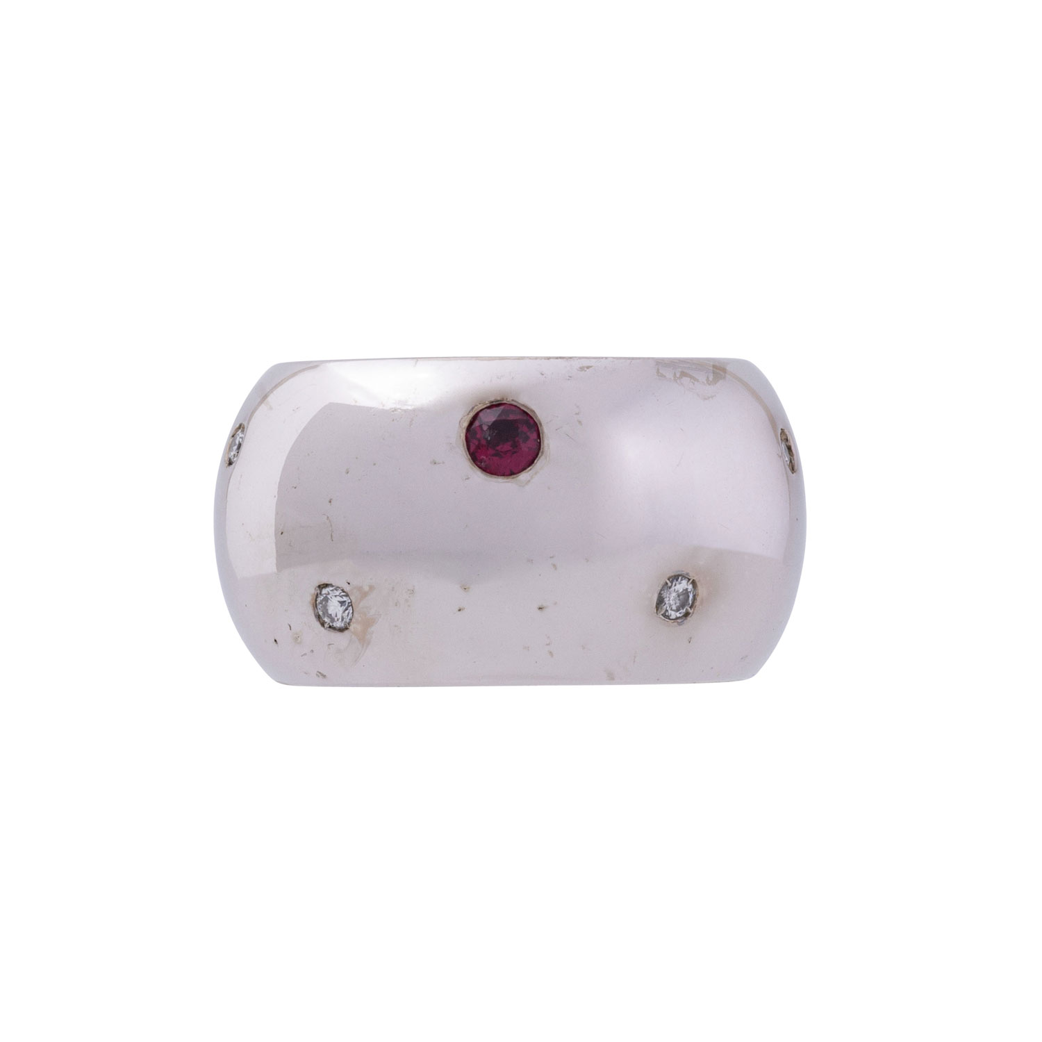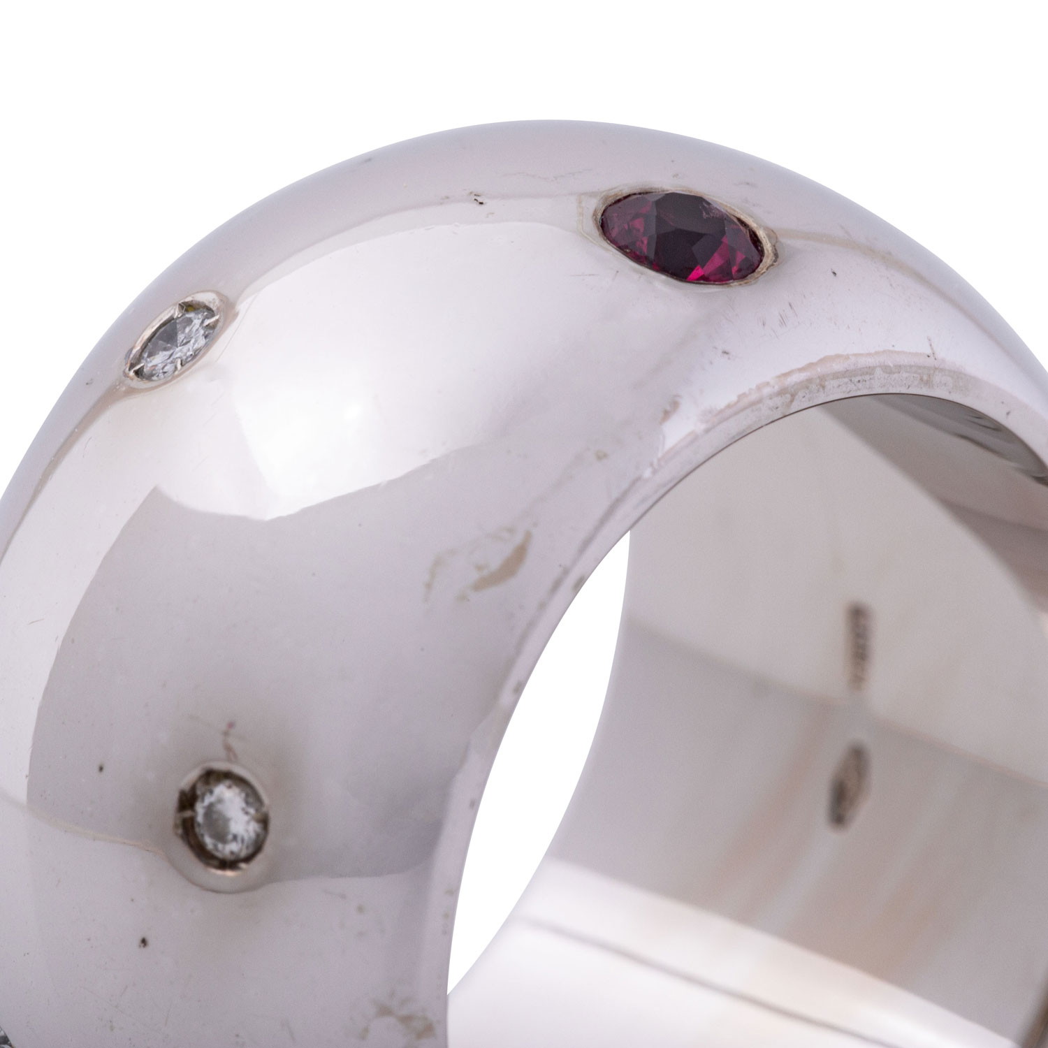 Band ring with 9 brilliant cut diamonds, totalling ca. 0.25 ct, good colour and clarity, 1 ruby, round faceted, chipped, D: ca. 3 mm, 18K white gold, 13.7 g, ring size 55, W: 13 mm, late 20th century, minimal signs of wear.
