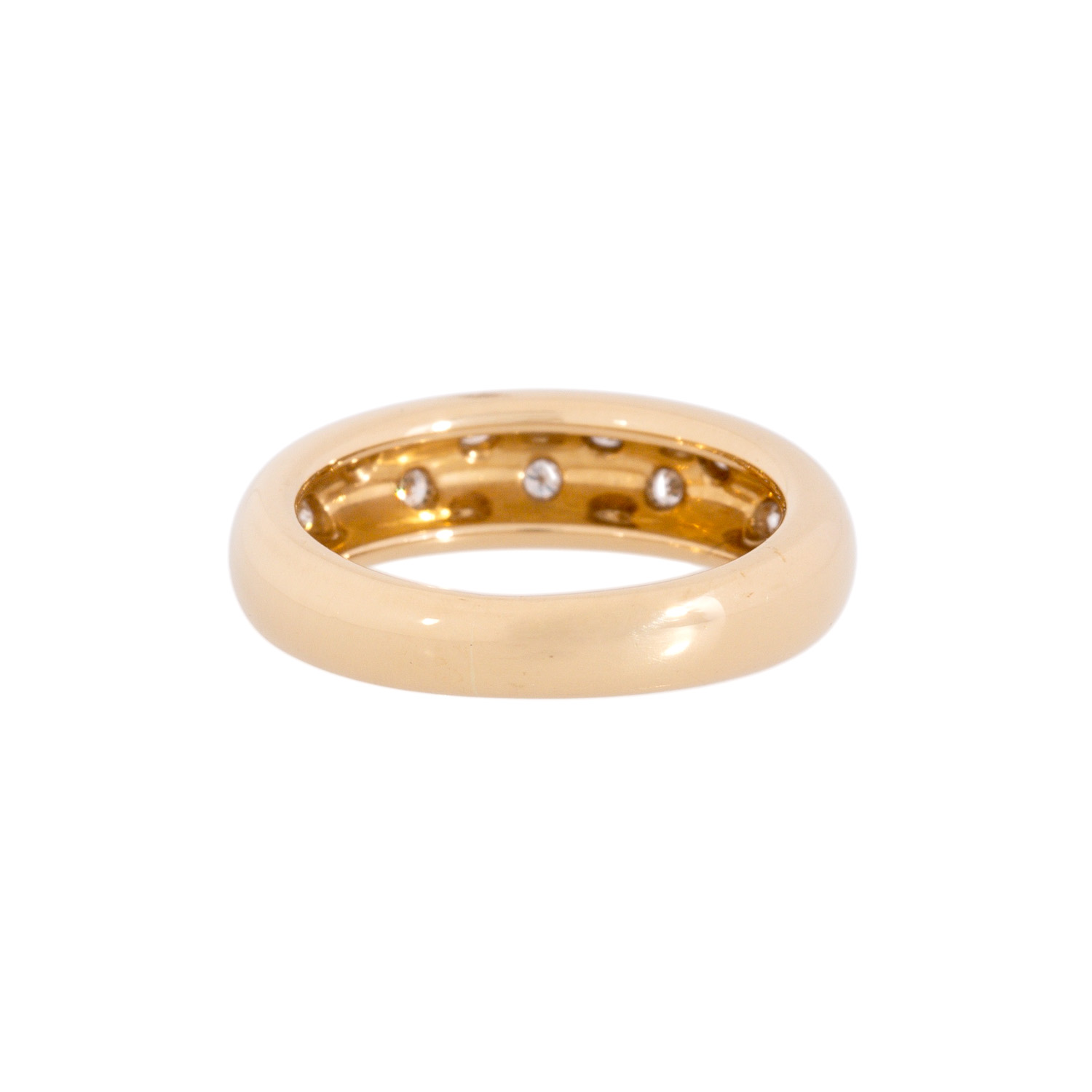 Band ring with 9 brilliant-cut diamonds totalling approx. 0.10 ct, WHITE (H)/SI, 18K yellow gold, 6.3 g, ring size: 50, W: approx. 3.6 - 5.5 mm, 20th/21st century, signs of wear, with hallmark.
