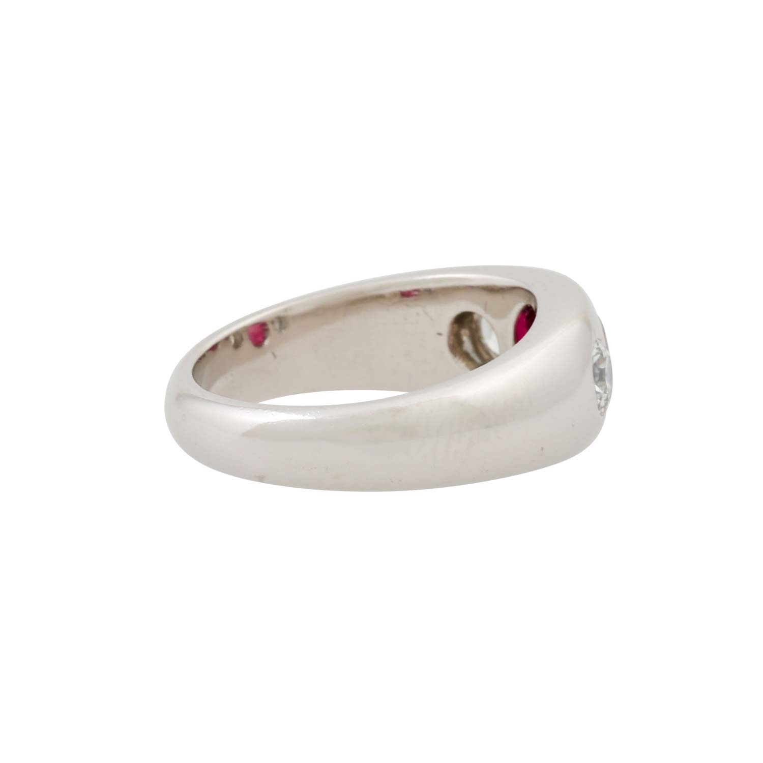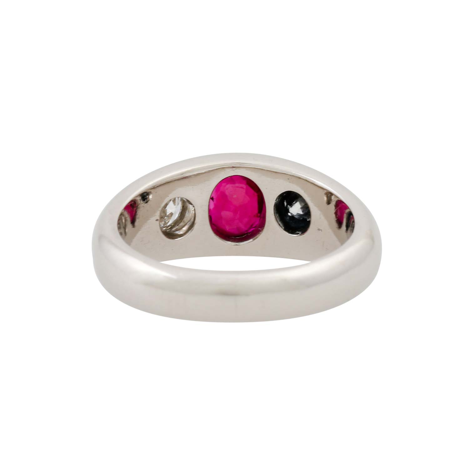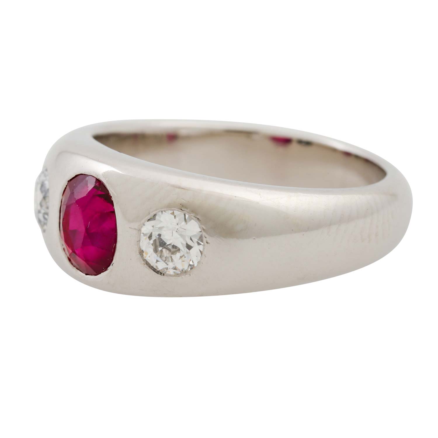 Ring with ruby on the seid 2 old-european-cut diamonds totalling ca. 0,37 ct H/SI, platinum, 11.7 g, ring size 51, late 20. Jh., minor signs of wear, handcrafted.