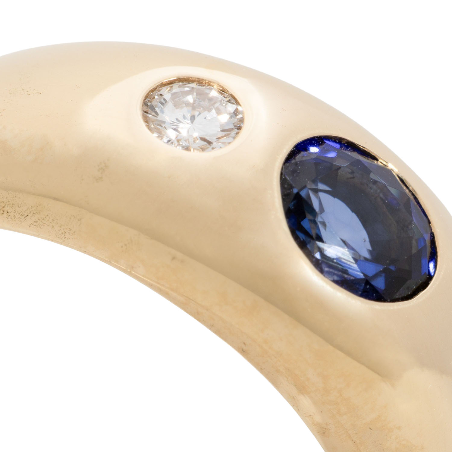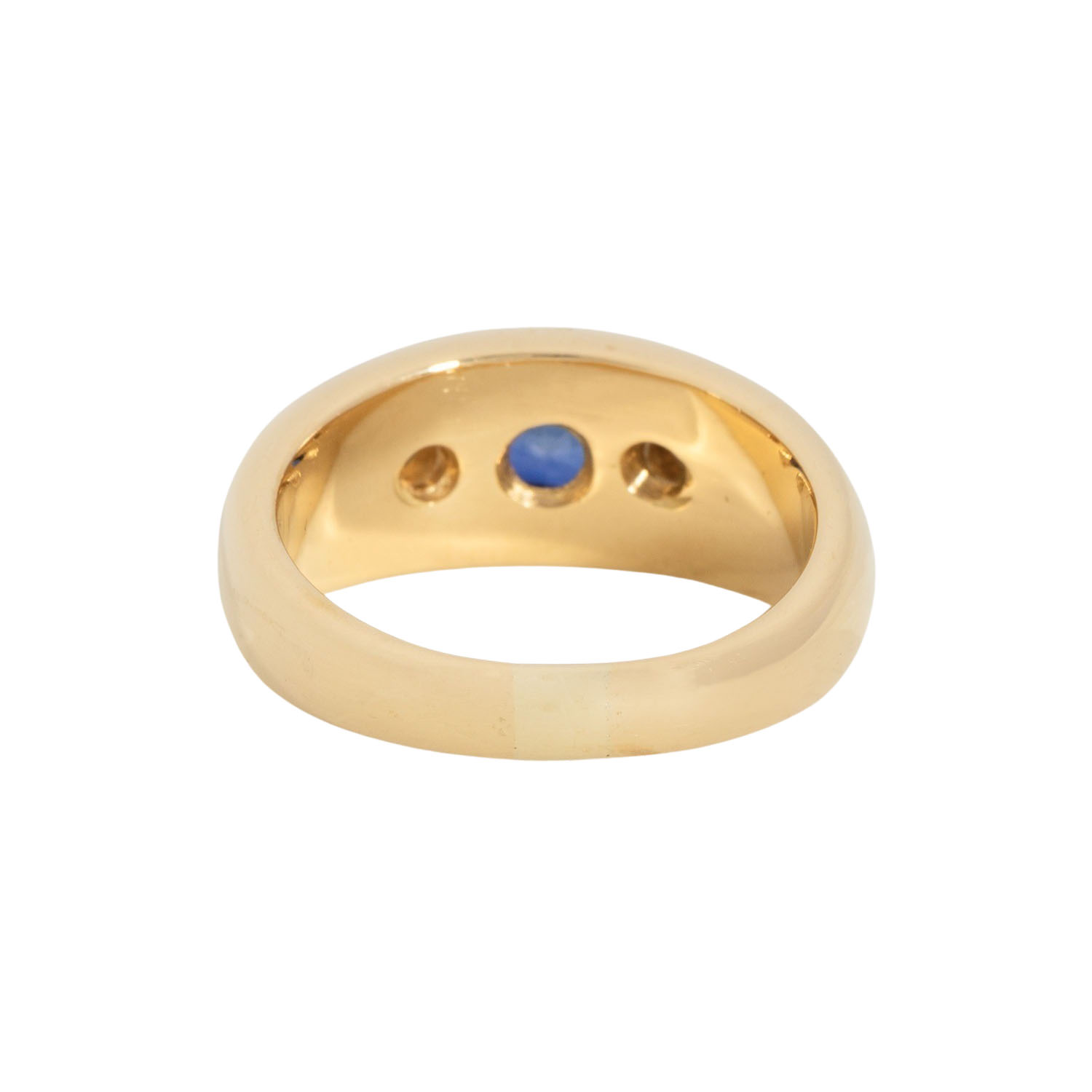 Band ring with sapphire, round faceted, ap. 5.1 mm, 2 brilliant cut diamonds, totalling ap. 0.24 ct, WHITE (H)/VS, 18K yellow gold, 11 g, ring size 54, 2nd half of 20th century, minor signs of wear.