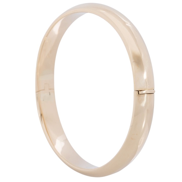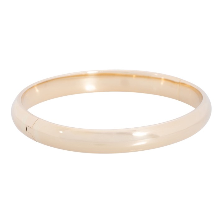 Bangle of 14K yellow gold, 11.5 g, inner circumference 17.5 cm, W: 8 mm, 20th/21st century, signs of wear, slightly dent.