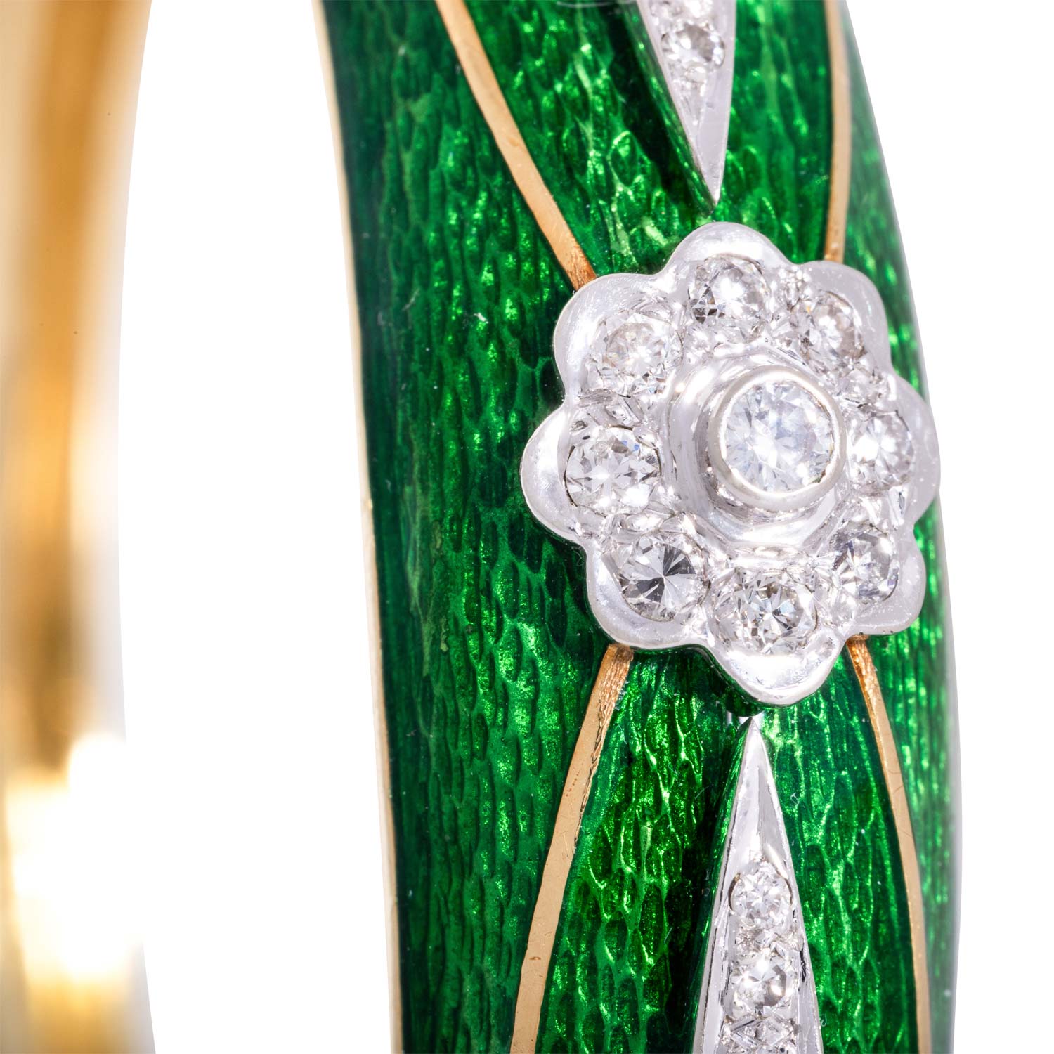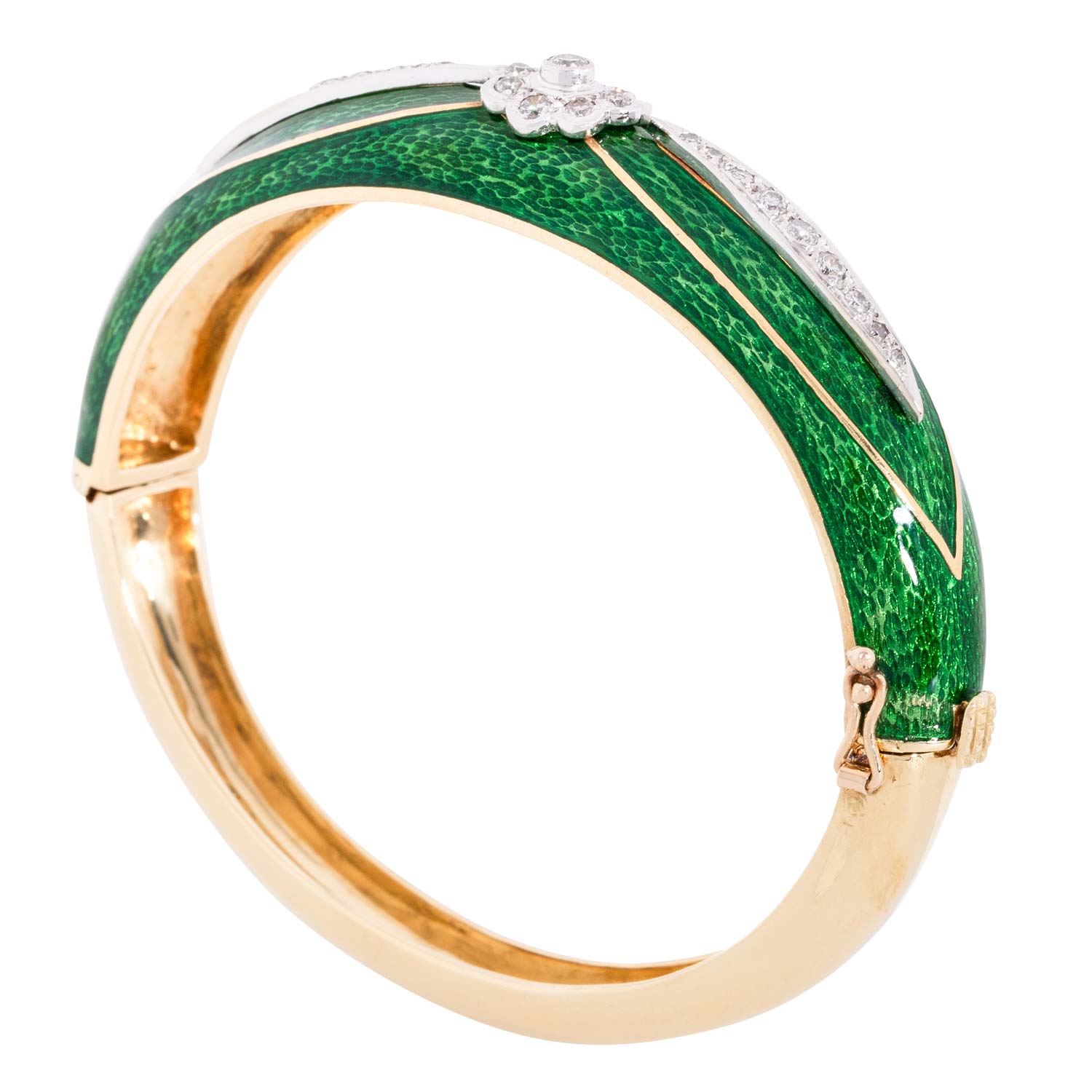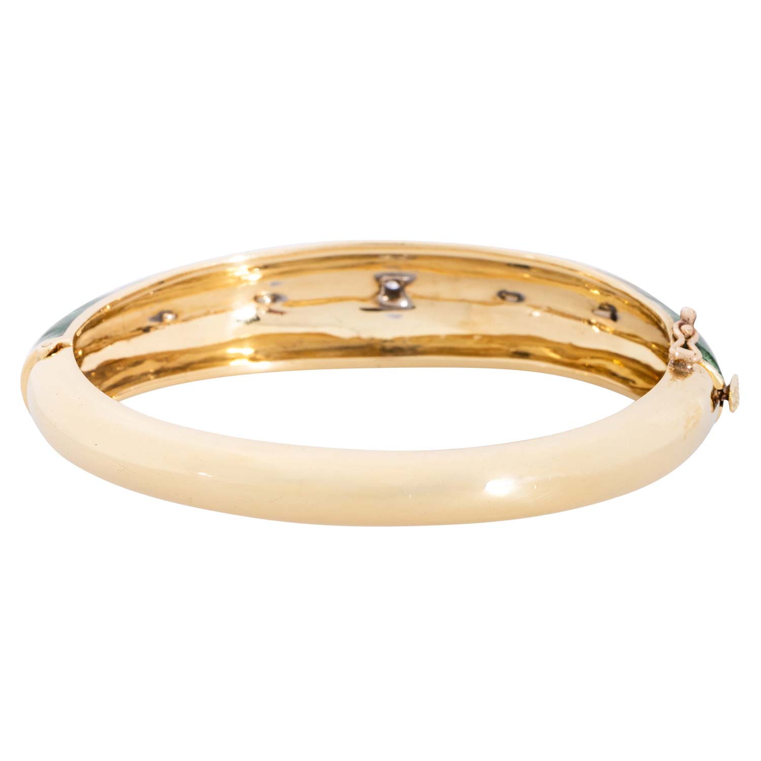 Bracelet with 27 brilliant cut diamonds, totalling ca. 0.7 ct, good colour and medium clarity, green transparent email on structured background, small chip near clasp, 18K yellow gold, 43.6 g, inner circumference 16.7 cm, box clasp with security catch, 2nd half of 20th century, minor signs of wear.